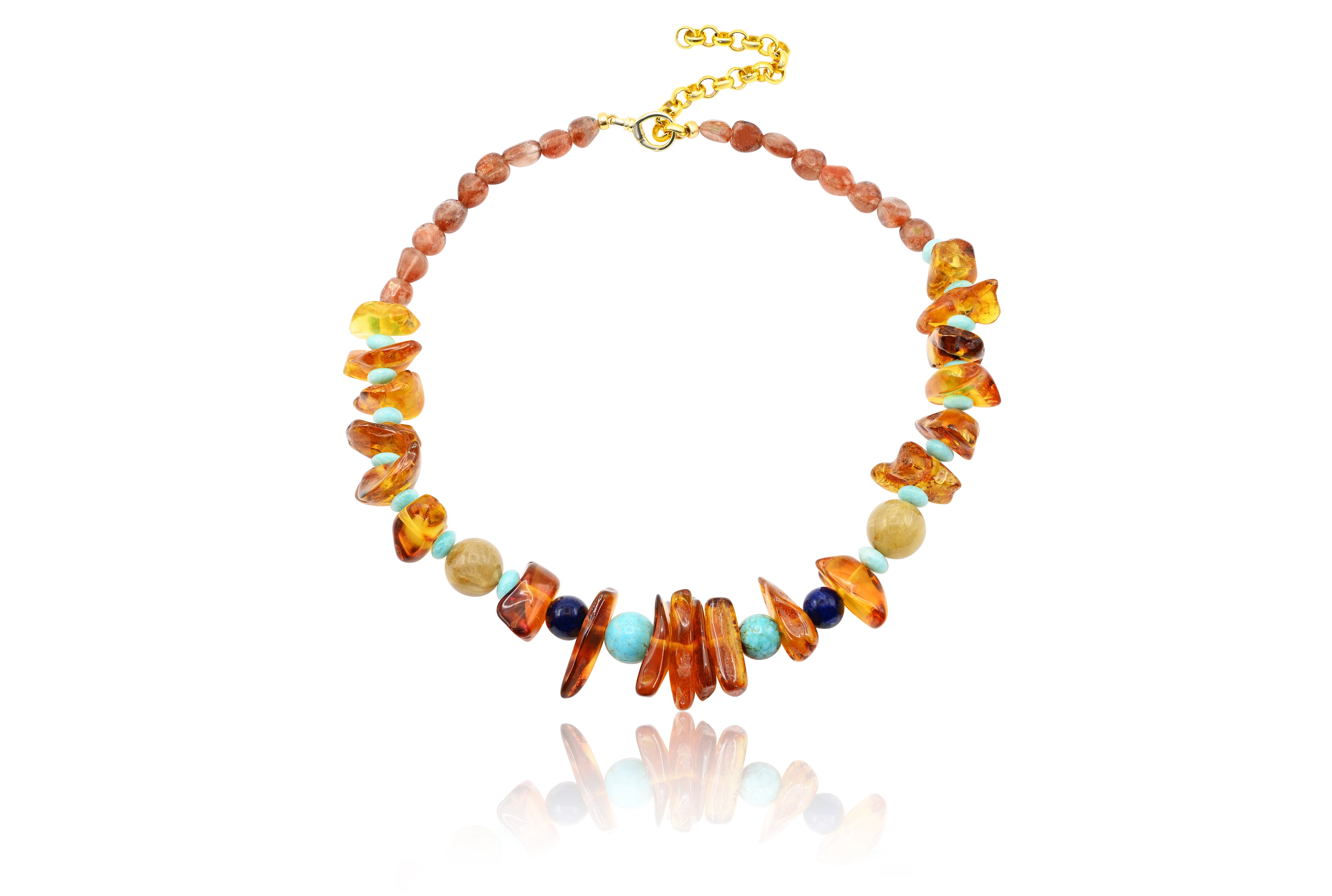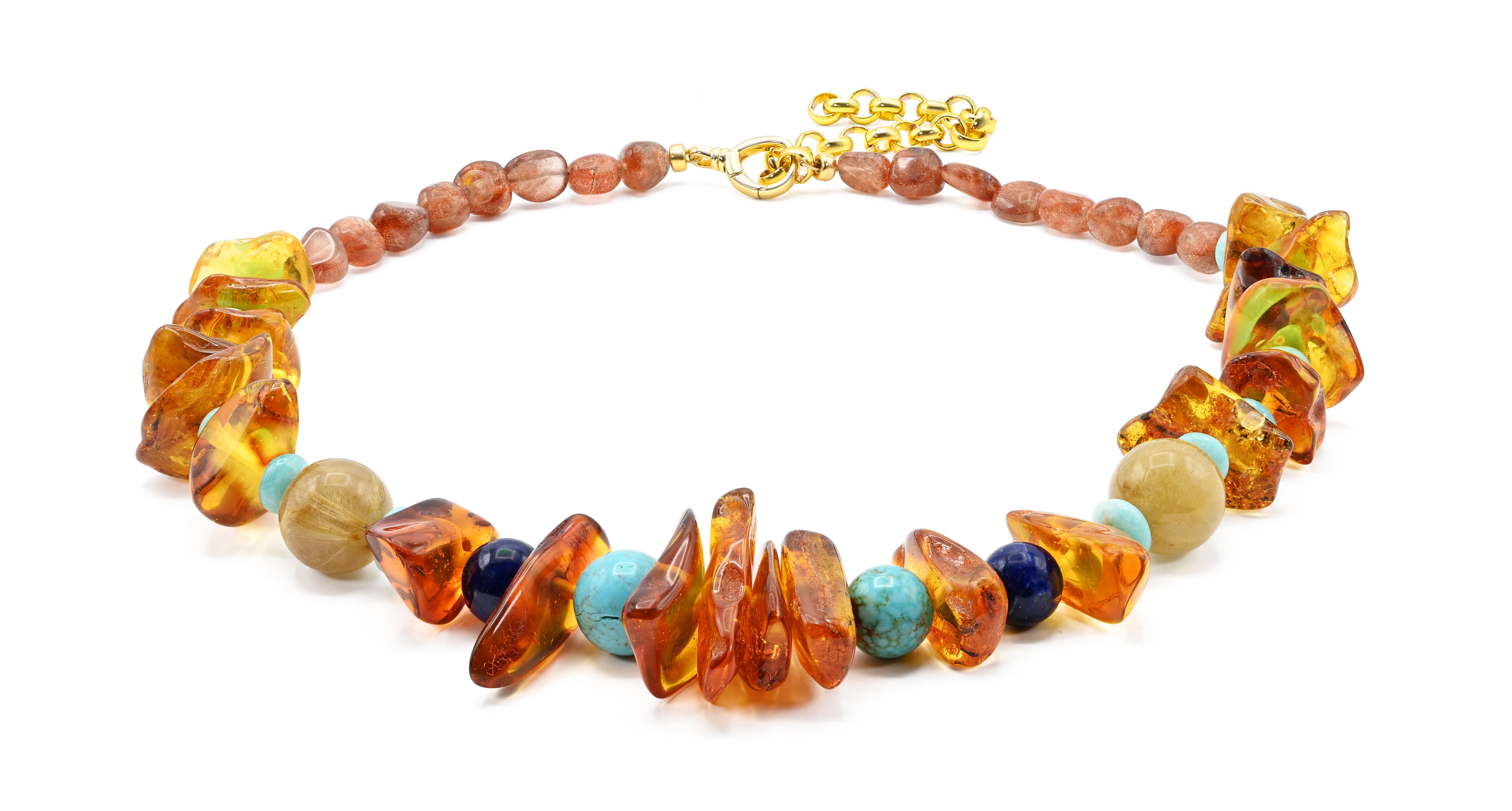 Large Amber, Rutilated Quartz, Lapis Luzili, Sunstone and Turquoise.