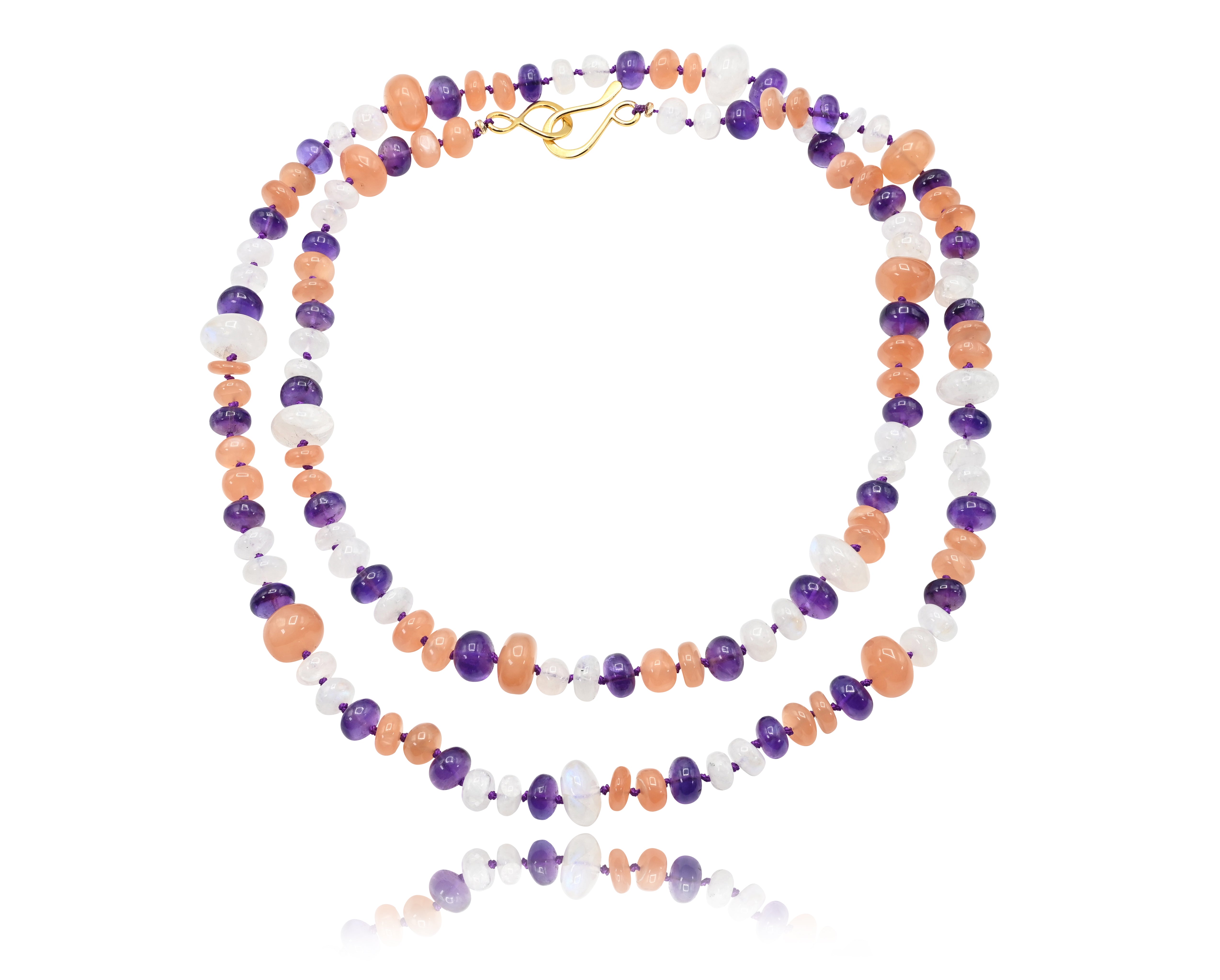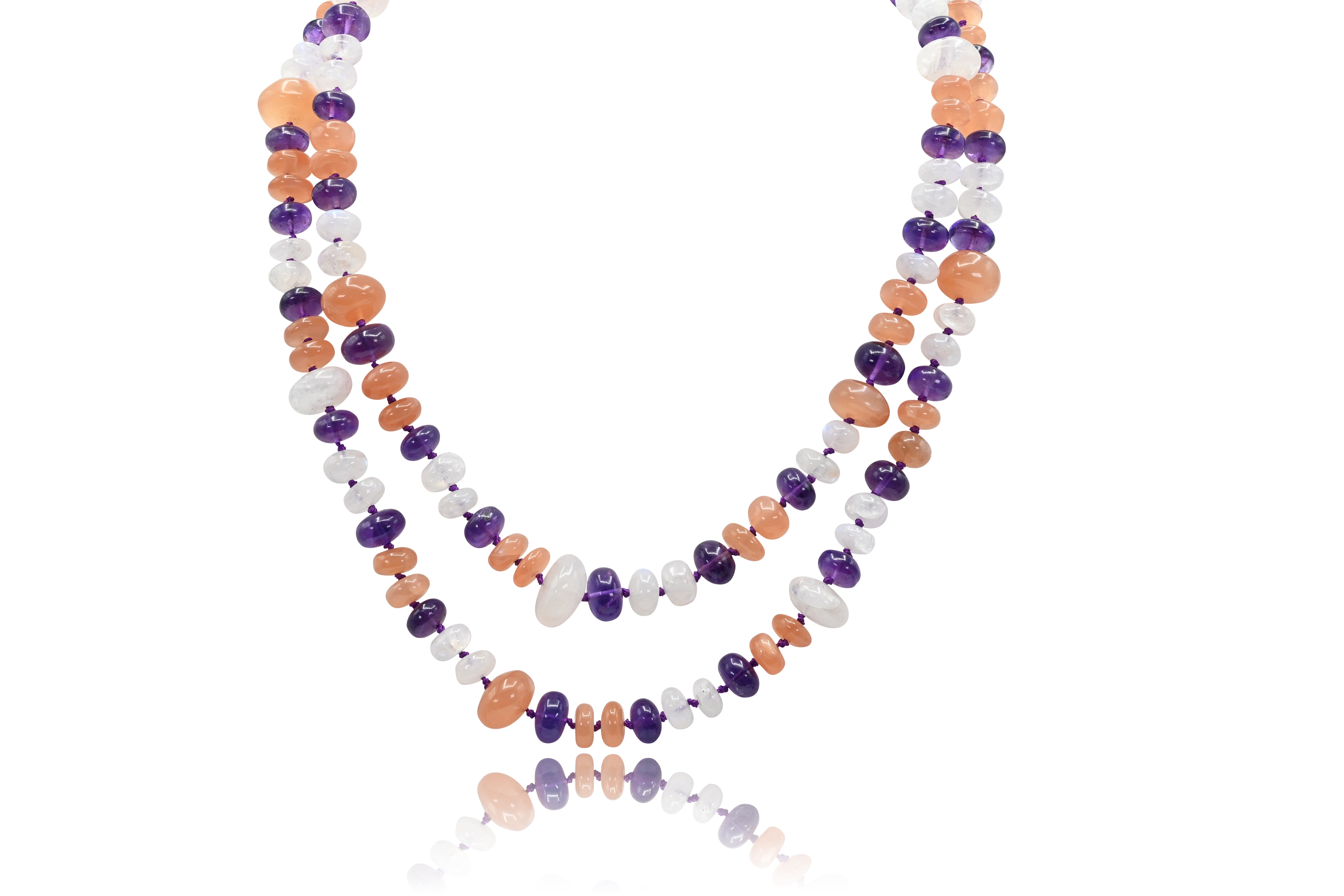 A handmade Amethyst Moonstone long necklace is a stunning piece of jewelry that combines the enchanting allure of two distinct gemstones. Amethyst, known for its deep violet hue, is often associated with calming energy and spiritual growth. Moonstone, with its ethereal, opalescent glow, is believed to enhance intuition and bring about emotional balance. When crafted into a long necklace, these stones create a visually captivating accessory that drapes elegantly around the neck, adding a touch of sophistication and mystique to any outfit. The craftsmanship involved in making such a necklace ensures that each piece is unique, reflecting the artisan's dedication to quality and artistry. Whether worn as a statement piece or a daily adornment, a handmade Amethyst Moonstone long necklace is not only a beautiful addition to your jewelry collection but also a meaningful one, imbued with the natural energies of the earth.