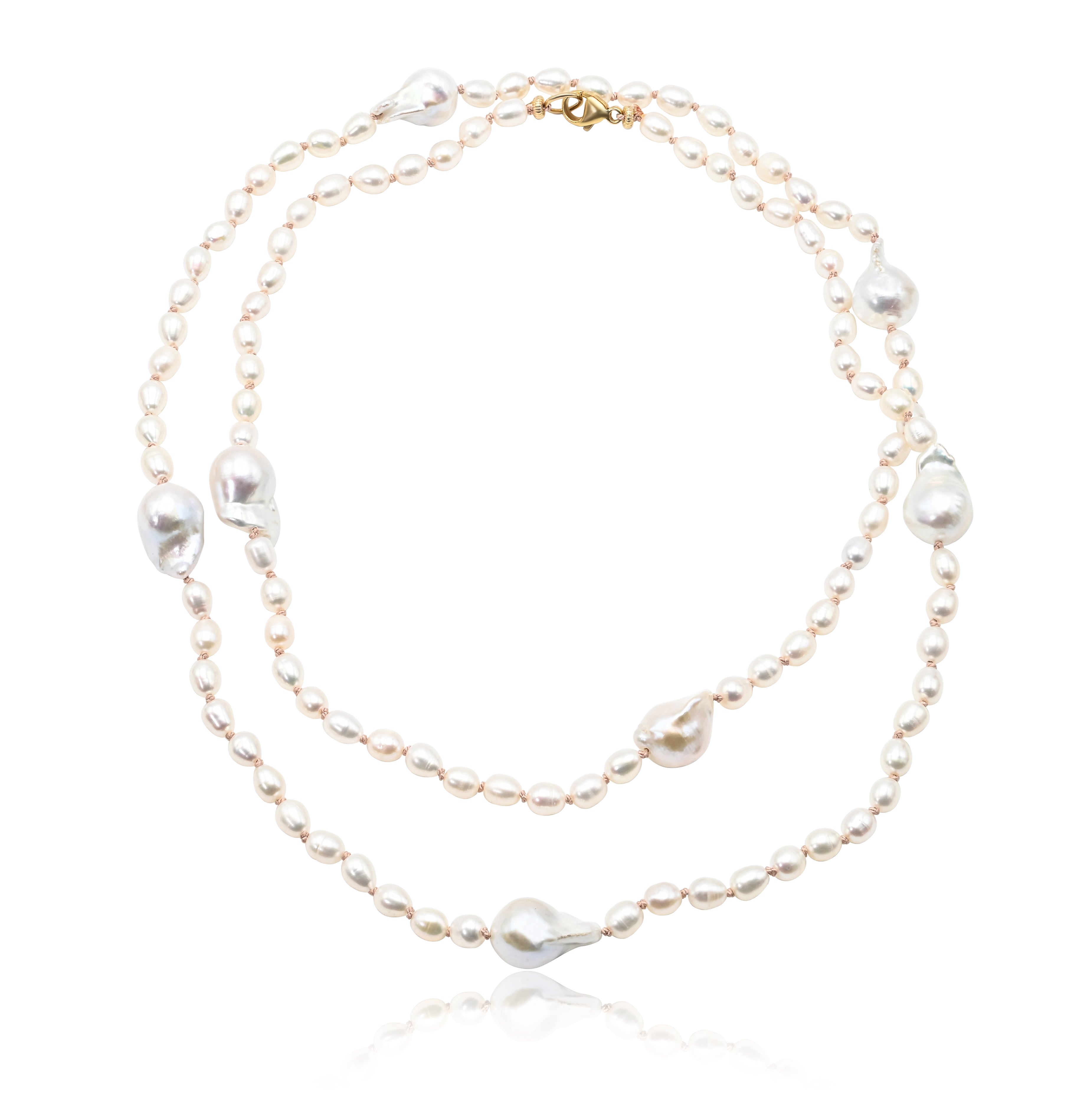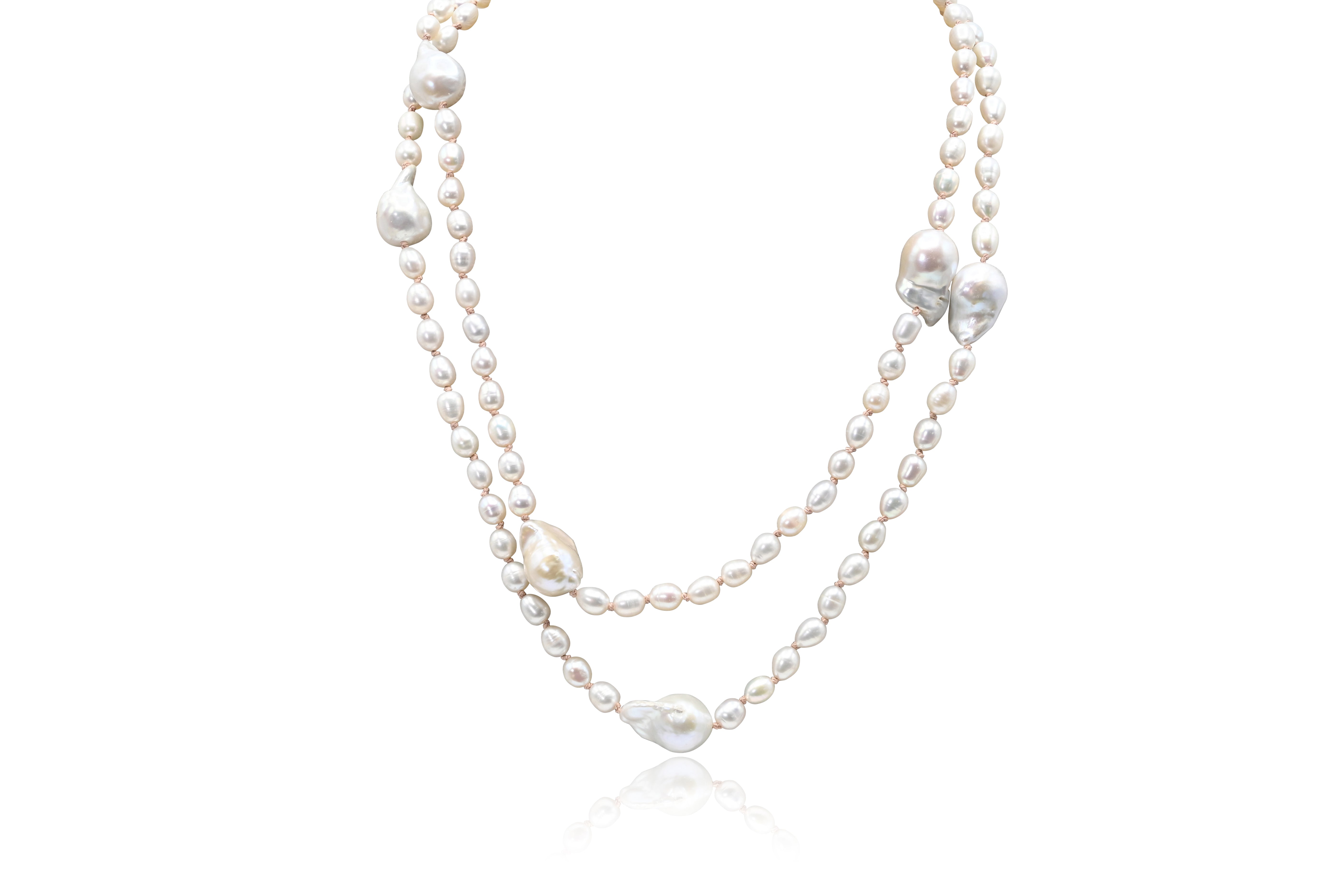 A handmade Baroque freshwater pearl long necklace is a timeless piece of jewelry that effortlessly combines elegance with a touch of organic charm. Baroque pearls, known for their unique, irregular shapes, add a distinct and artistic flair to any accessory. Each pearl in the necklace is meticulously selected and strung together to create a harmonious blend of natural beauty and sophisticated design. The length of the necklace allows for versatile styling options, whether worn as a single long strand or doubled up for a layered look. Ideal for special occasions or as a statement piece in everyday wear, this necklace is a testament to the unparalleled allure of handcrafted jewelry and the captivating beauty of nature's imperfections.