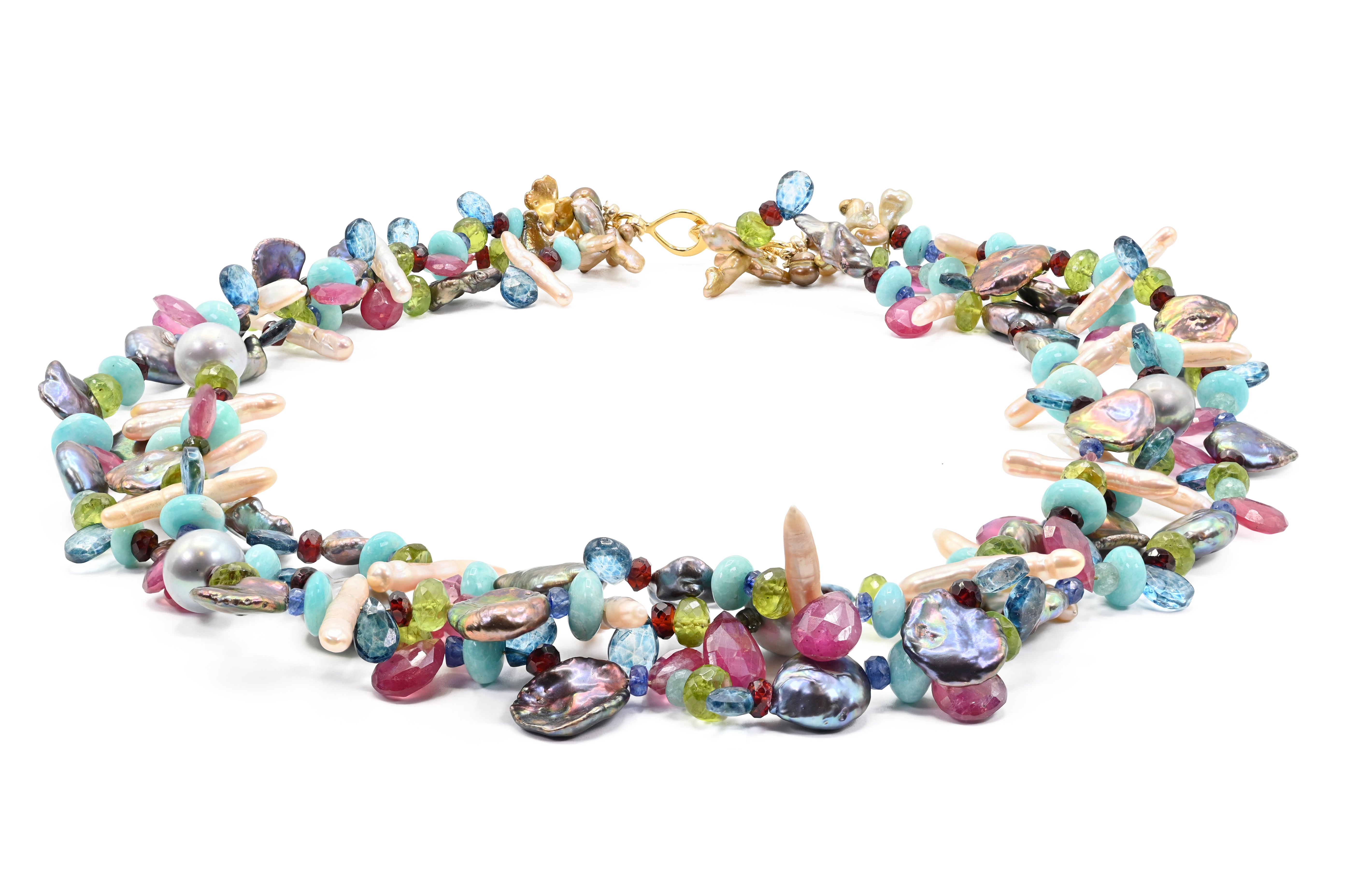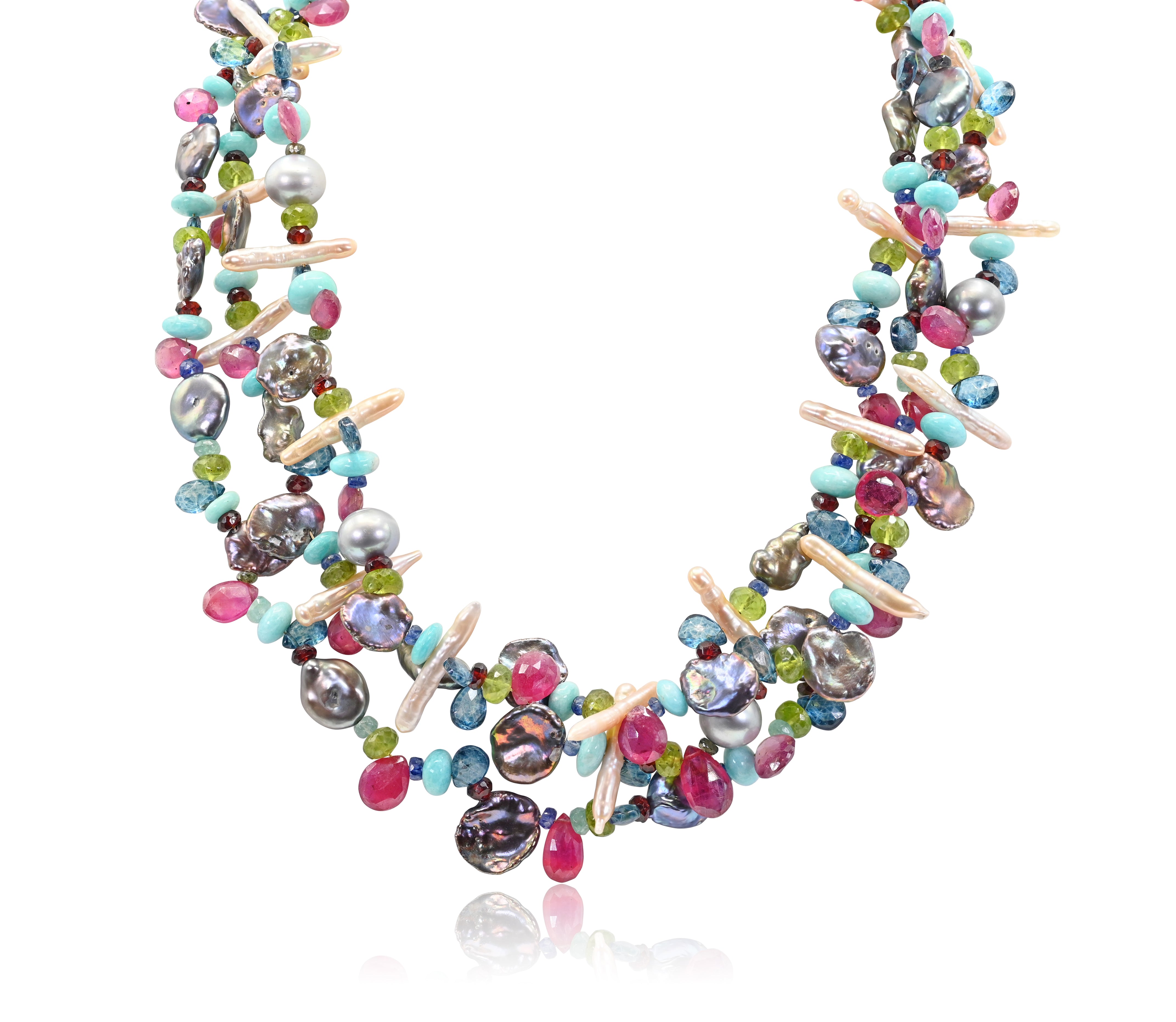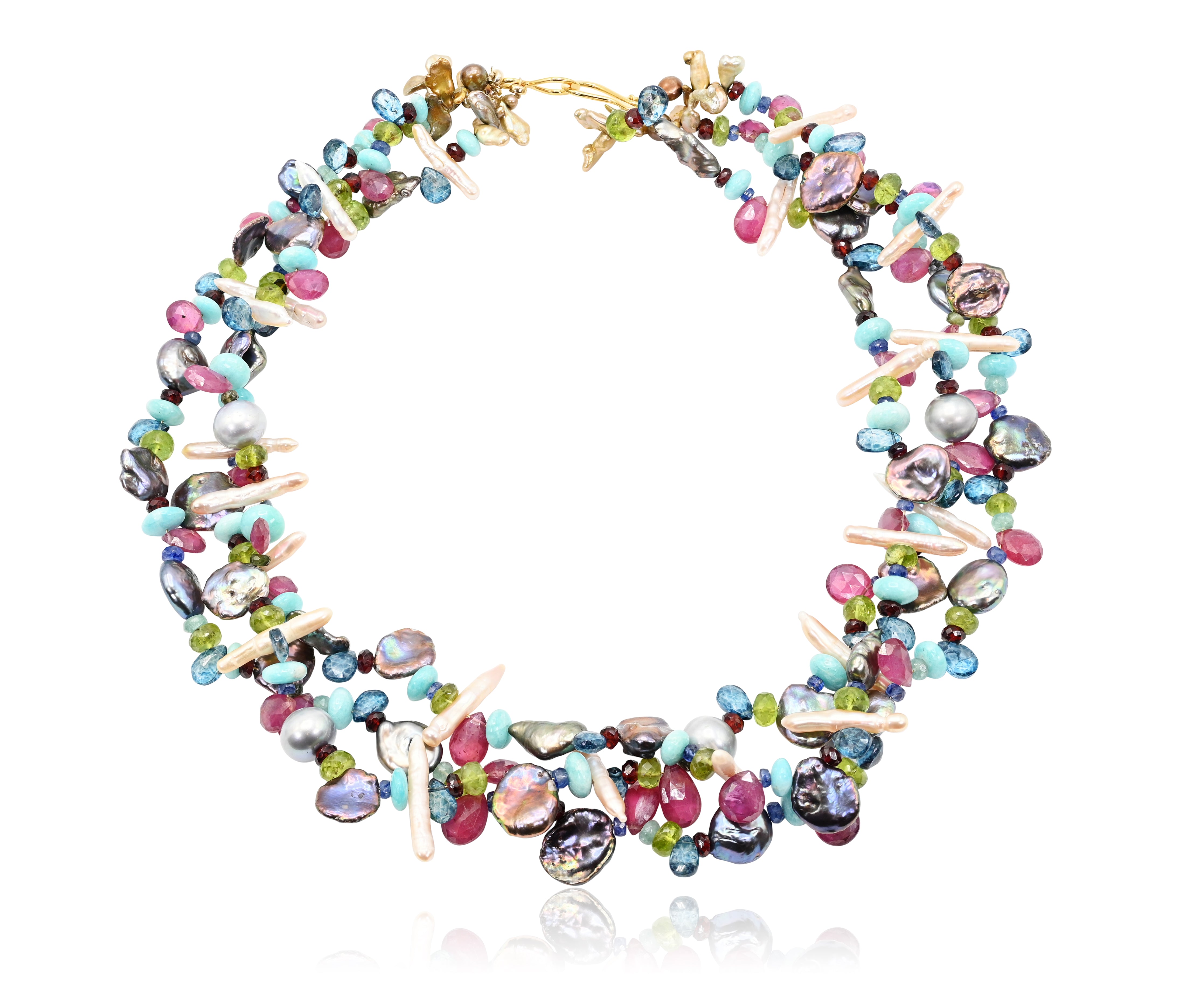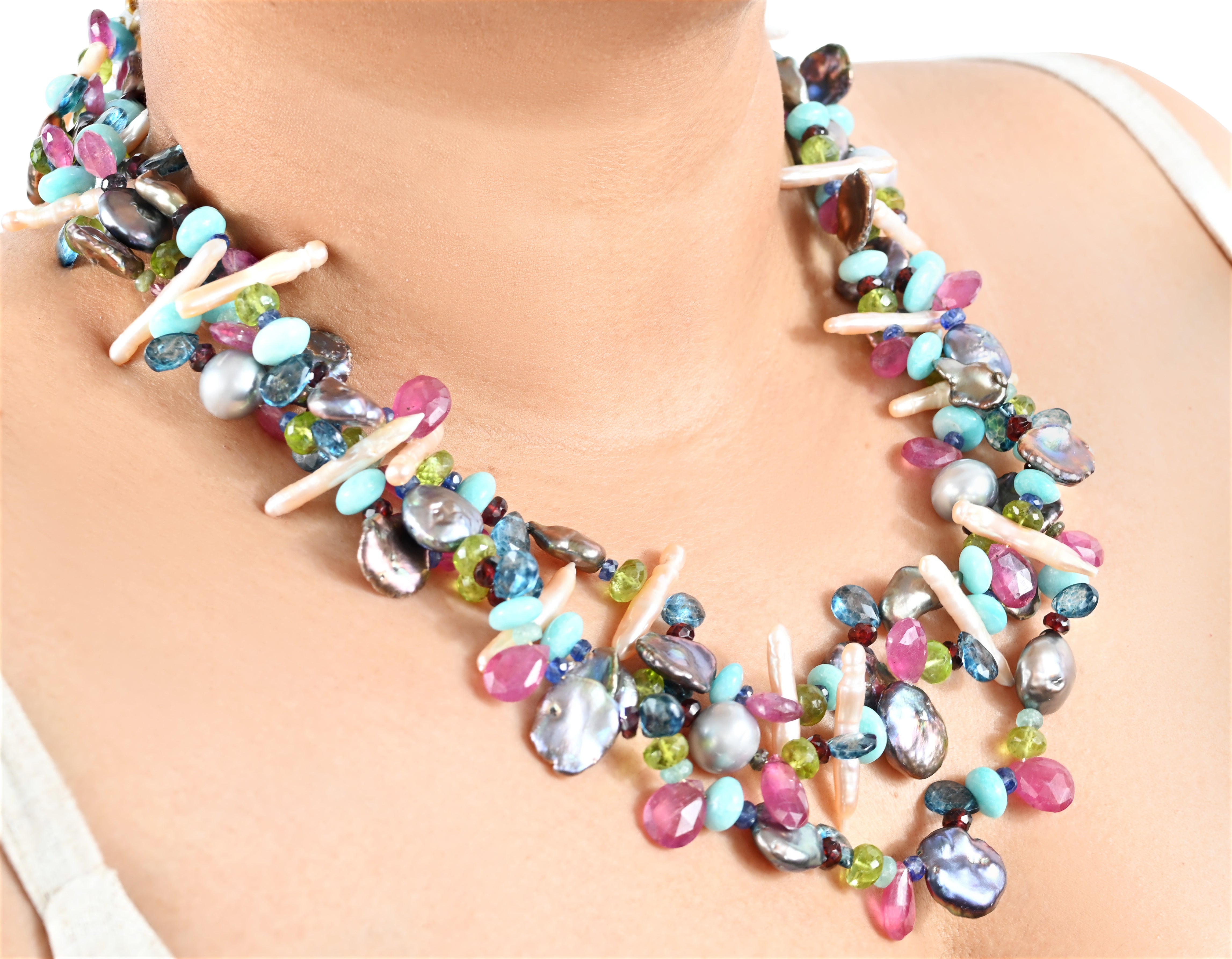 Introducing our exquisite Statement Mix Stones Beads Necklace, a true masterpiece of elegance and craftsmanship. This stunning multi-strand necklace features a harmonious blend of nature's finest gems and pearls, designed to captivate and enchant. The centerpiece of this necklace includes lustrous Peacock Keshi Pearls and radiant Peacock Coin Pearls, exuding a unique iridescence. Complementing these are the dazzling London Blue Topaz Briolettes, large Ruby Briolettes, and large Stick Pearls, each chosen for their exceptional beauty and brilliance. Faceted Peridot Rondelles and Amazonite Rondelles add a touch of vibrant green and soothing blue hues, creating a perfect balance of color and texture. This necklace is a statement piece that effortlessly elevates any outfit, making it ideal for special occasions or adding a touch of glamour to everyday wear. Embrace the allure of this magnificent creation and let its timeless elegance speak volumes about your exquisite taste.