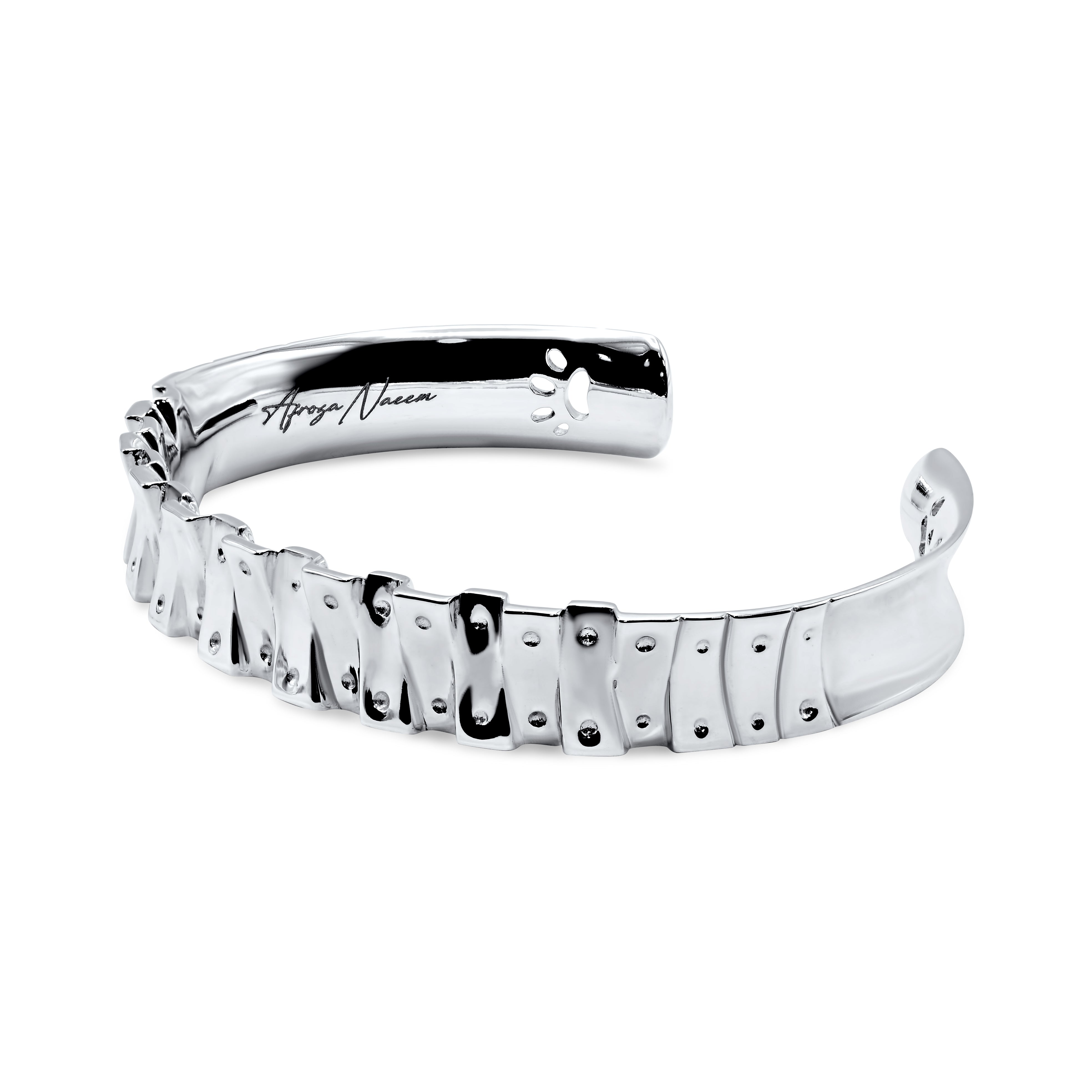 This open bangle cuff epitomizes urban sophistication, featuring an easy to wear design that is also statement-worthy, all crafted from high-quality sterling silver with attention to detail. This silver bracelet's innovativeness boasts stacked hardware elements in the shape of rectangular bricks, adding a modern edge with a feminine touch.