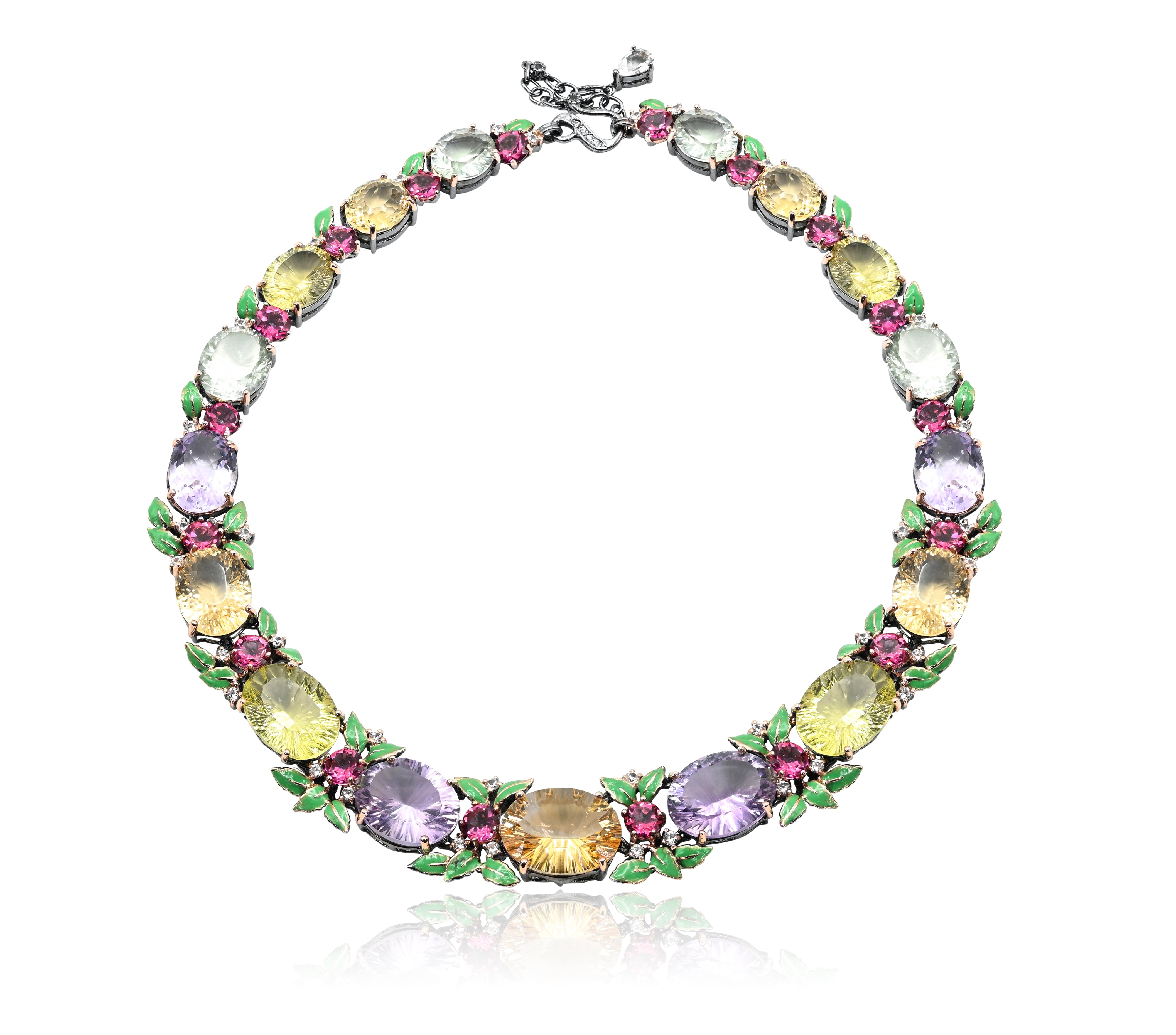 This breathtaking custom-made necklace features oval cut semi-precious gemstones secured in four-prong basket settings, elegantly placed around it in a stunning display of color. Rich green enamel leaves highlight these stones in a garden trellis. A hook clasp keeps it in place. Premium artistry and hand-chosen gemstone offer a glamorous arrangement of shading and noteworthy details.