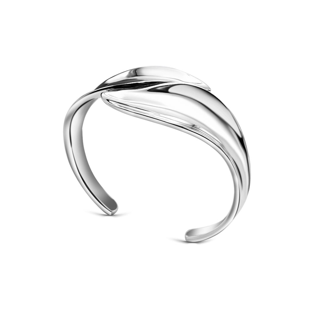 Add the breathtaking beauty of nature to your day or night wardrobe with this sterling silver cuff, featuring two textured flowing petal leaves meeting together in the middle, offering a unique take on gardens and the sea. The opening on the bottom allows various sized wrists to slip through, making this silver bangle perfect for gifting.