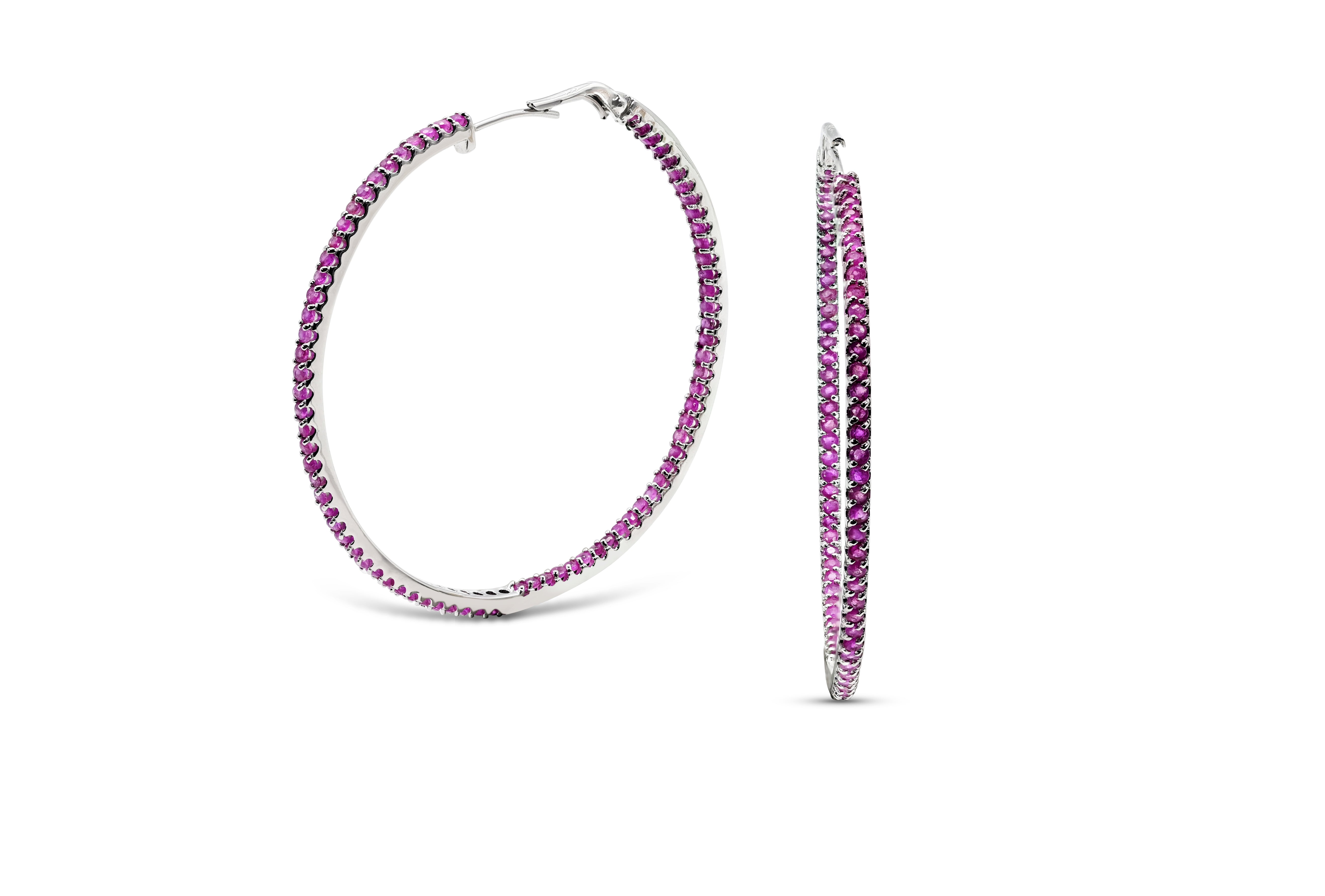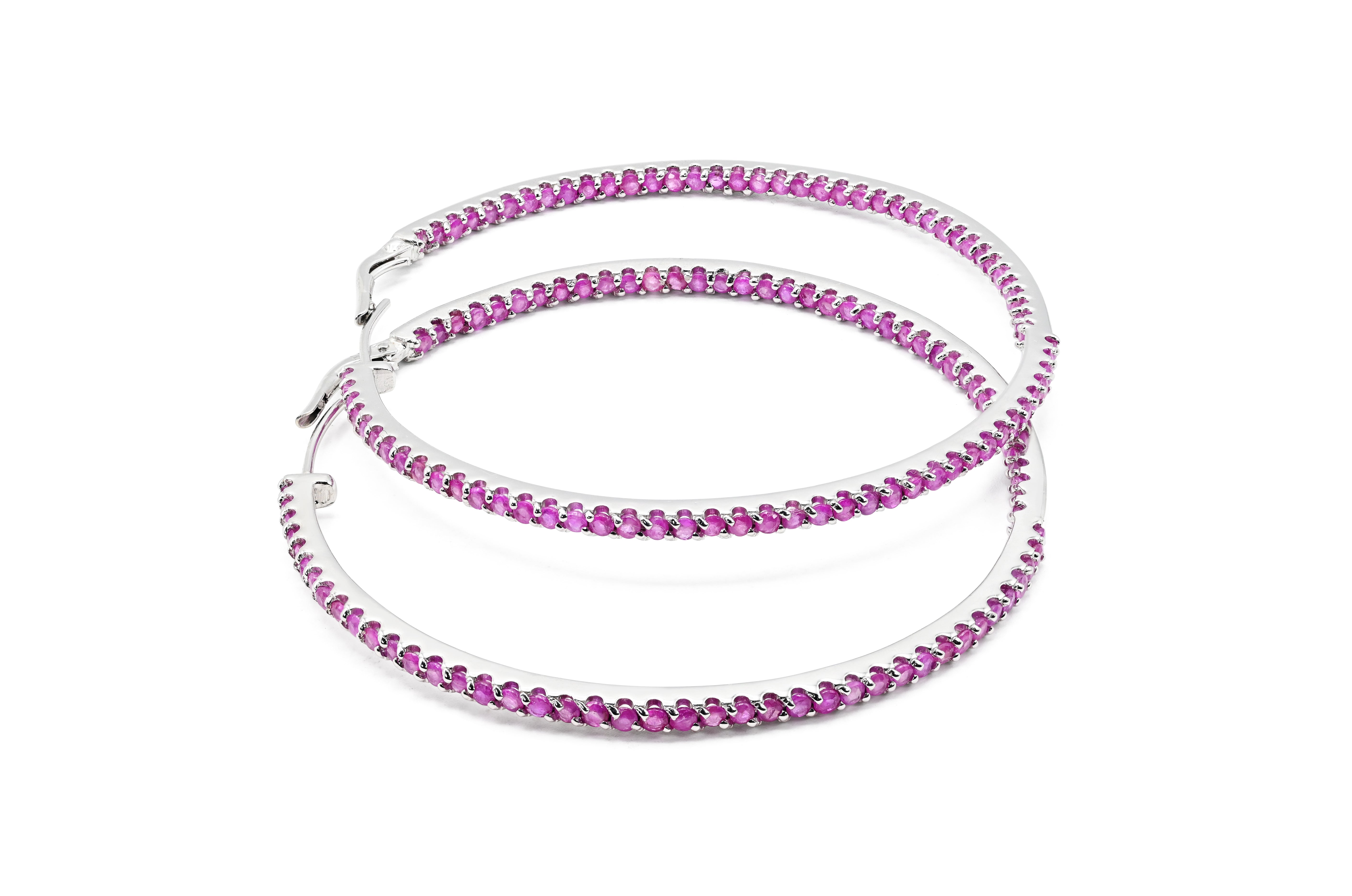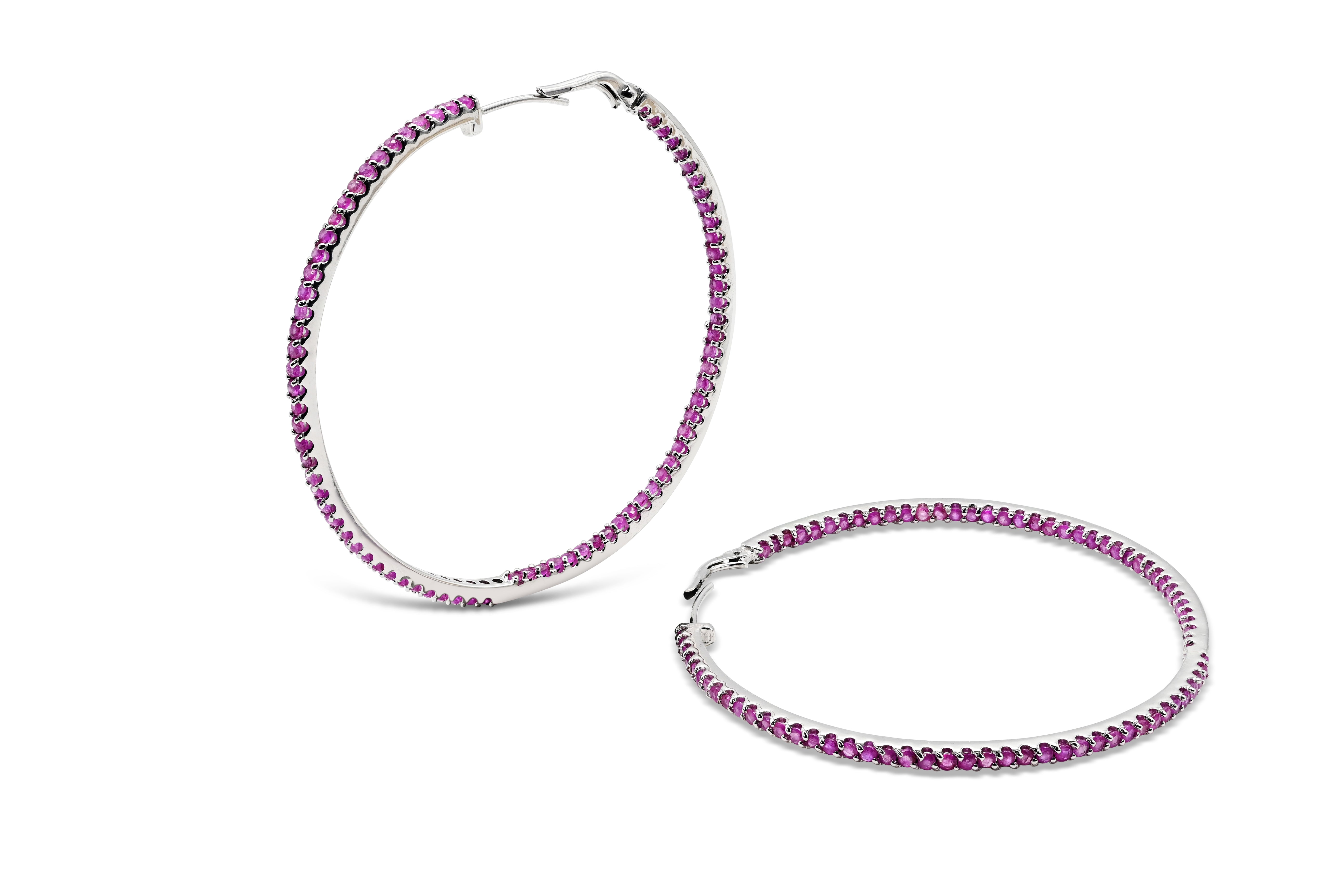 Extra large pink sapphire hoop earrings are a striking addition to any jewelry collection, combining elegance and boldness in one exquisite piece. Crafted from sterling silver and enhanced with rhodium plating, these earrings offer both durability and a brilliant shine that resists tarnishing. The design features dazzling pink sapphires set both inside and outside the hoops, ensuring that the vibrant gemstones catch light from every angle, creating a dynamic and captivating look. Perfect for special occasions or adding a touch of glamour to everyday attire, these earrings seamlessly blend luxury and style, making them a versatile accessory for those who appreciate sophisticated jewelry with a modern twist.