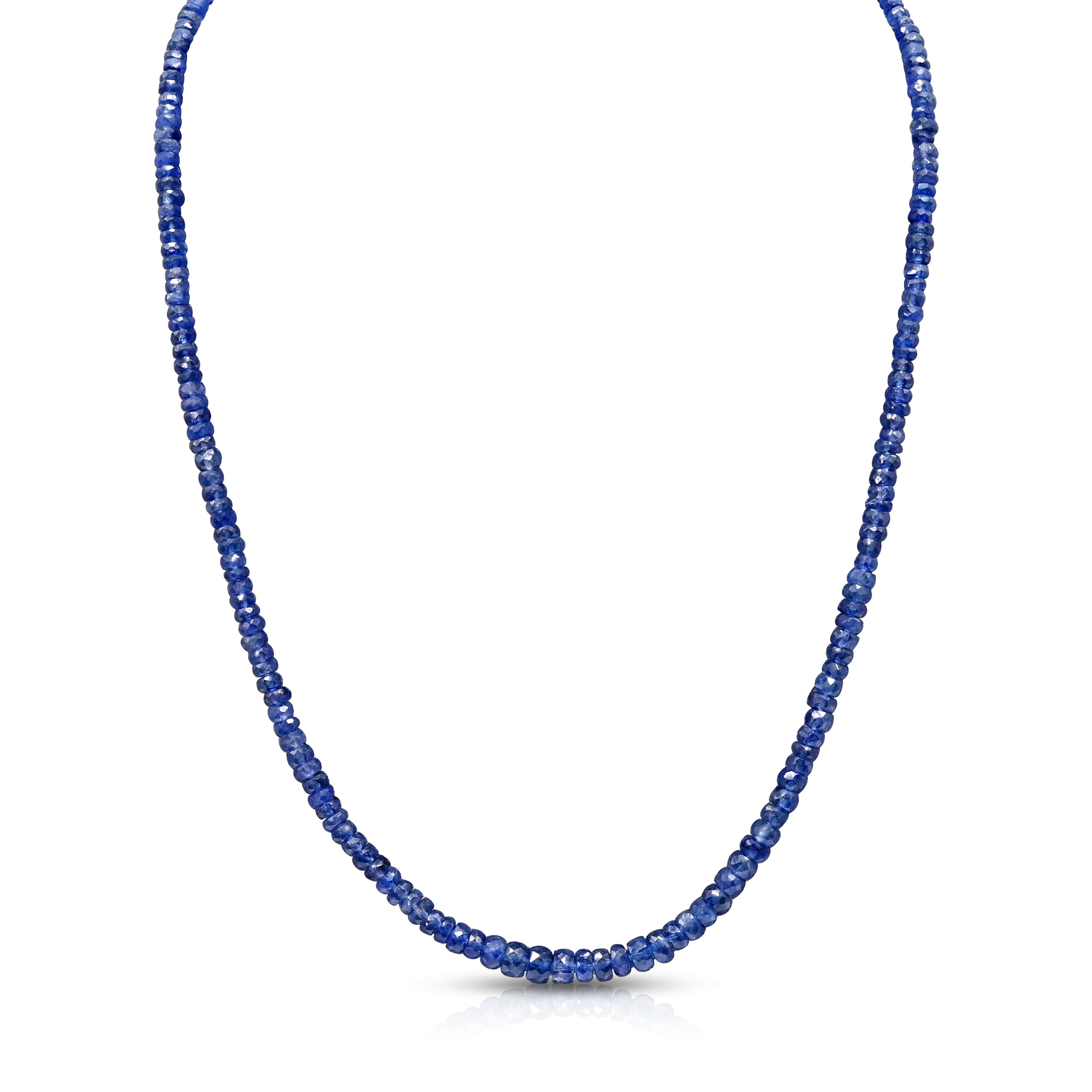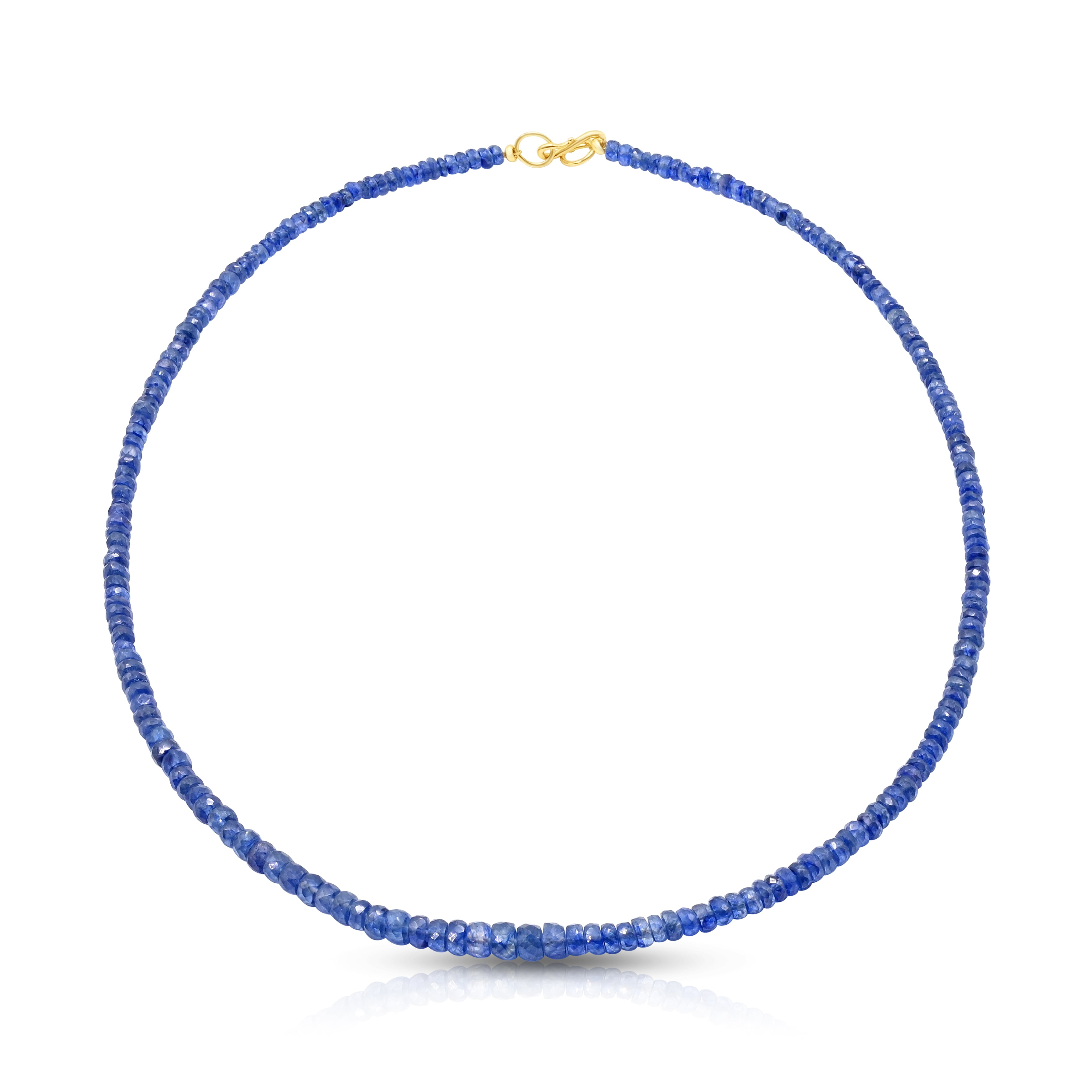 Add the breathtaking beauty of natural sapphire to any wardrobe with this gorgeous blue sapphire beads necklace. Each uniquely stunning bead sits next to each other, elegantly strung on a sturdy cord. A brightly polished 14k yellow gold clasp finishes the look, making this precious gemstone necklace extra luxurious.