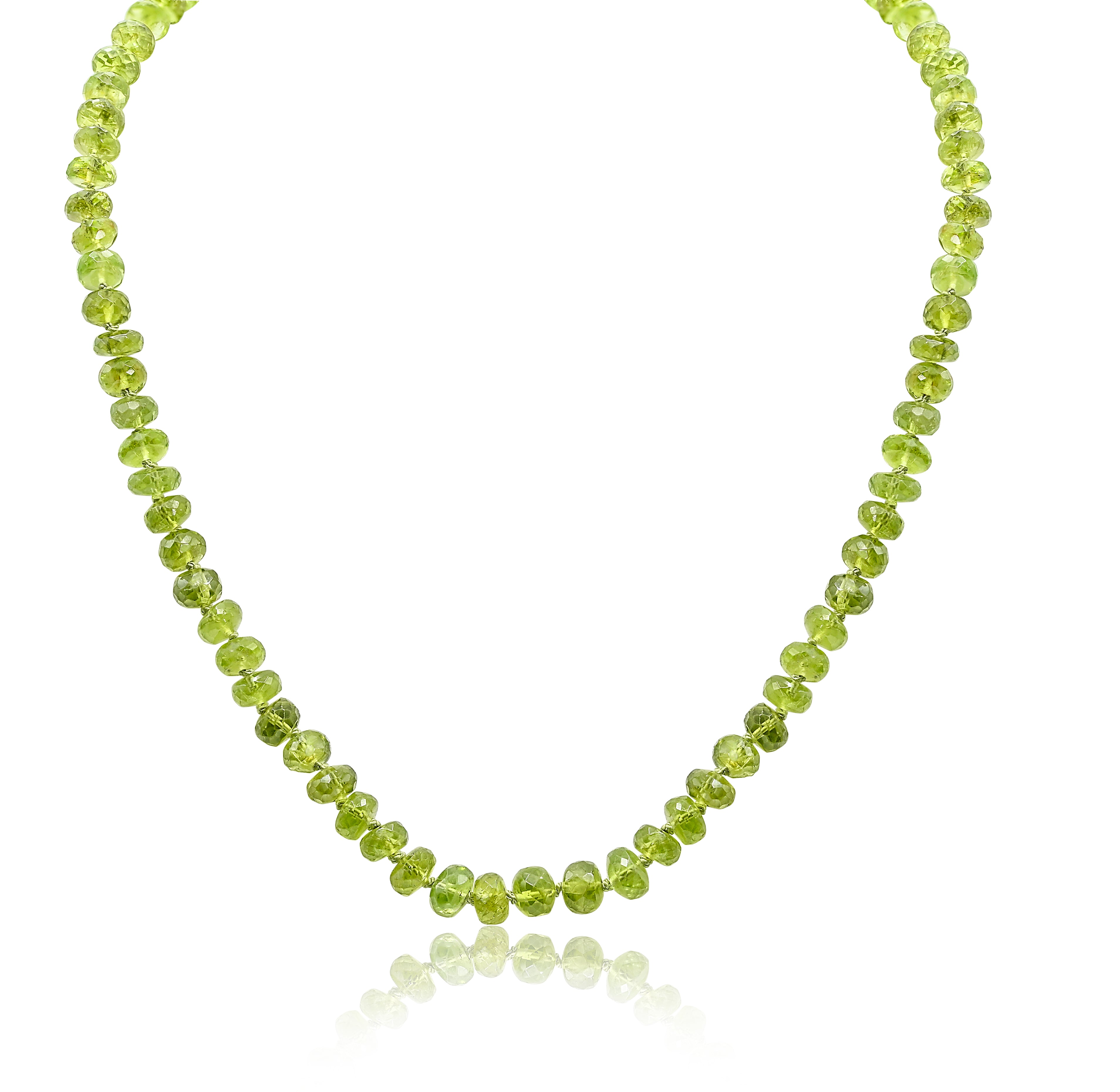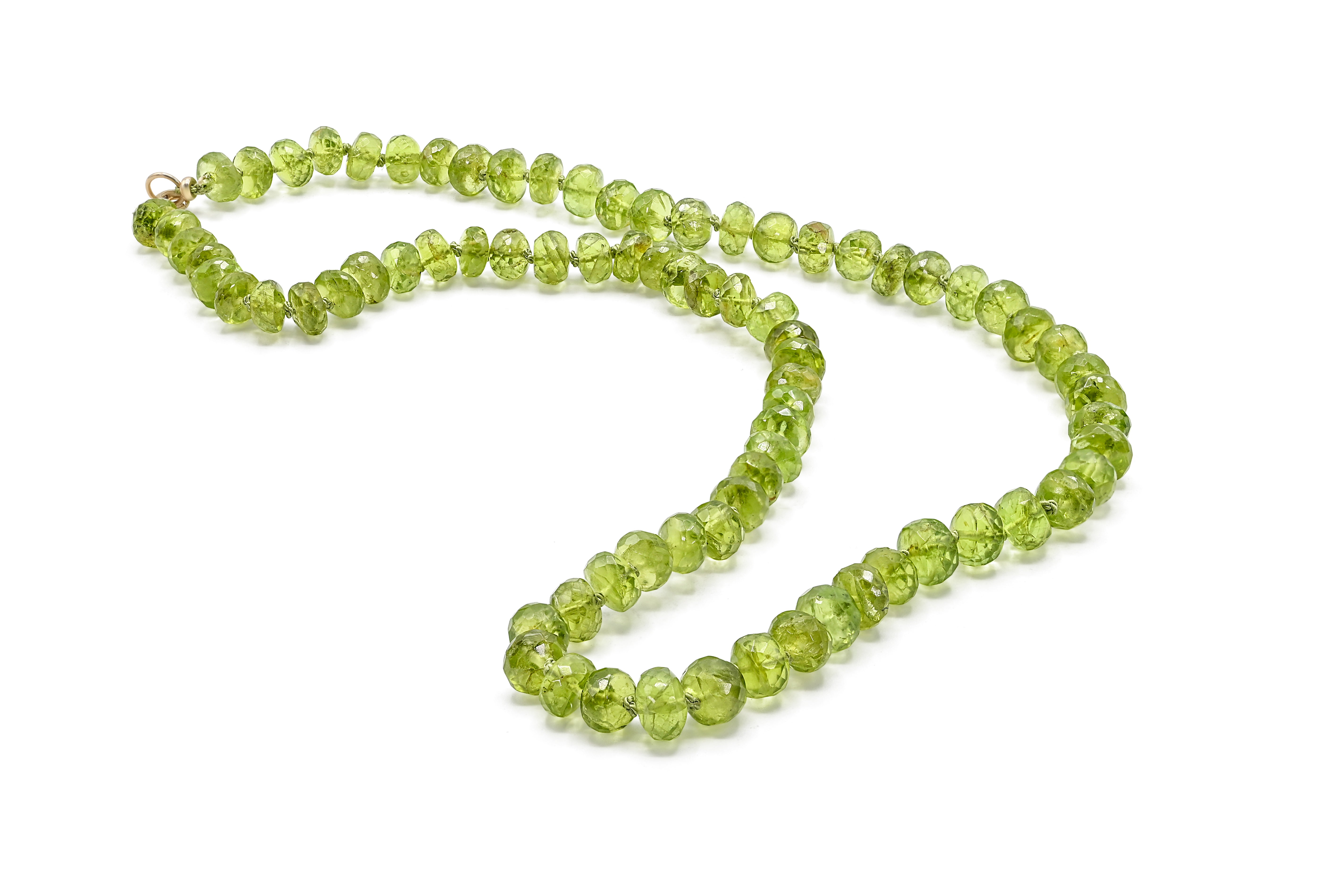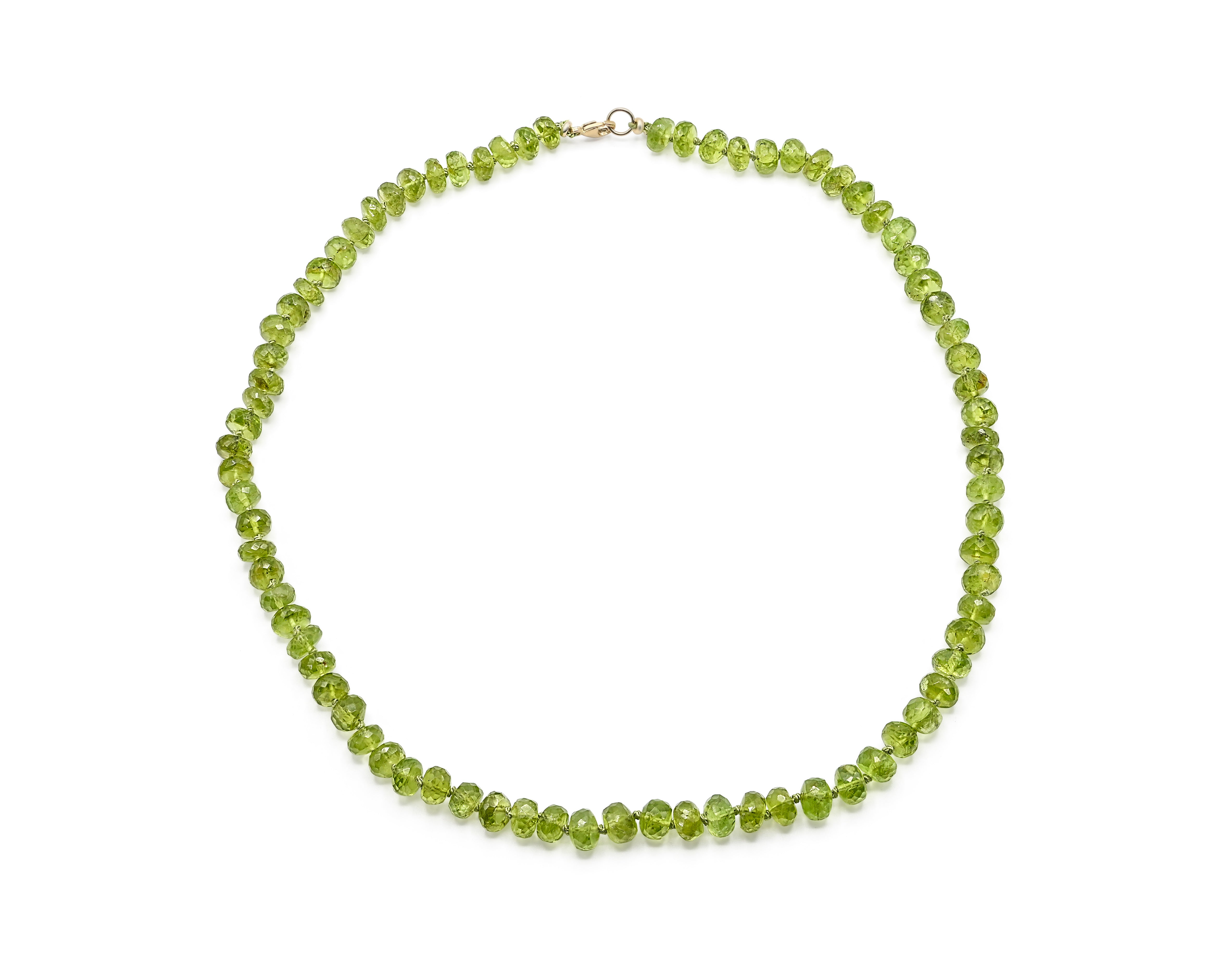 This exquisite necklace showcases a timeless elegance with its 6-7mm faceted Randell Peridot beads, each meticulously hand-knotted with luxurious green silk thread. The Peridot stones, known for their vibrant, olive-green hue and sparkling facets, are perfectly complemented by the rich, green silk, creating a harmonious and sophisticated aesthetic. Adding a touch of opulence, the necklace features a 14K gold hook clasp, ensuring both security and a refined finish. Ideal for both everyday wear and special occasions, this piece not only embodies superior craftsmanship but also serves as a stunning testament to the beauty of natural gemstones.