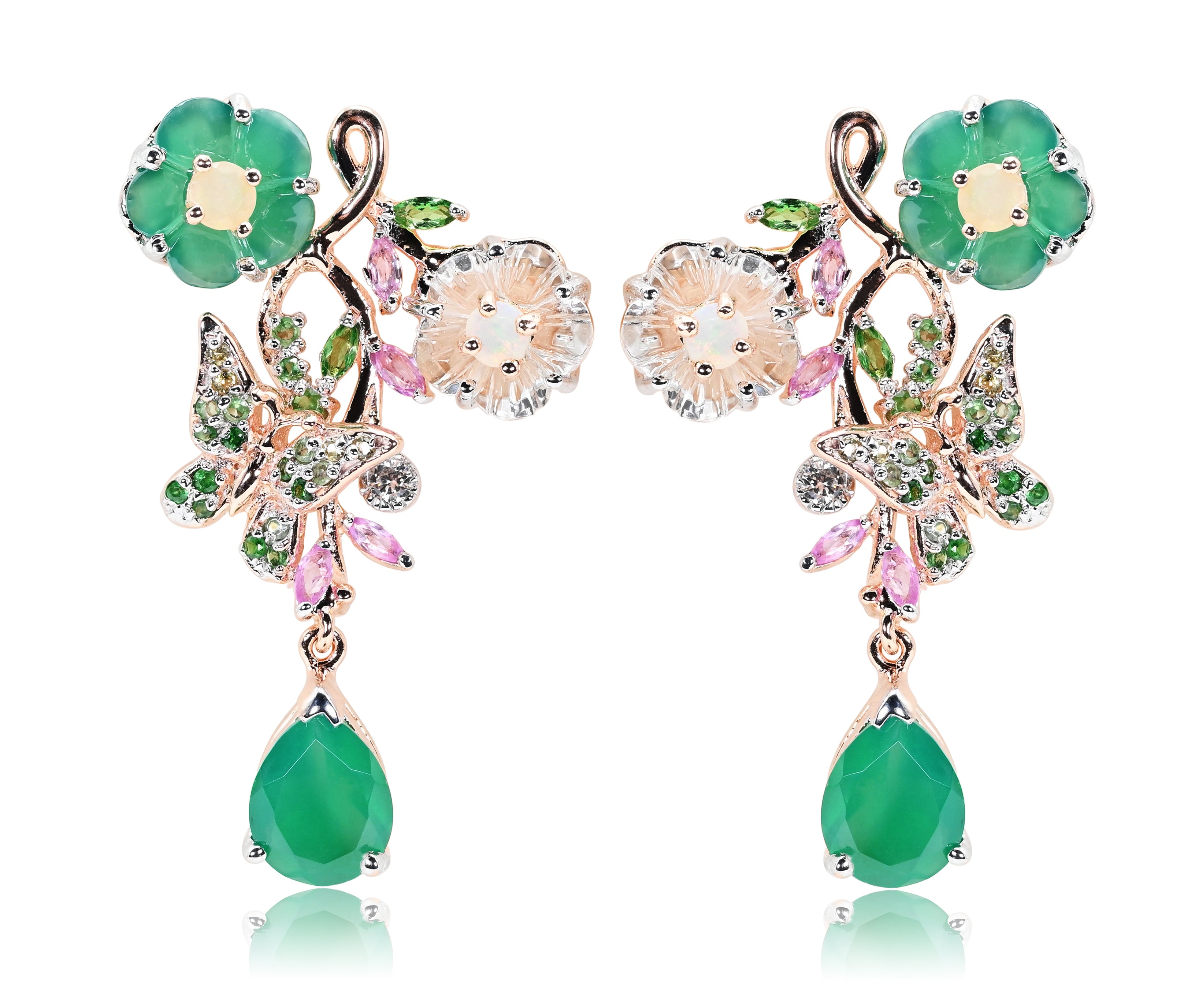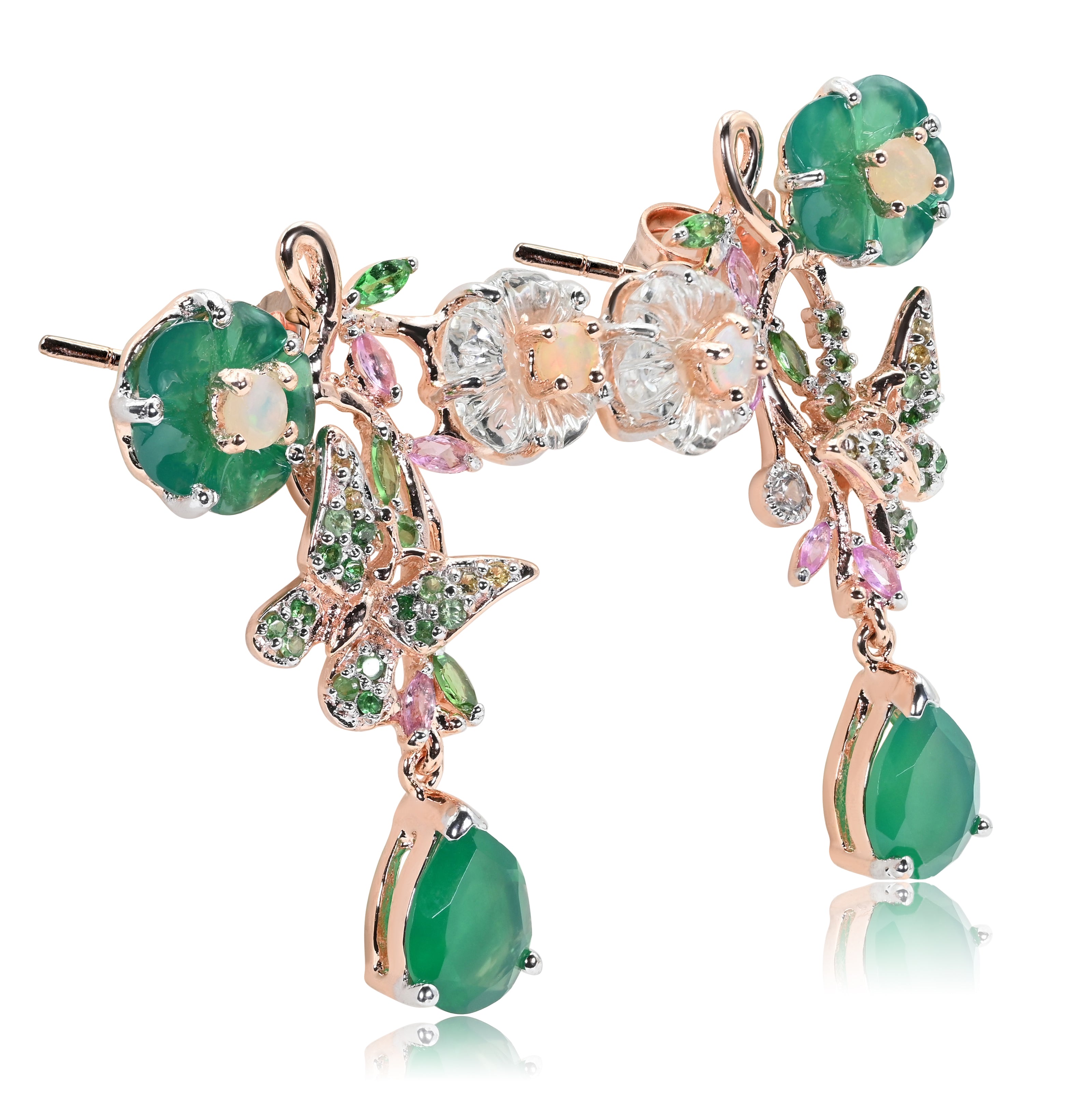 Flower Butterfly Dangle Earrings Green Chalcedony Vermeil Sterling Silver