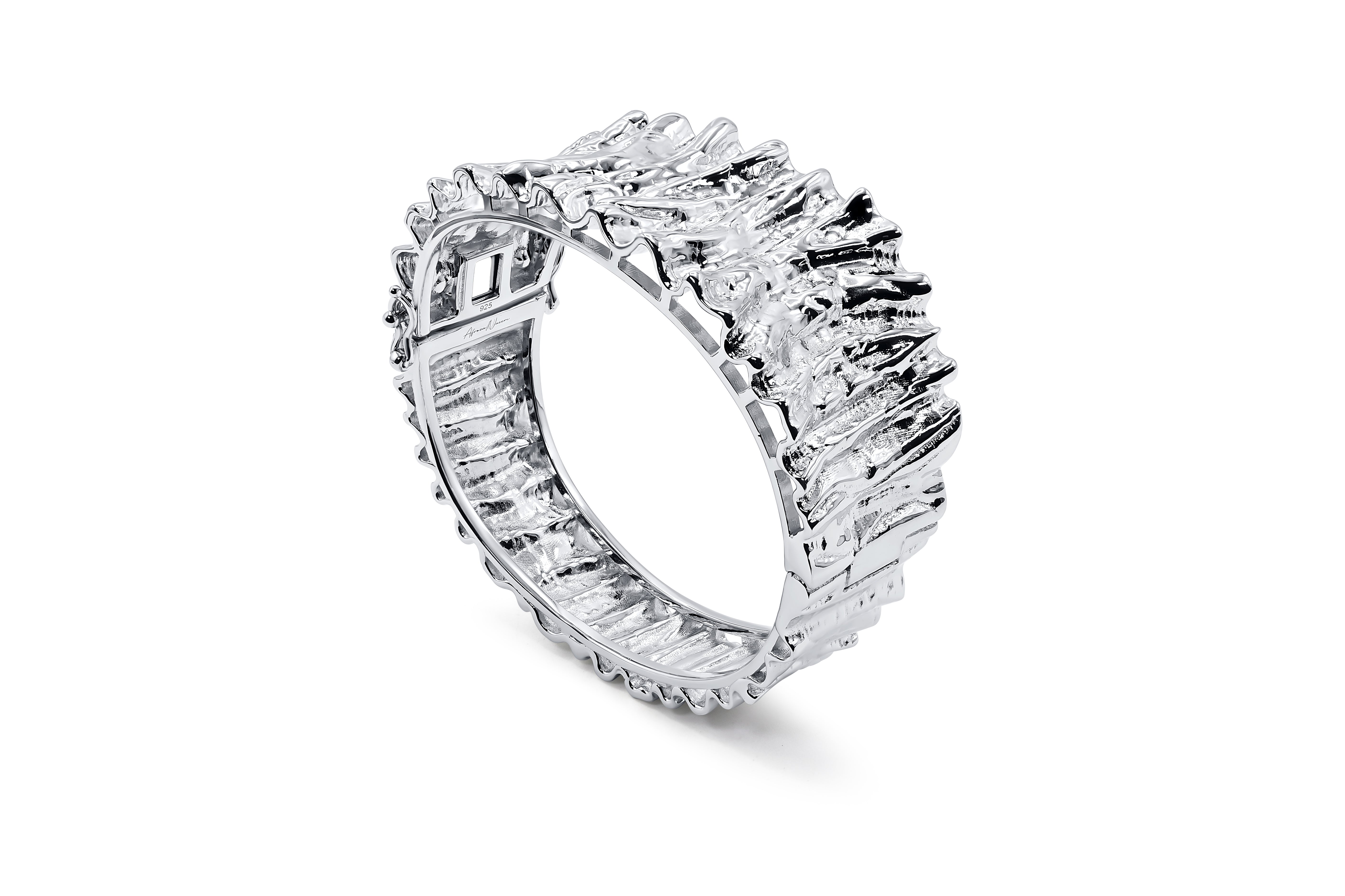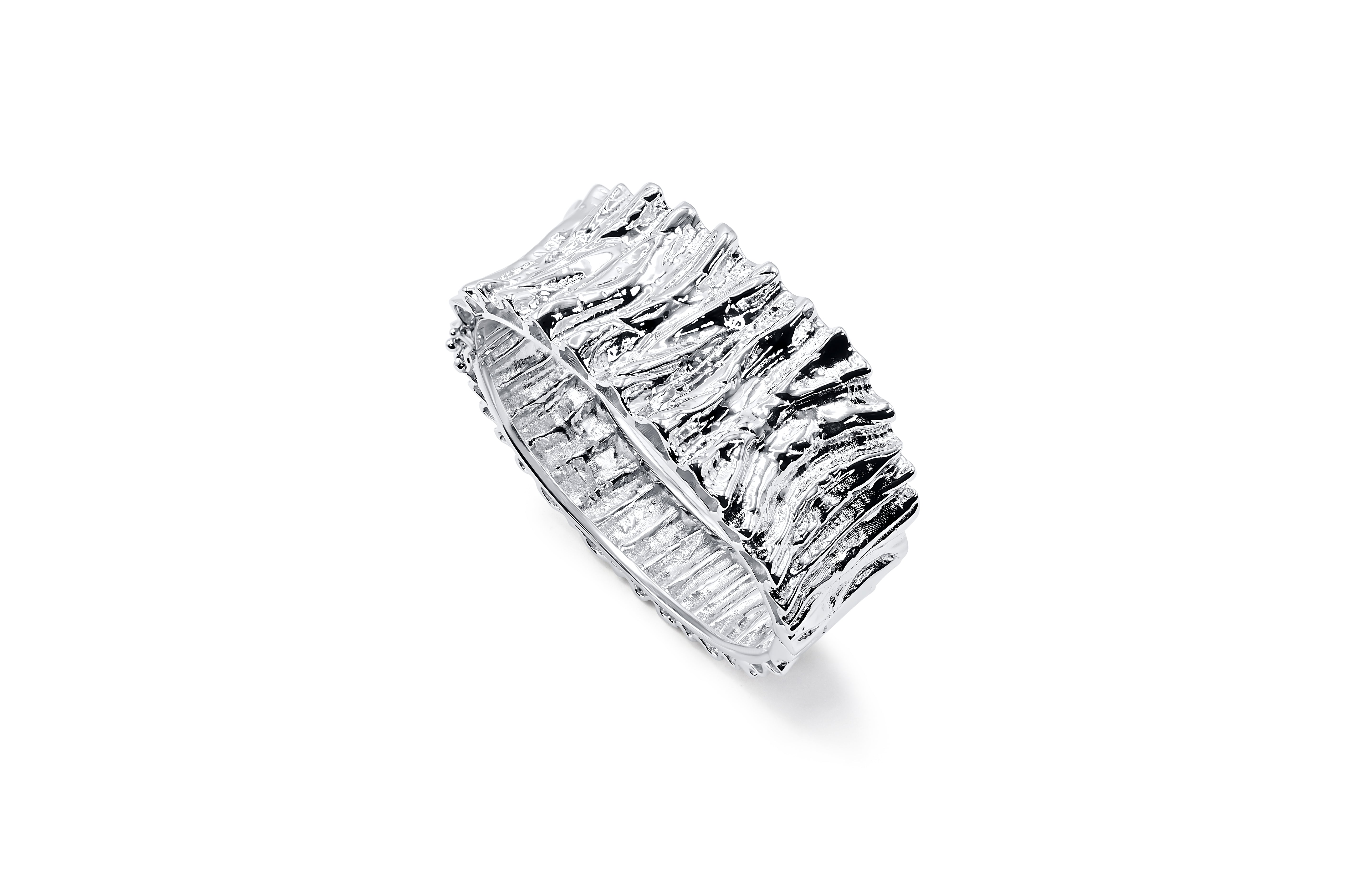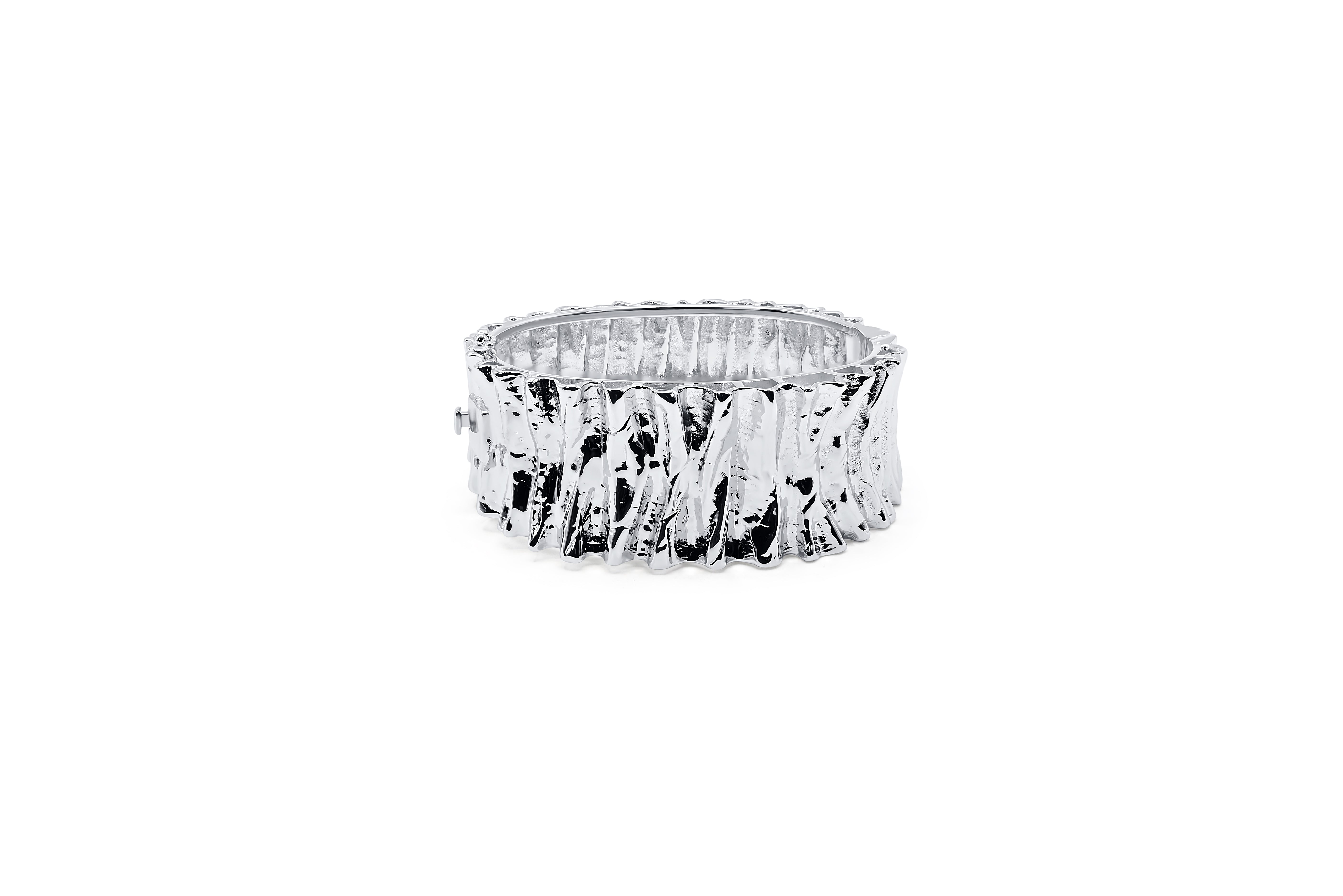 Introducing our stunning wide folded metal textured sterling silver rhodium-plated statement cuff bracelet, a true masterpiece of craftsmanship and style. This heavy-duty accessory is designed to make a bold statement, combining elegance with durability. The bracelet features a unique folded metal texture that catches the light beautifully, adding depth and dimension to its sleek design. Crafted from premium sterling silver and enhanced with a rhodium plate finish, this piece promises long-lasting shine and resistance to tarnish. Ideal for those seeking a versatile yet standout addition to their jewelry collection, this cuff bracelet effortlessly elevates any outfit, making it perfect for both casual and formal occasions. Embrace the art of statement jewelry with this exquisite piece that speaks volumes of sophistication and strength.