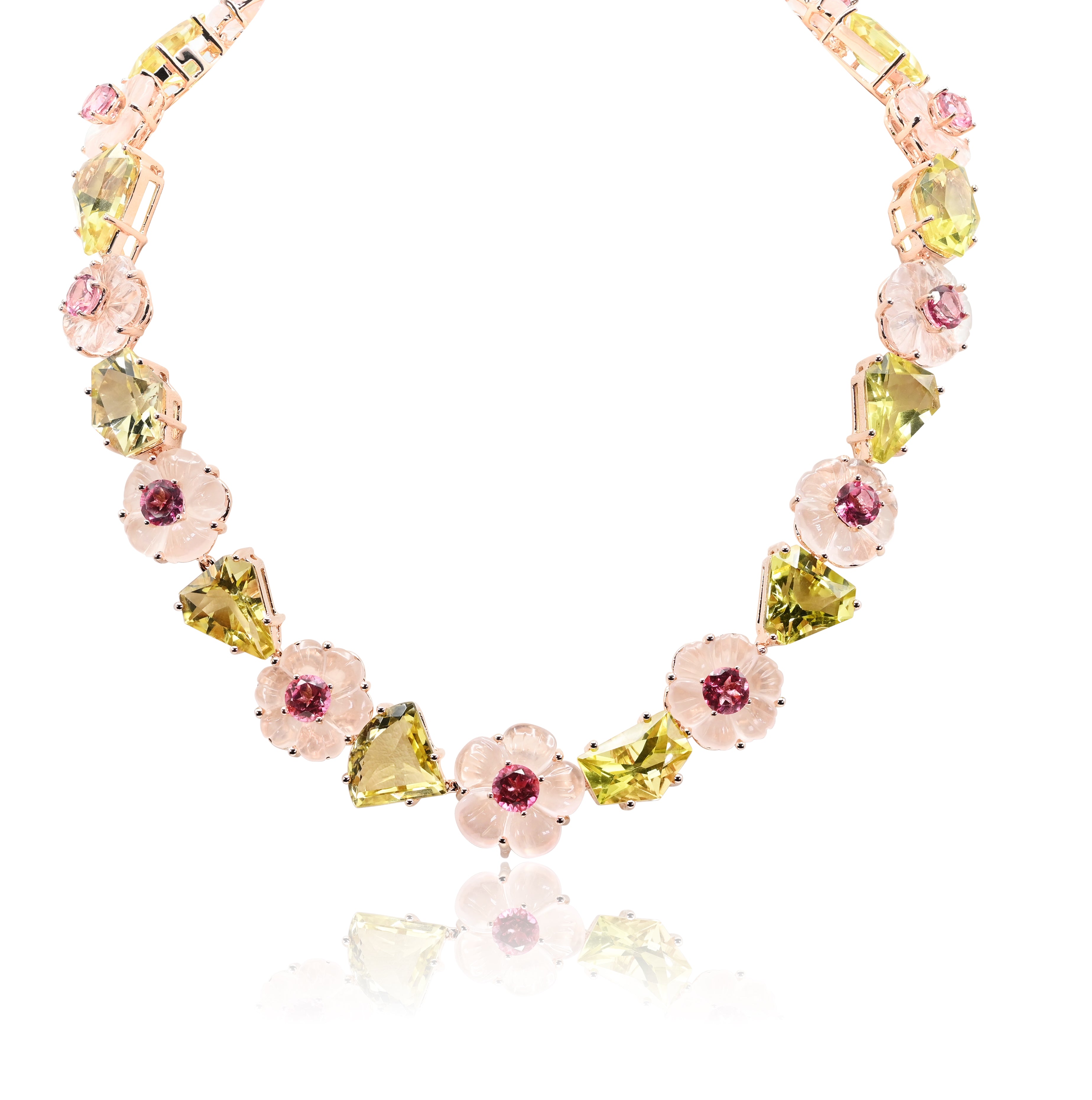 This glamorous custom-made necklace features a bevy of gemstones fashioned into different shapes and sizes. This breathtaking custom-made necklace features fancy cut semi-precious gemstones secured in four-prong basket settings, elegantly placed around it in a stunning display of color.