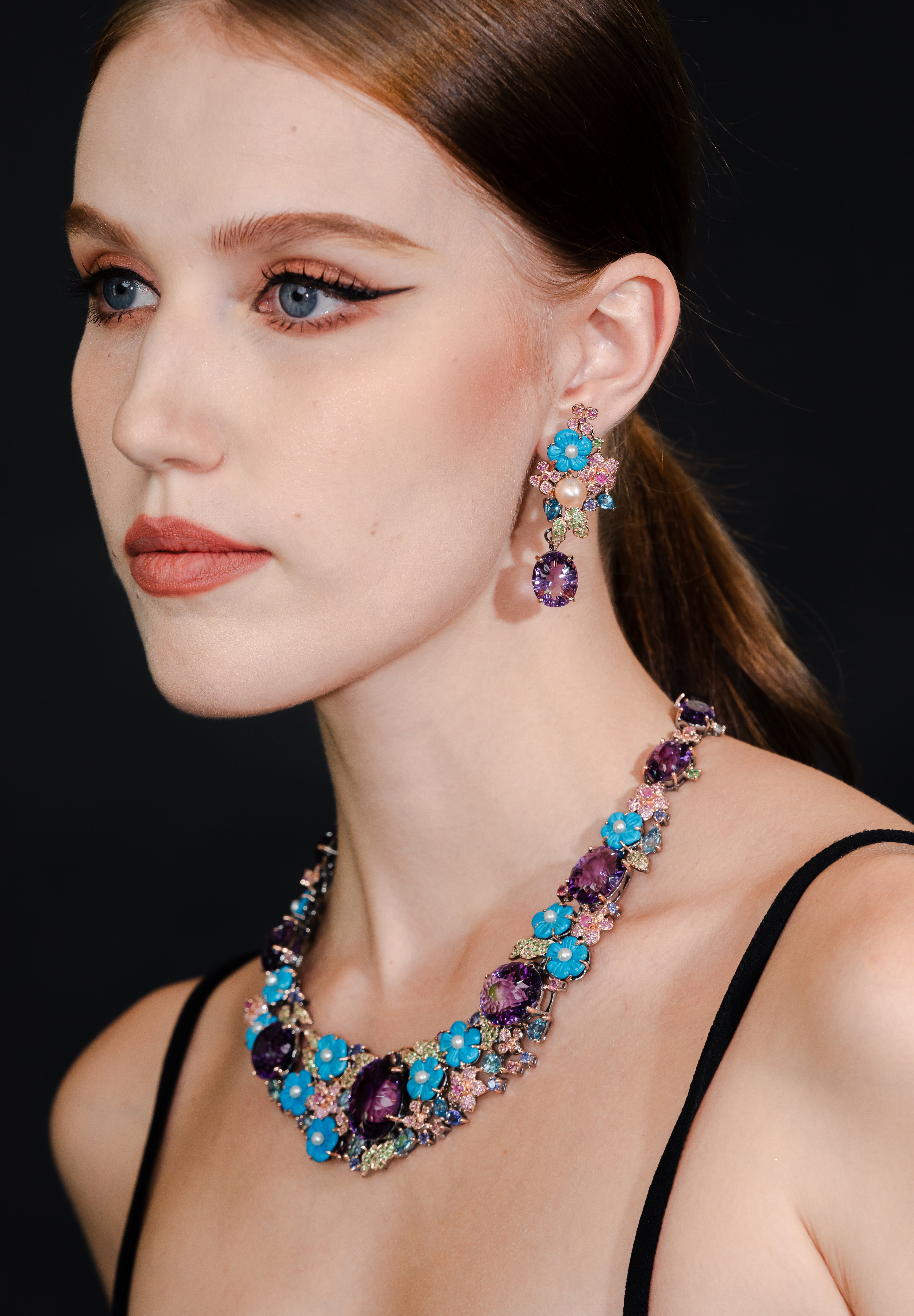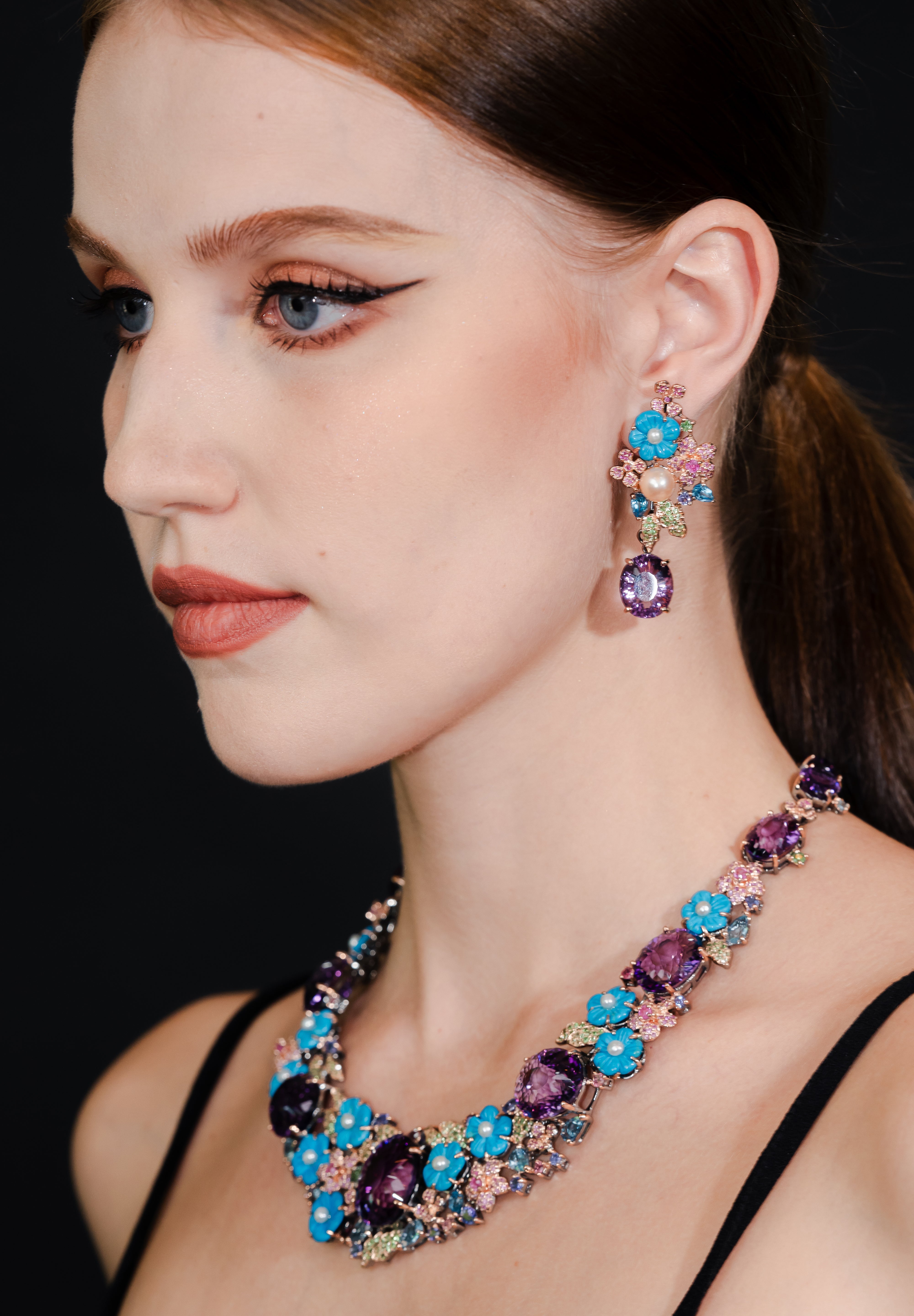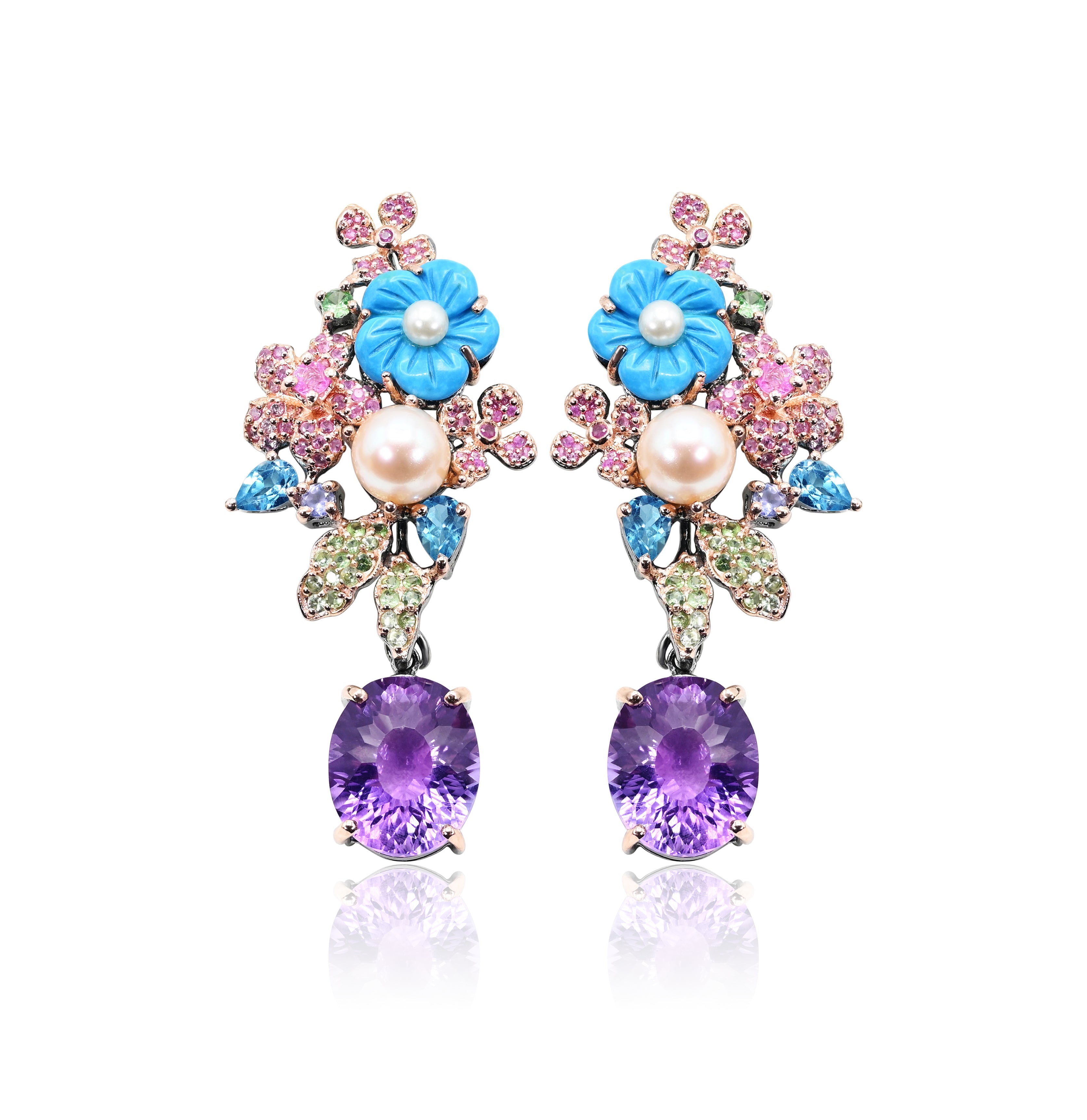 This glamorous custom-made earrings features a bevy of gemstones fashioned into different shapes and sizes, creating an intricate flower bed with carved designs and pave stones dusting the petals and leaves.