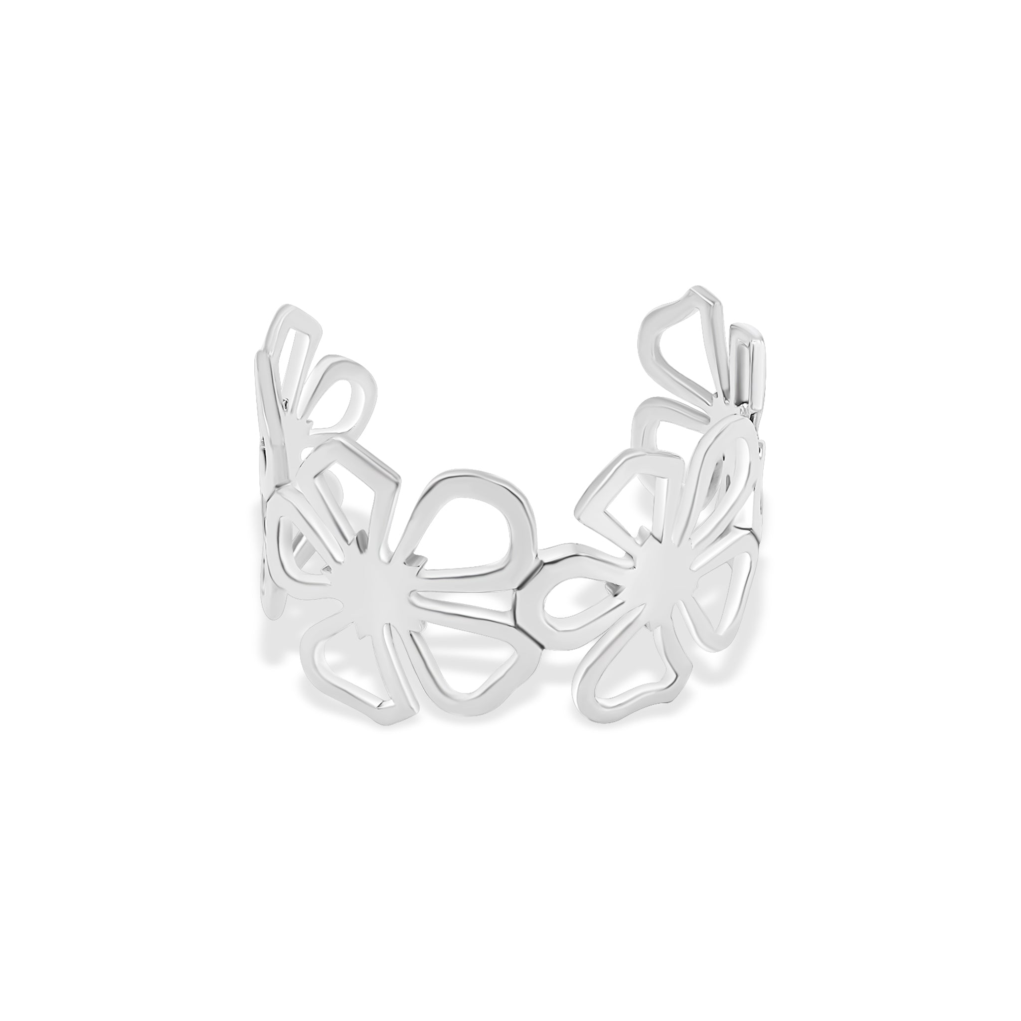 Fanciful hibiscuses are brought to fruition in the form of wearable art with this brightly polished sterling silver cuff. Flattened and modern, each delightful flower sits side by side as if on a trellis, giving this shiny bangle an uplifting quality. The opening on the bottom allows effortless wear as it slips on the wrist.