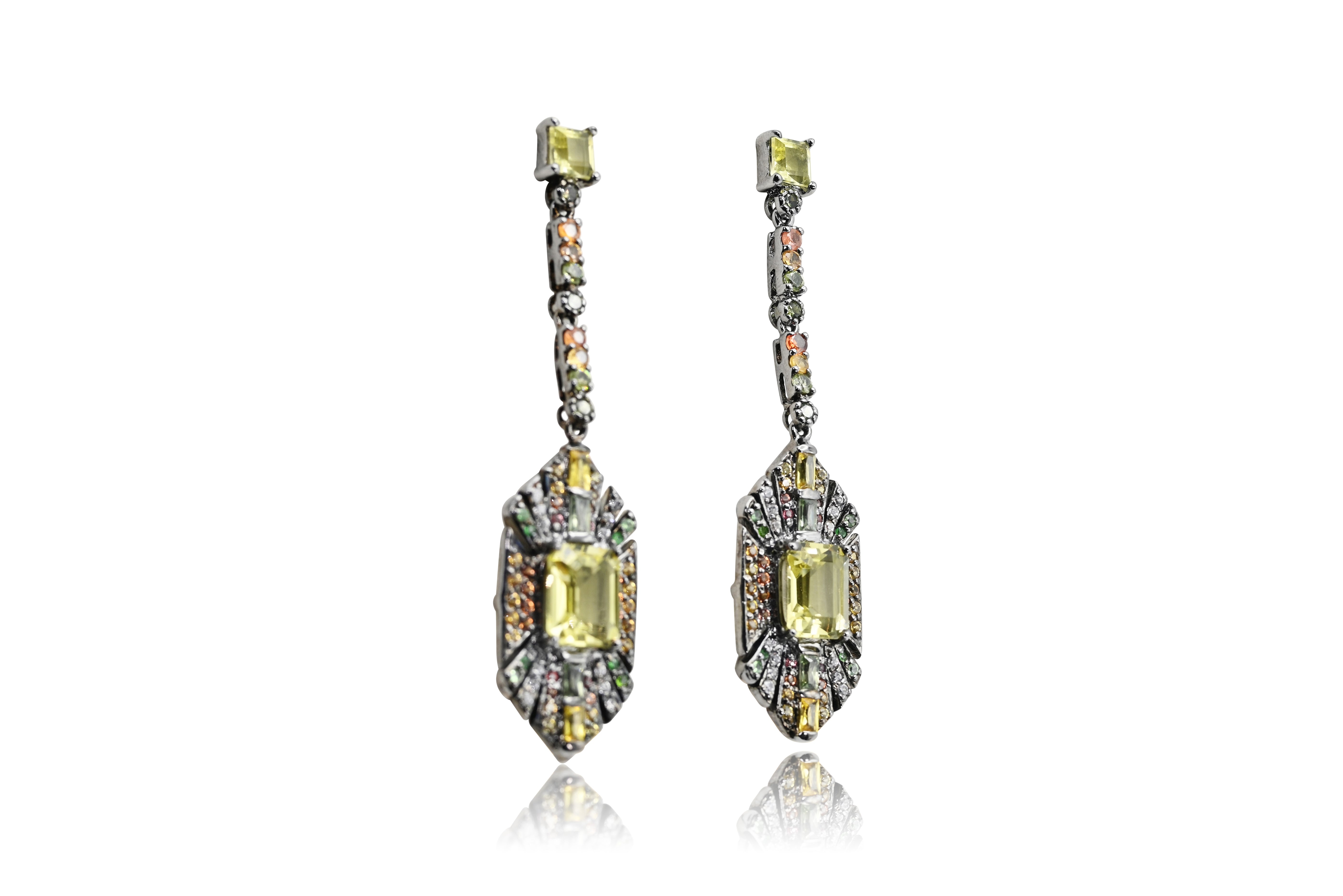 Introducing our exquisite Modern Long Drop Earrings, a stunning piece that effortlessly elevates any ensemble. These earrings feature an elegant emerald-cut lemon quartz, renowned for its vibrant and refreshing hue, beautifully complemented by an array of multi-color sapphires. Each sapphire brings a splash of color, adding an extra layer of sophistication and charm. Crafted from sterling silver and finished with a sleek black rhodium plating, these earrings offer a contemporary twist on classic elegance. The combination of high-quality materials ensures durability while maintaining a luxurious appearance. Perfect for both day and evening wear, these earrings are a must-have accessory for those seeking to make a bold statement. Embrace the allure of these Modern Long Drop Earrings and let them become a treasured addition to your jewelry collection.