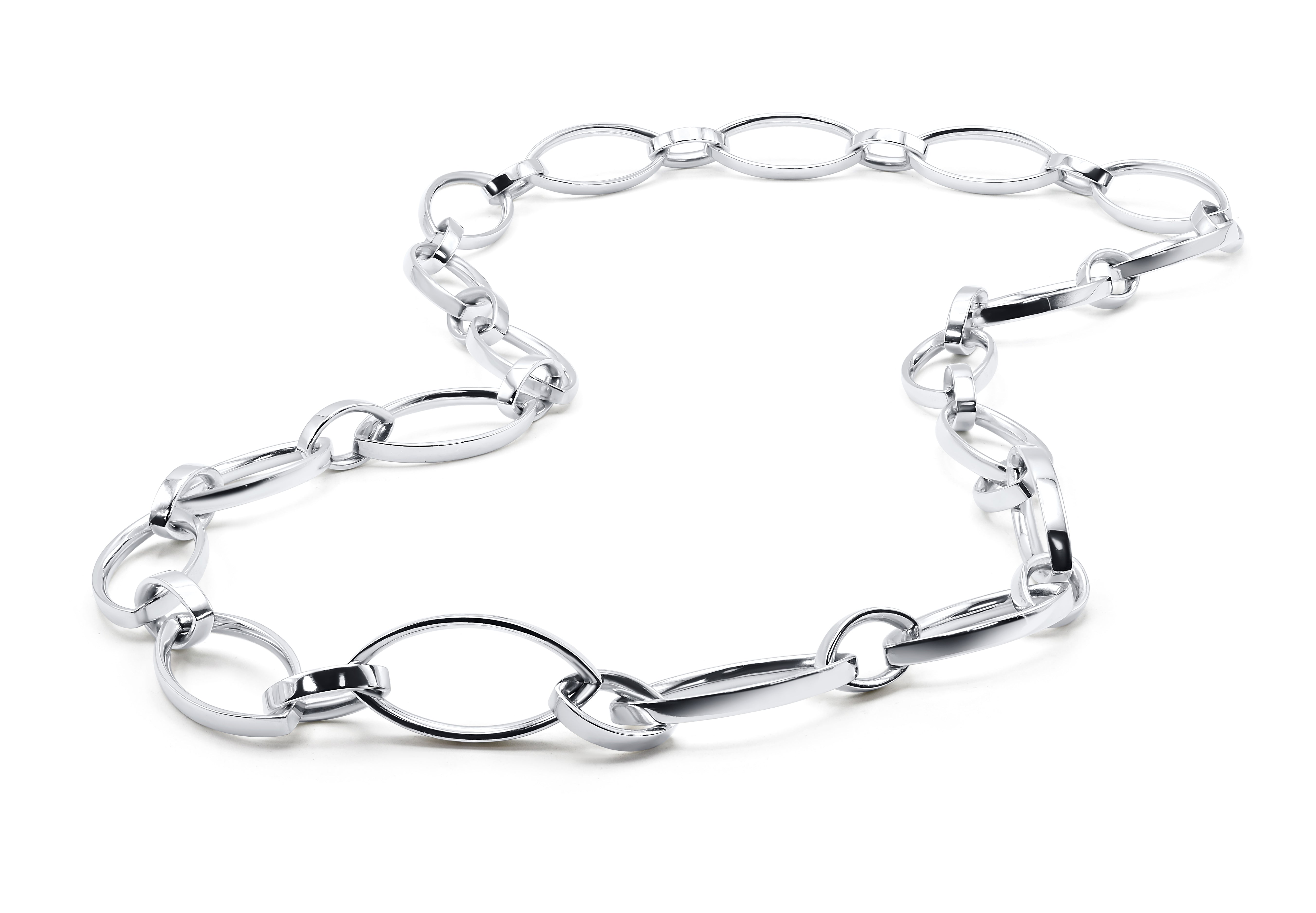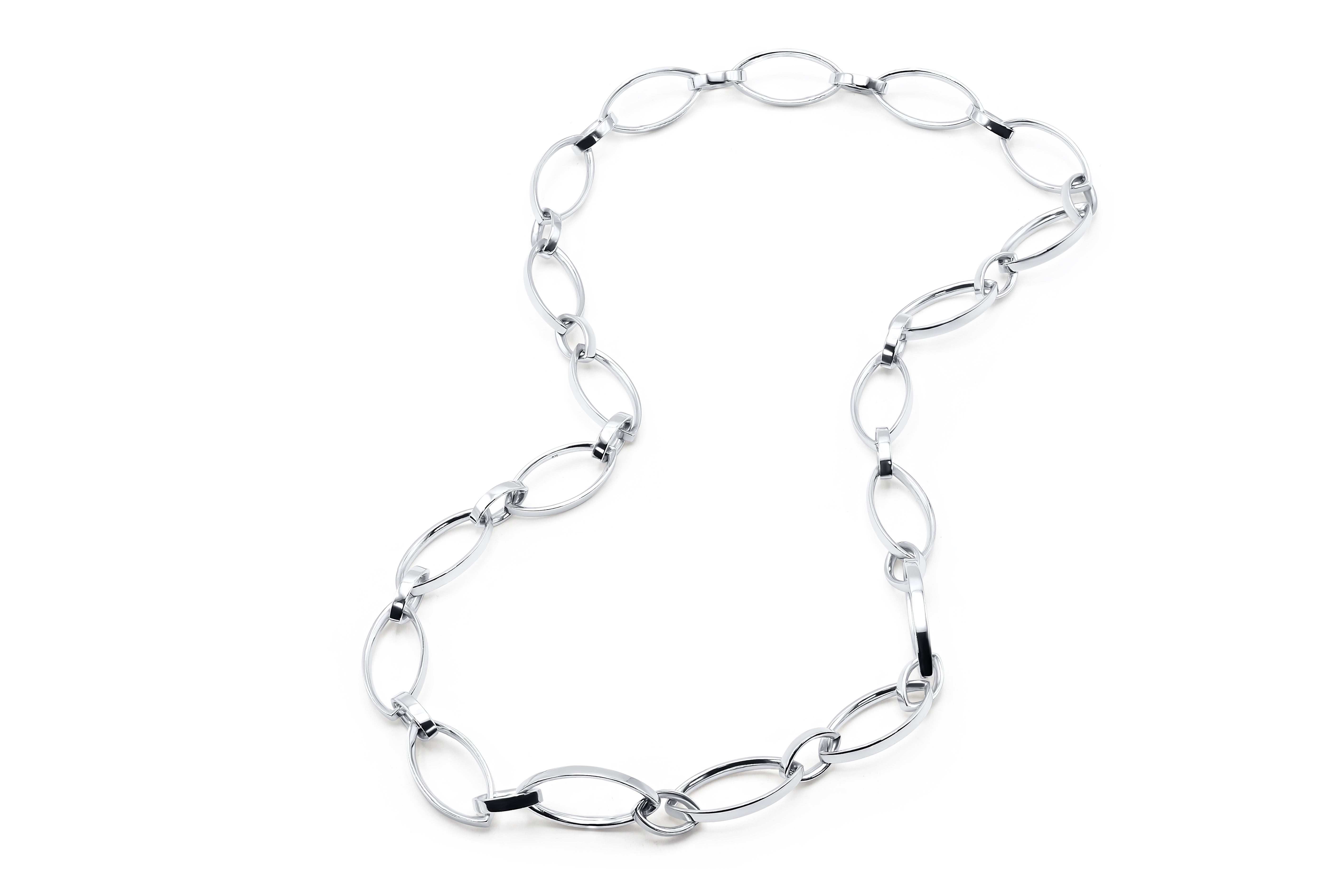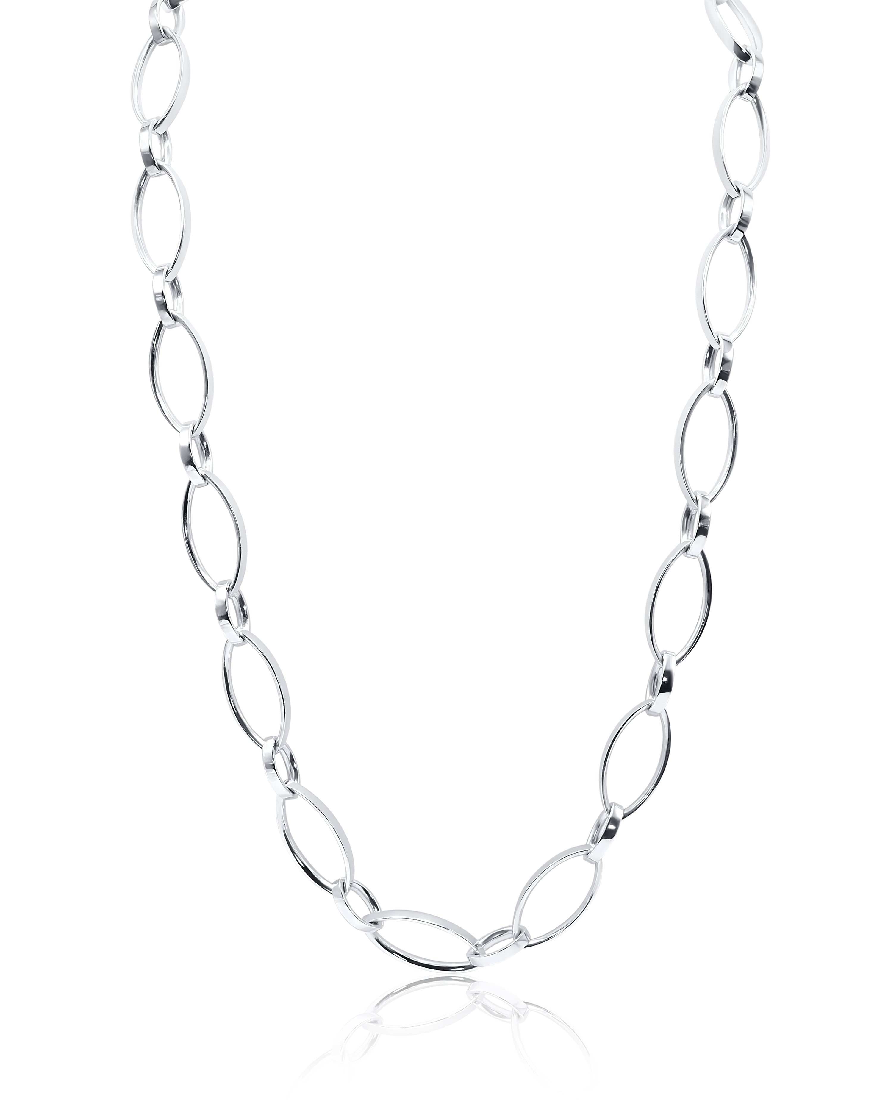 This exquisite necklace features an eye-catching design with a blend of chunky marquise-shaped links in both large and small sizes, meticulously crafted from high polish sterling silver. Measuring an impressive 30 inches, the necklace offers a seamless, clasp-free style that drapes elegantly around the neck. The unique combination of link sizes adds a dynamic visual appeal, making it a versatile accessory that complements both casual and formal attire. Ideal for those who appreciate bold, statement pieces, this necklace is sure to become a cherished addition to any jewelry collection.