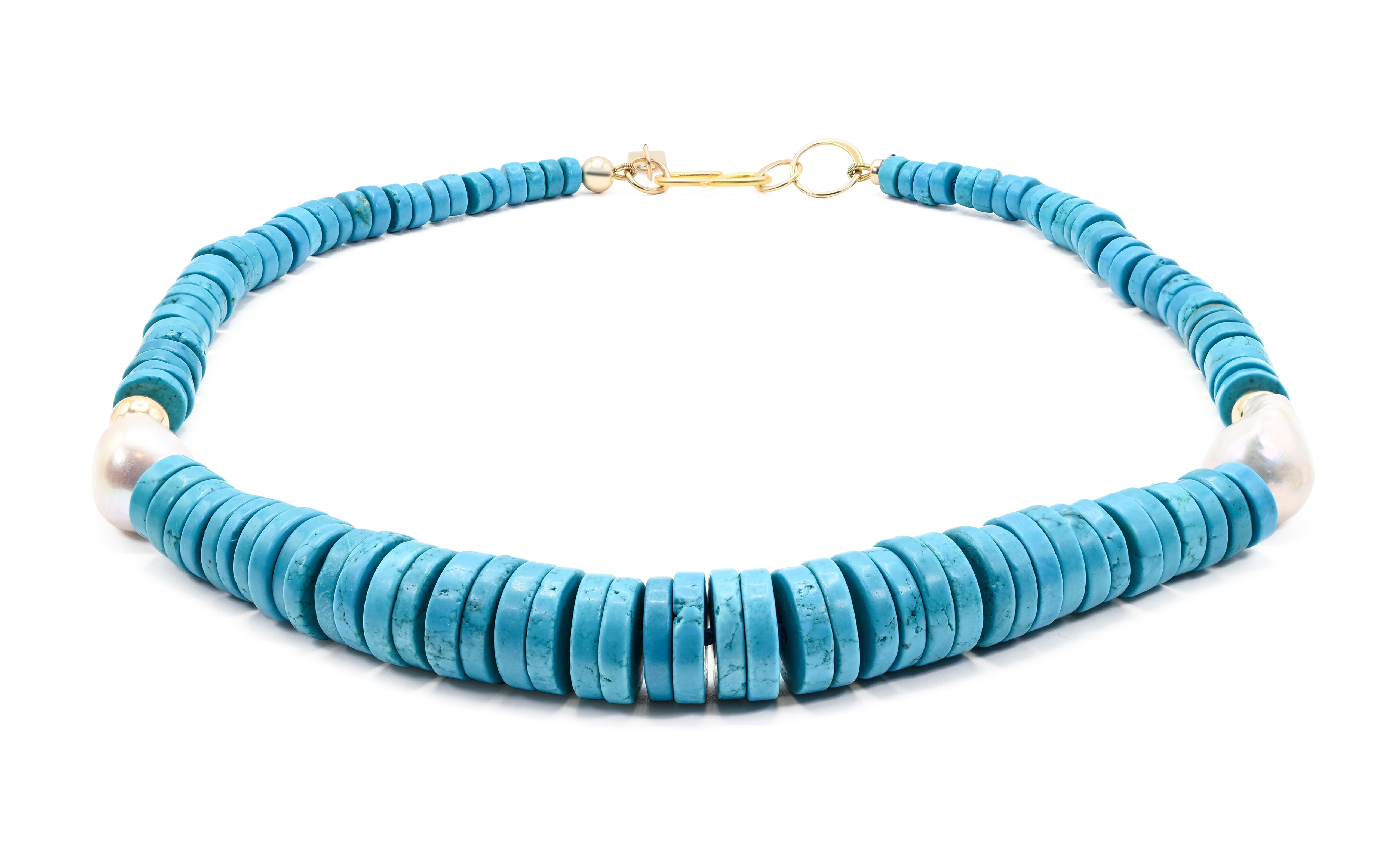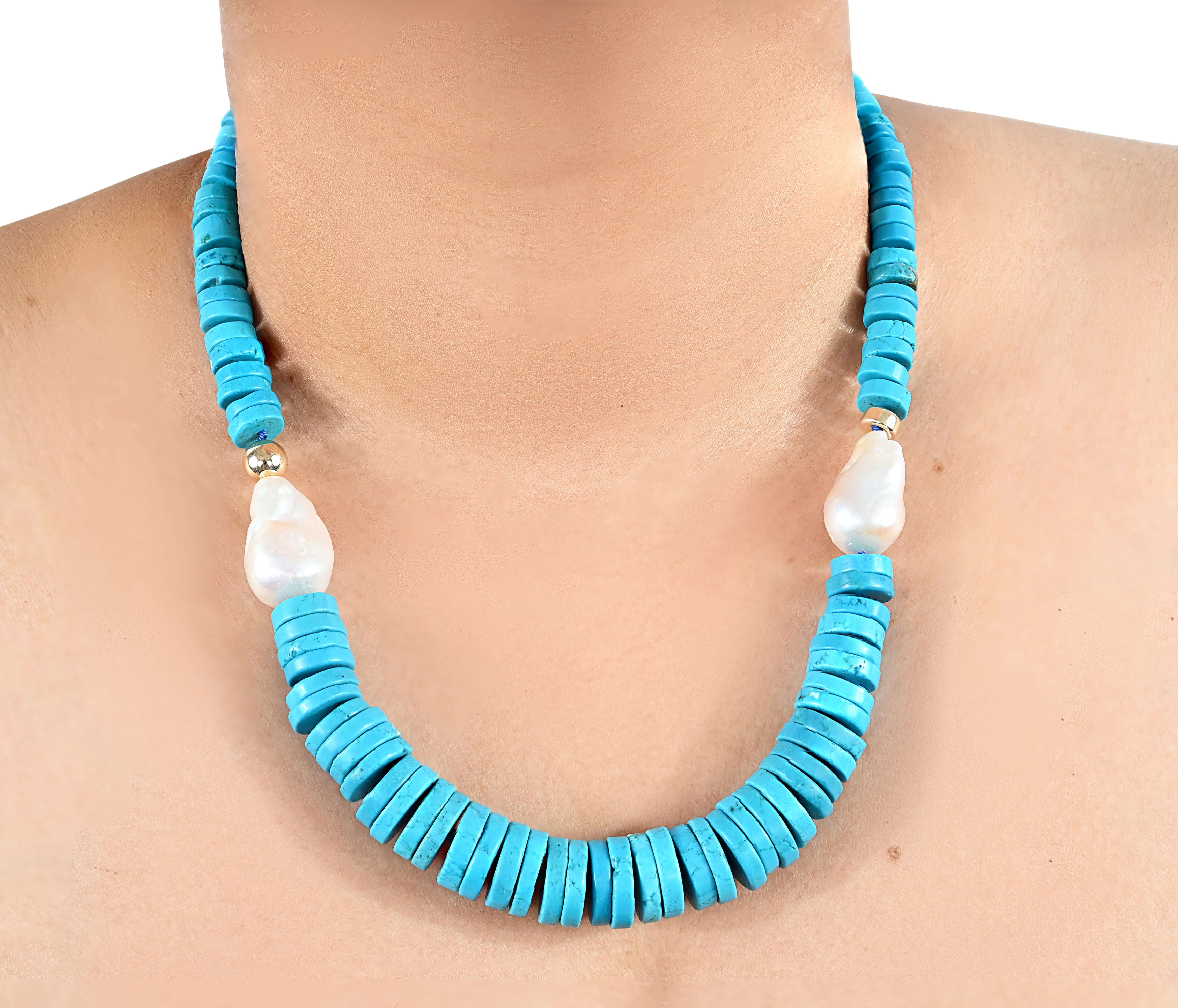 Introducing our exquisite Large Stabilized Turquoise Heshi and Large Baroque Pearl Necklace, a statement piece that seamlessly blends natural elegance with contemporary design. This stunning necklace features meticulously cut and polished turquoise heshi beads, renowned for their vibrant blue-green hue and exceptional stability, ensuring long-lasting beauty. Complementing the turquoise are opulent large baroque pearls, each uniquely shaped, adding a touch of organic sophistication to the piece. The interplay of the smooth, lustrous pearls and the earthy, textured turquoise creates a harmonious balance, making this necklace a versatile addition to any jewelry collection. Perfect for both special occasions and everyday wear, this necklace is a testament to timeless style and artisanal craftsmanship.