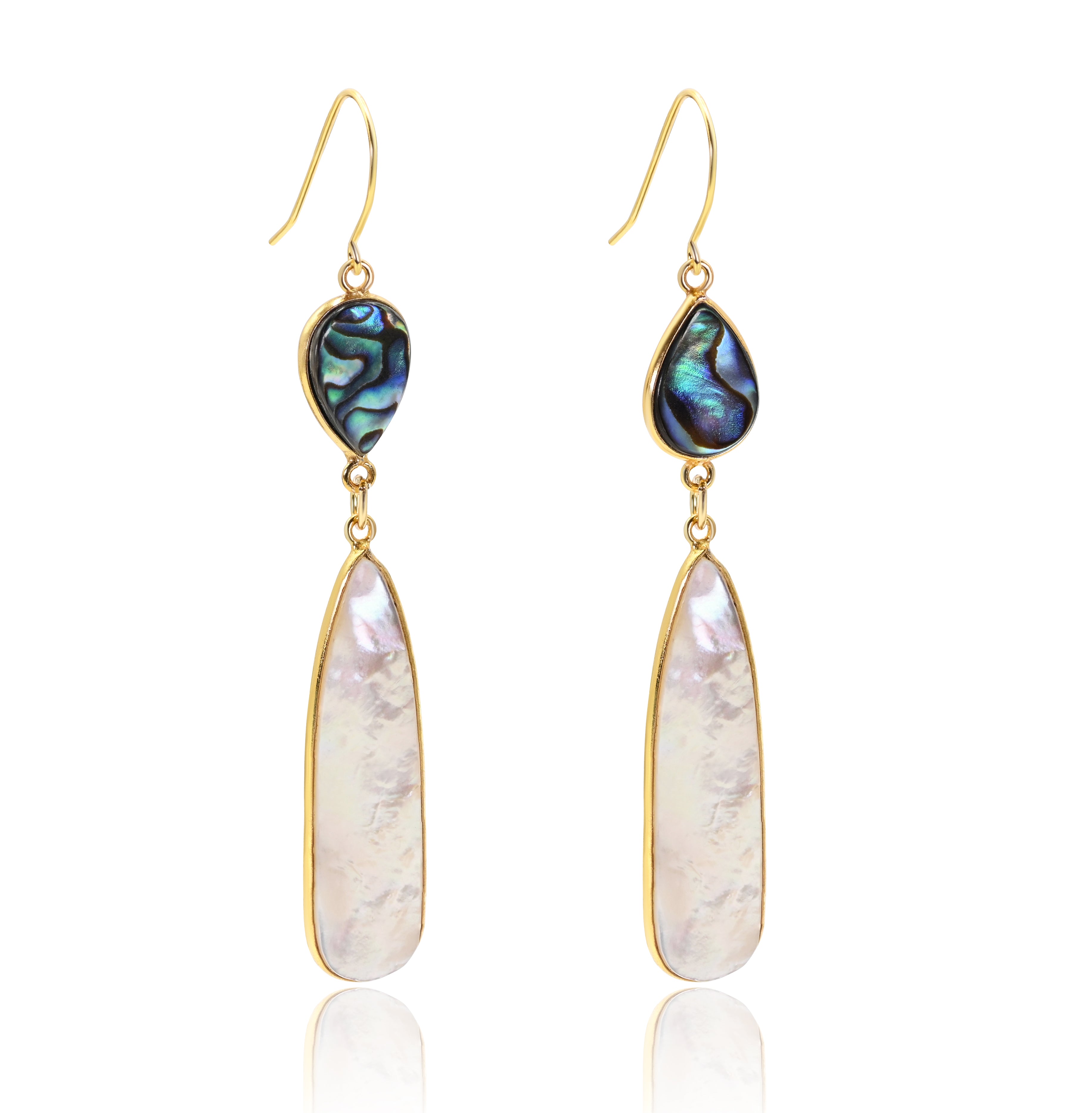Mother of pearl abalone long teardrop earrings are a stunning addition to any jewelry collection, renowned for their iridescent beauty and unique design. Crafted from the inner shell layer of abalone, these earrings capture the ocean's mesmerizing hues of blues, greens, and purples. The teardrop shape elongates the neck, providing a graceful and elegant look perfect for both casual and formal occasions. Set in sterling silver or gold, the mother of pearl abalone creates a striking contrast, enhancing its natural luminescence. These earrings are not only a fashion statement but also a celebration of nature's artistry, making them a treasured accessory for any wearer.