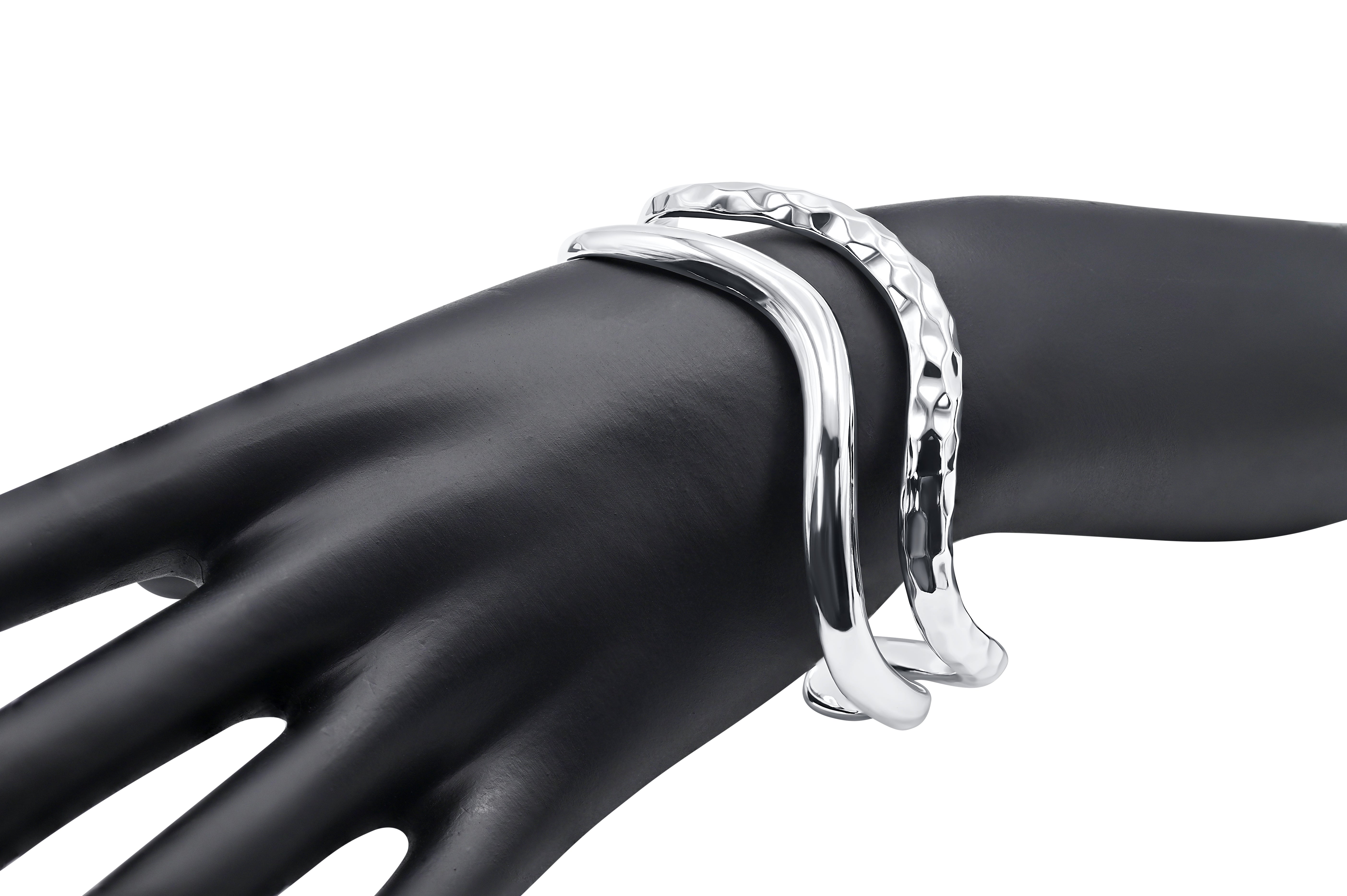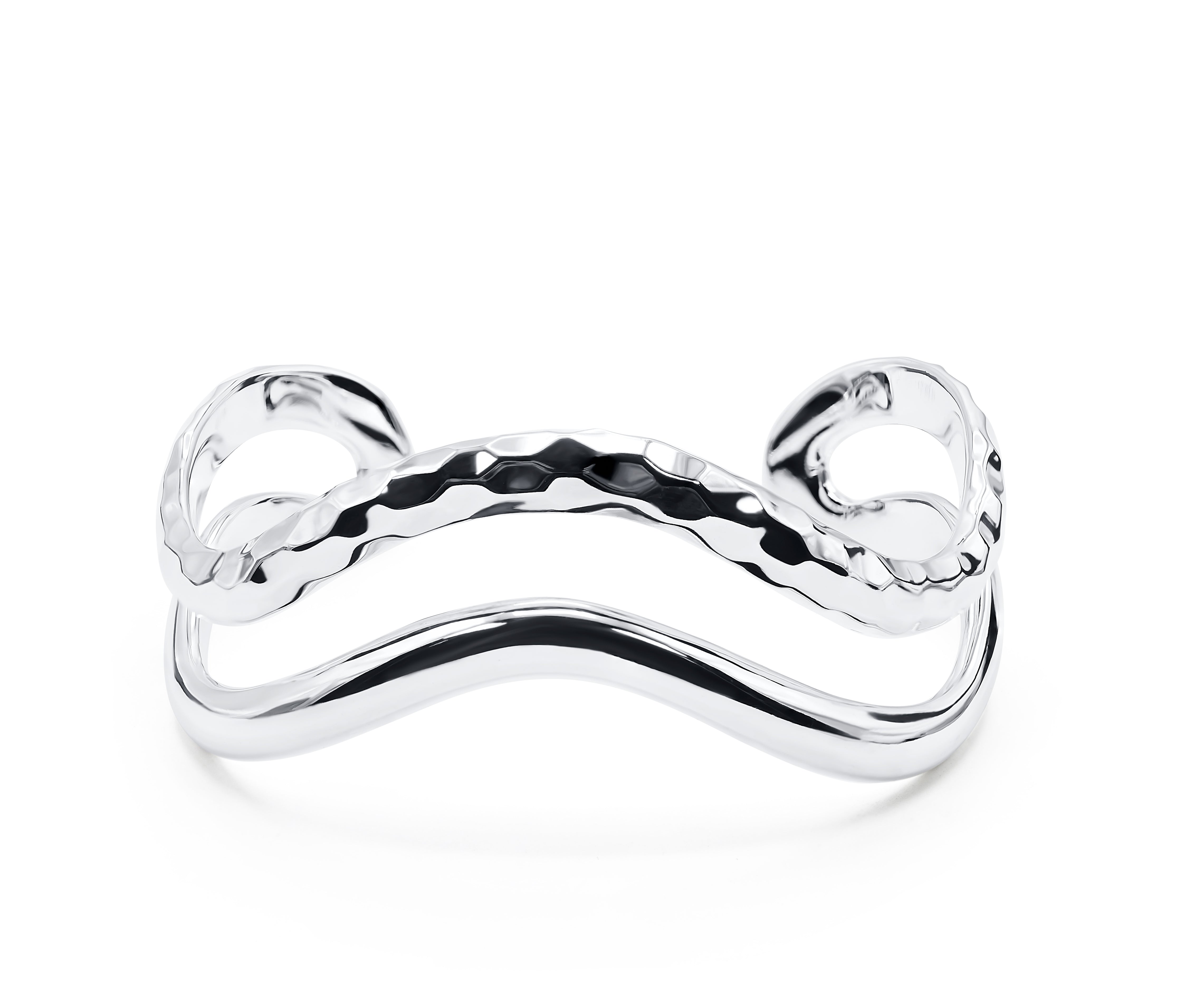 Inspired by the beach and its soothing waves, this stunning bracelet cuff captures the essence of the vibrant Manhattan Beach shoreline in a gorgeous piece of jewelry. This silver bangle features a beautifully dimensional design mimicking oceanic waves as they crash onto the sun-kissed sand, highlighting the 3D effect with its luxurious shine.