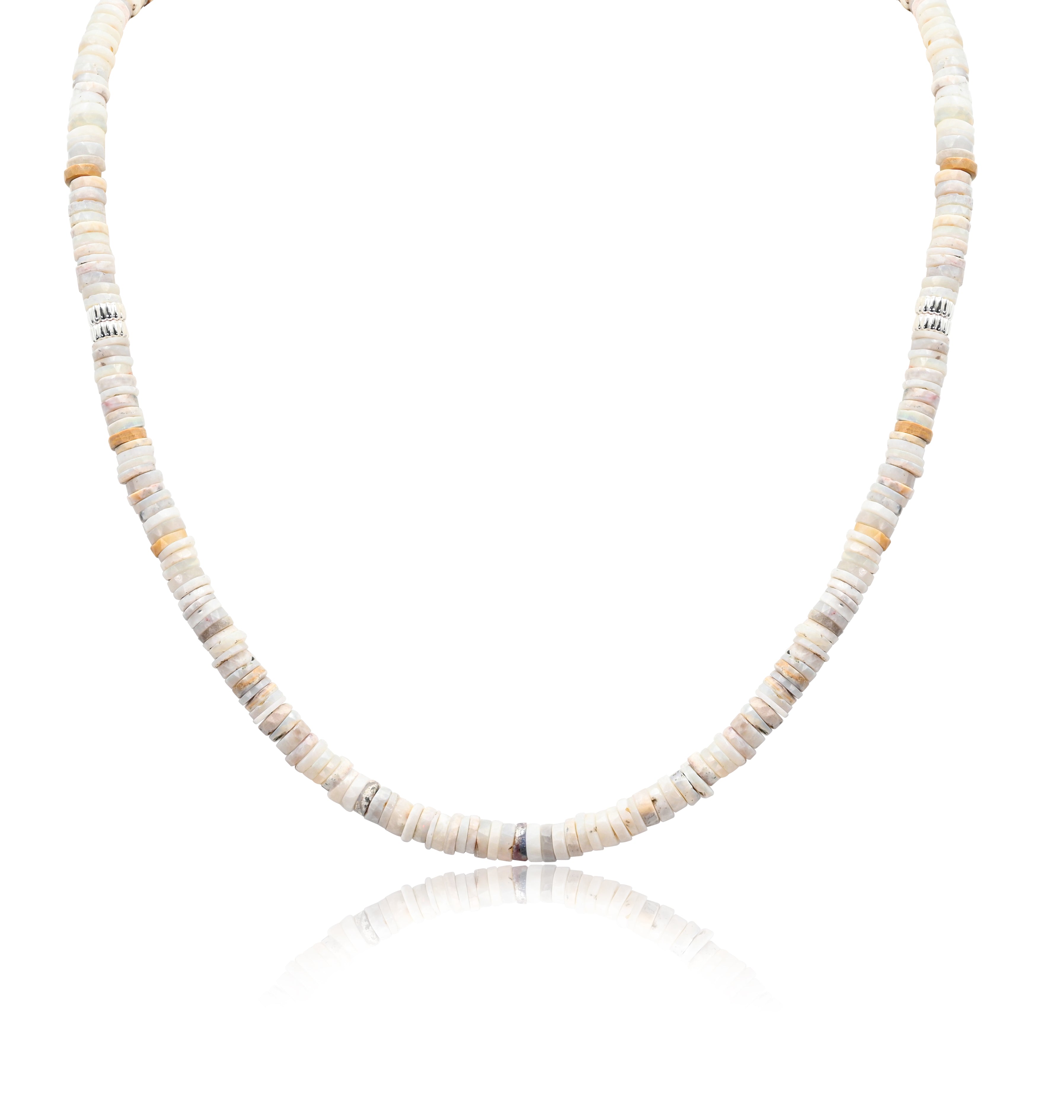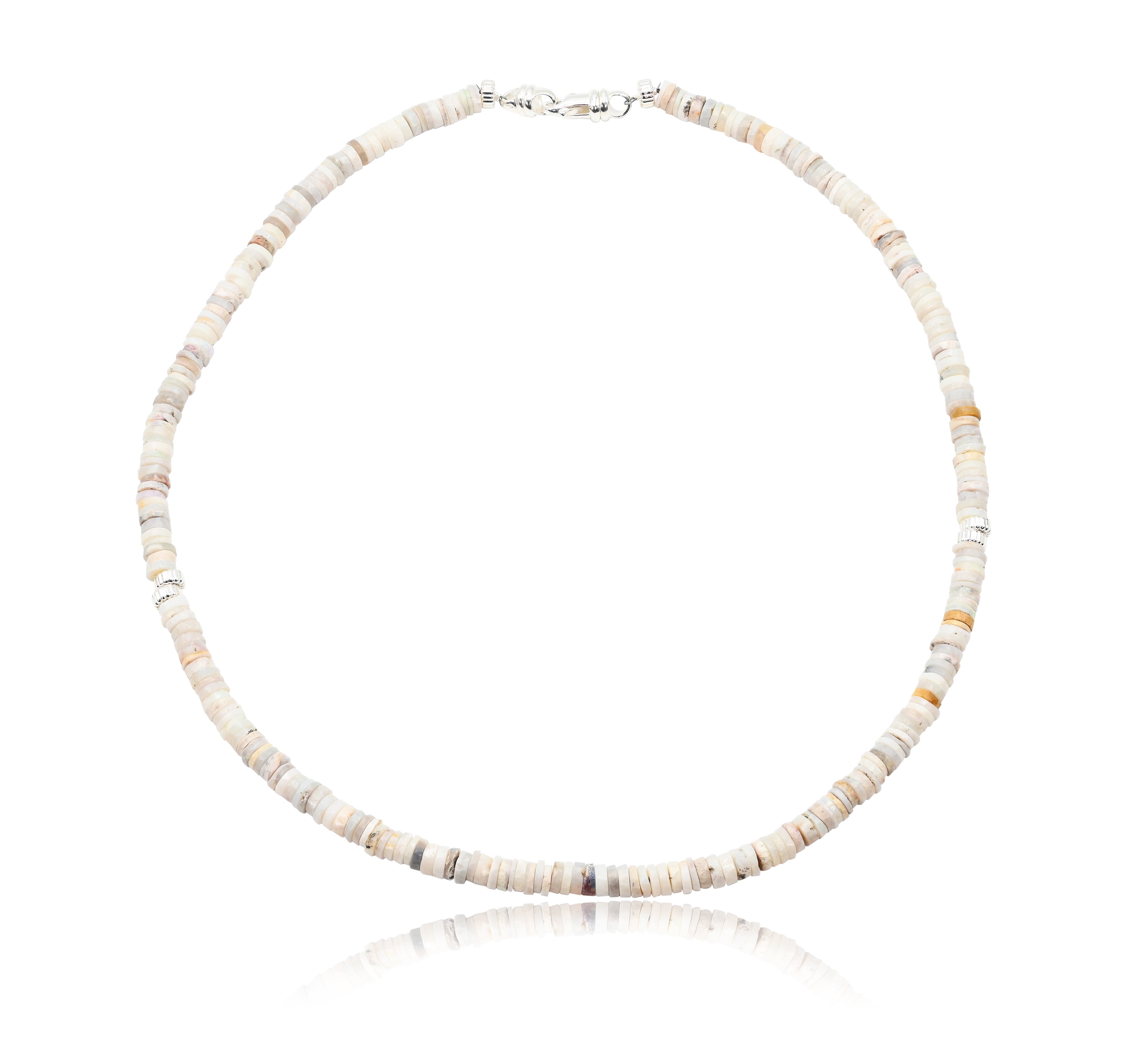 A men's opal heshi sterling silver beads necklace is a stunning piece of jewelry that combines the unique beauty of opal with the elegance of sterling silver. Opal, known for its mesmerizing play of color, adds a vibrant and dynamic element to the necklace, making it stand out as a focal point. The heshi beads, typically flat and disc-shaped, provide a textured contrast to the smooth, polished silver beads, creating a balanced and sophisticated look. Sterling silver, celebrated for its durability and luster, complements the opal beads by adding a timeless and refined touch. This necklace is not only a stylish accessory but also a versatile piece that can be worn for both casual and formal occasions, making it a must-have addition to any man's jewelry collection.