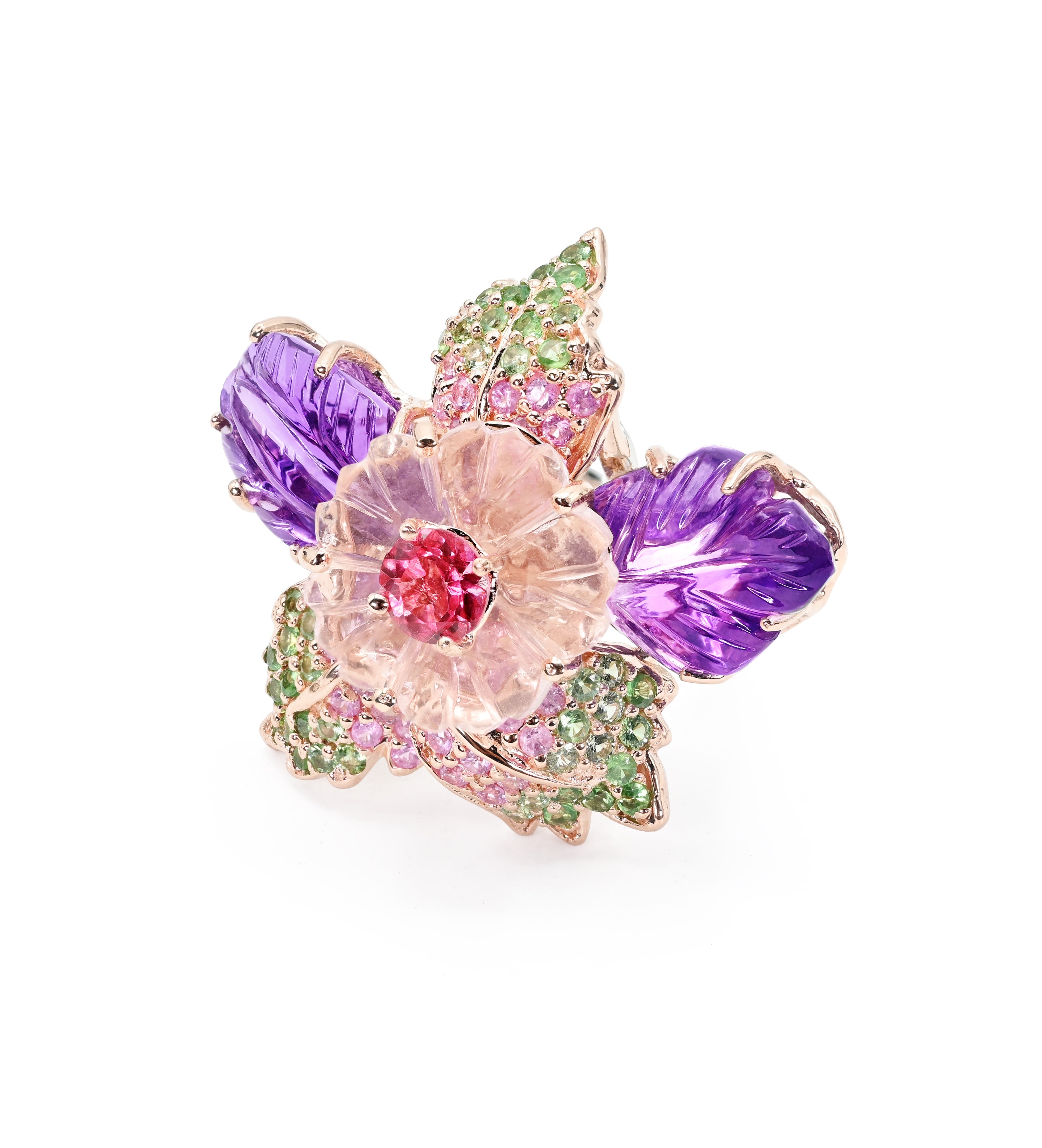 Pink flowers are always in bloom with this breathtaking cocktail ring, created to complement every special shade of pink. Various gemstones arranged in a dimensional flower cluster and carved stones bring new meaning to the beauty of a floral garden, all set on a brightly polished band.