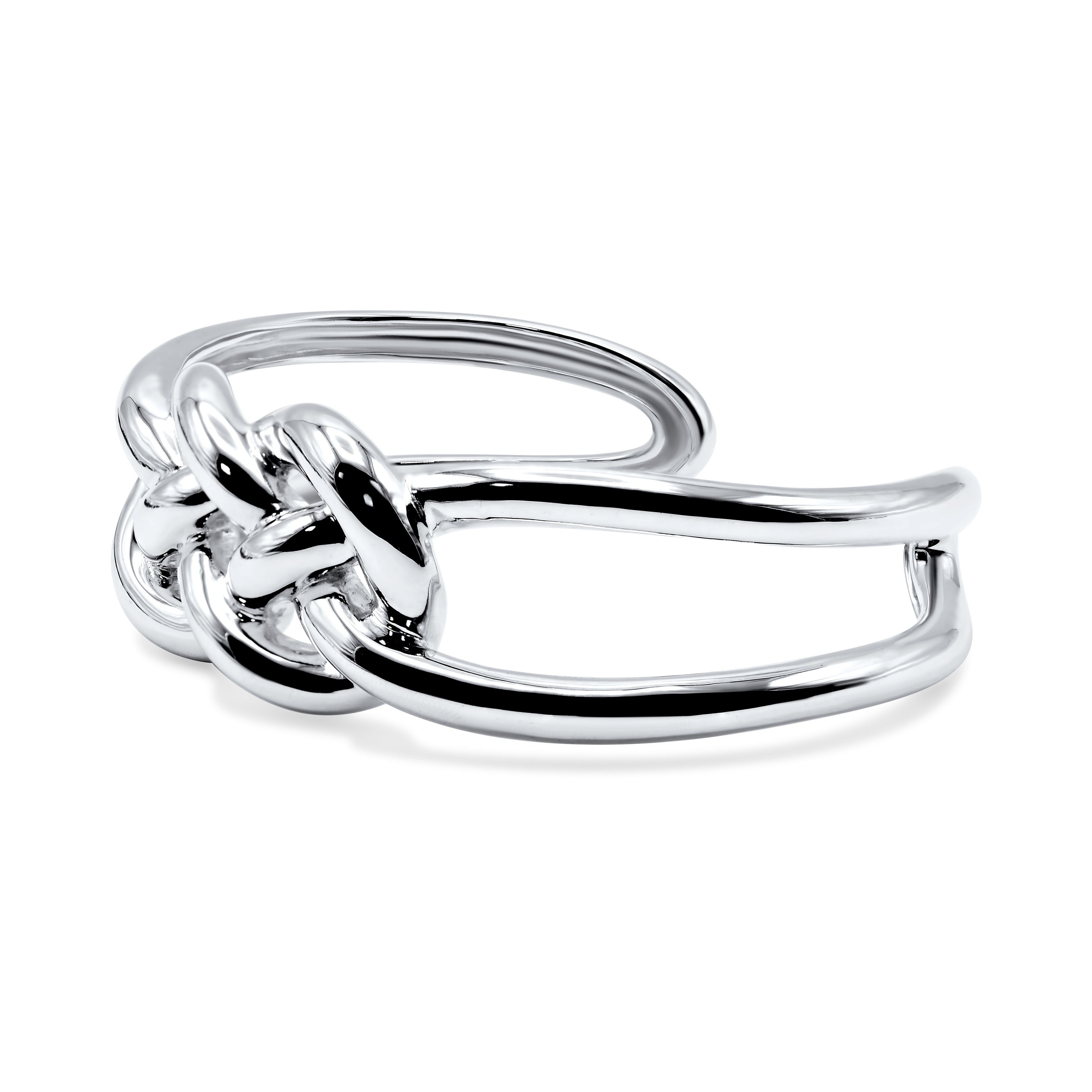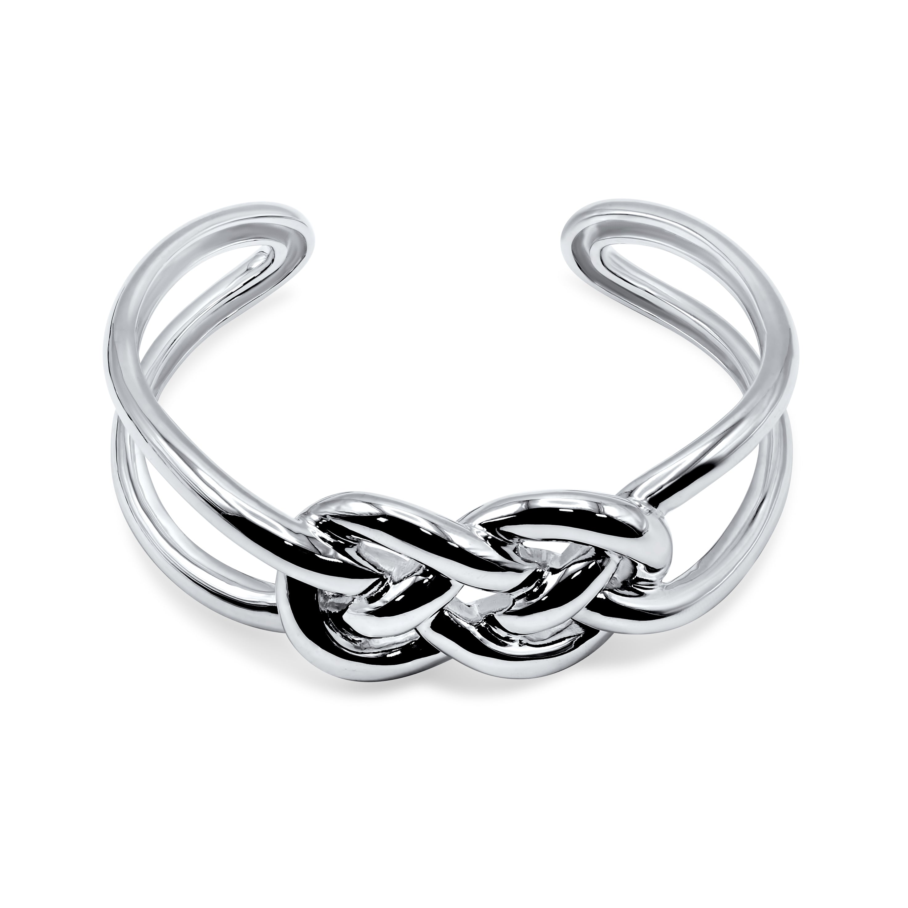 Gift this uniquely crafted sterling silver bracelet to any loved one, a sentiment of fond memories of time spent together, with the infinity love knot on the top. Repeating silver rows on the love knot give it a pretzel effect, adding an airy ambiance on the wrist. Two rows of silver with an opening on the back add to the modern elegance of this silver bangle cuff.
