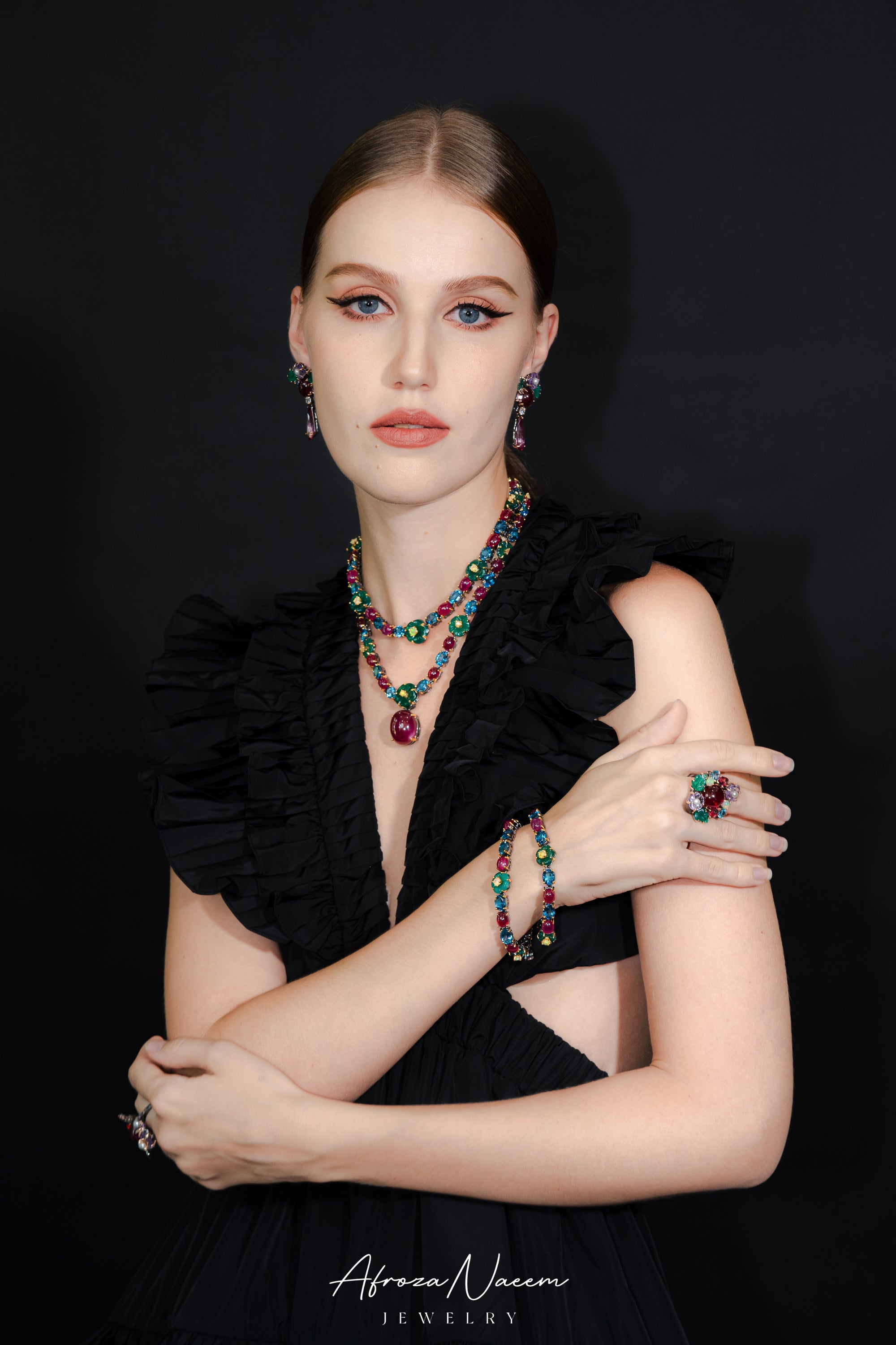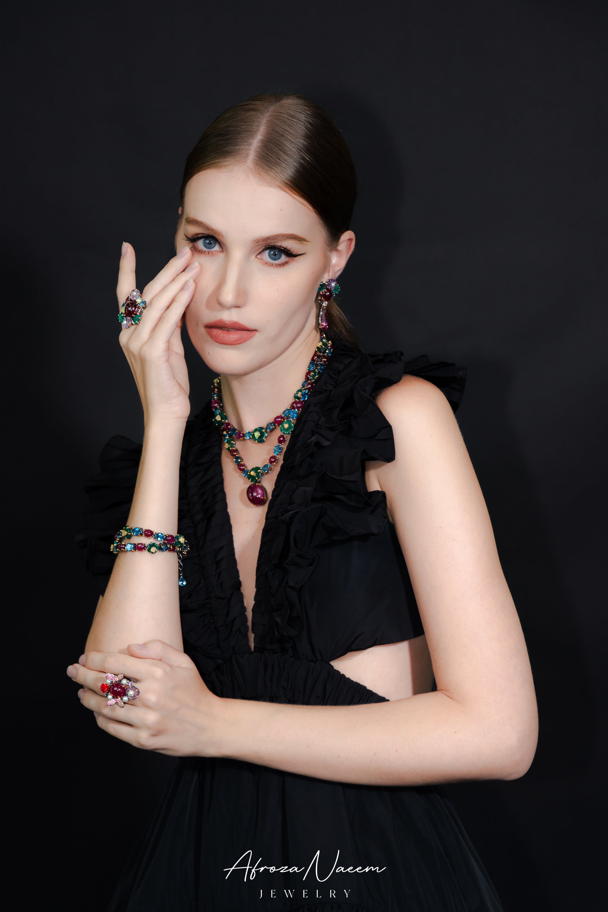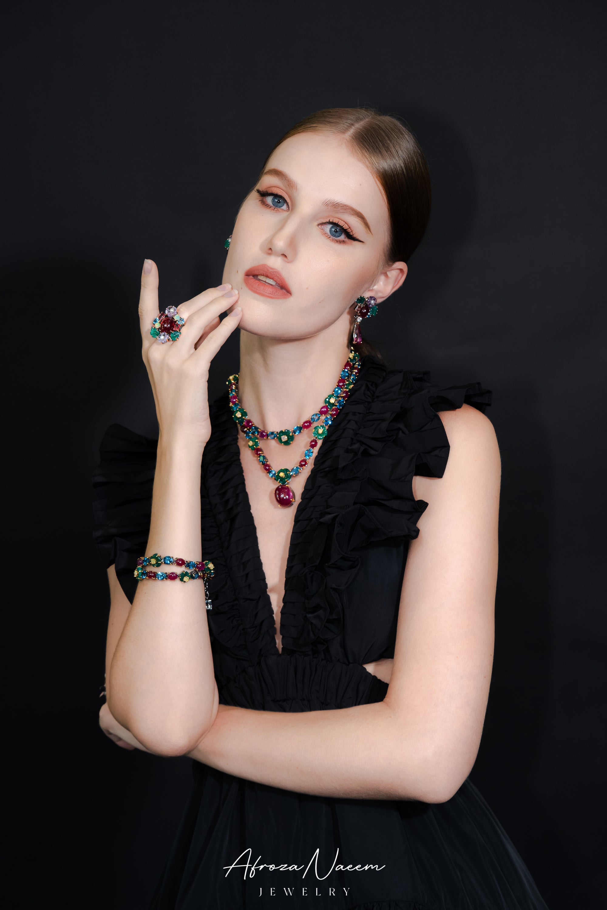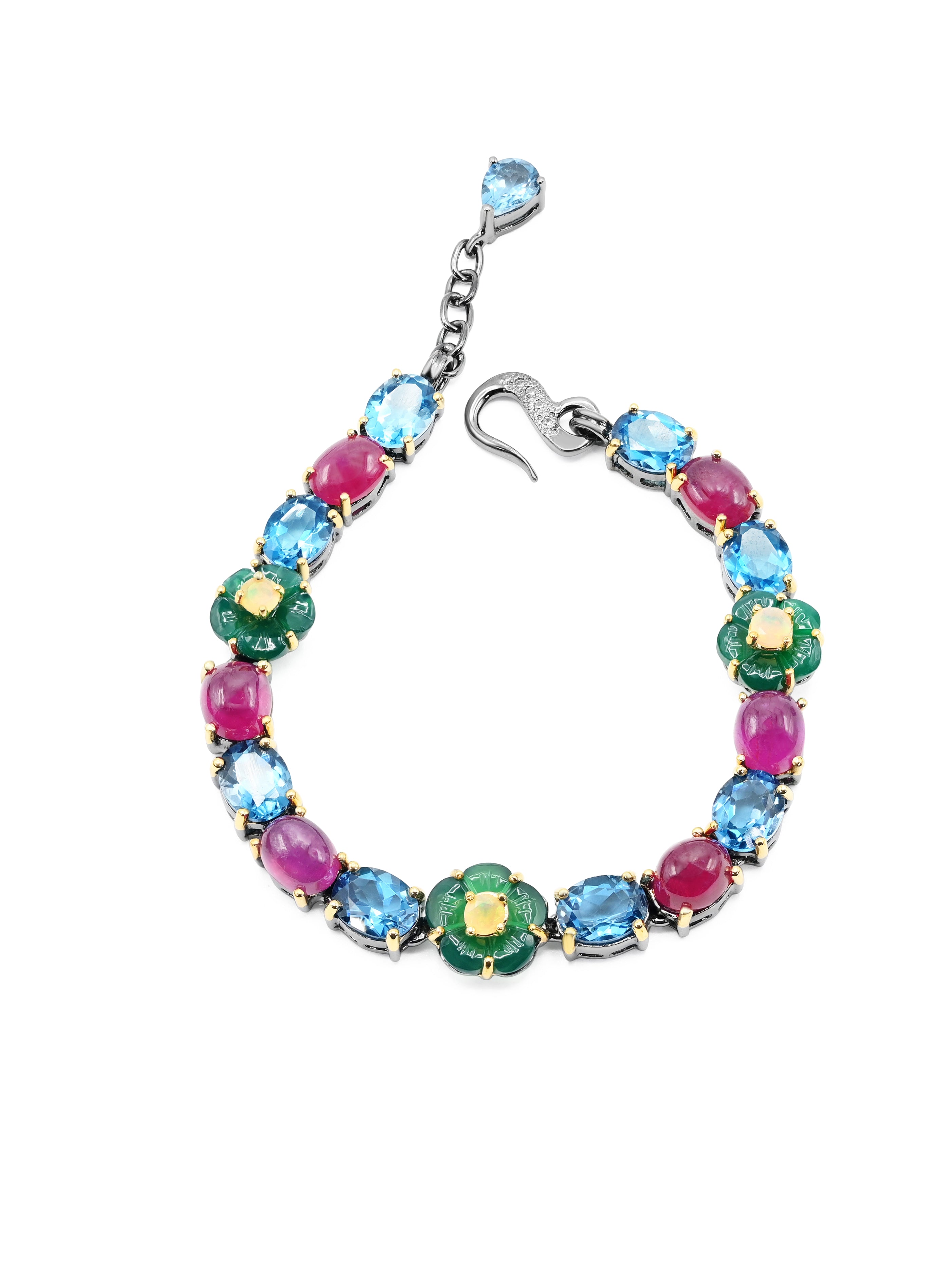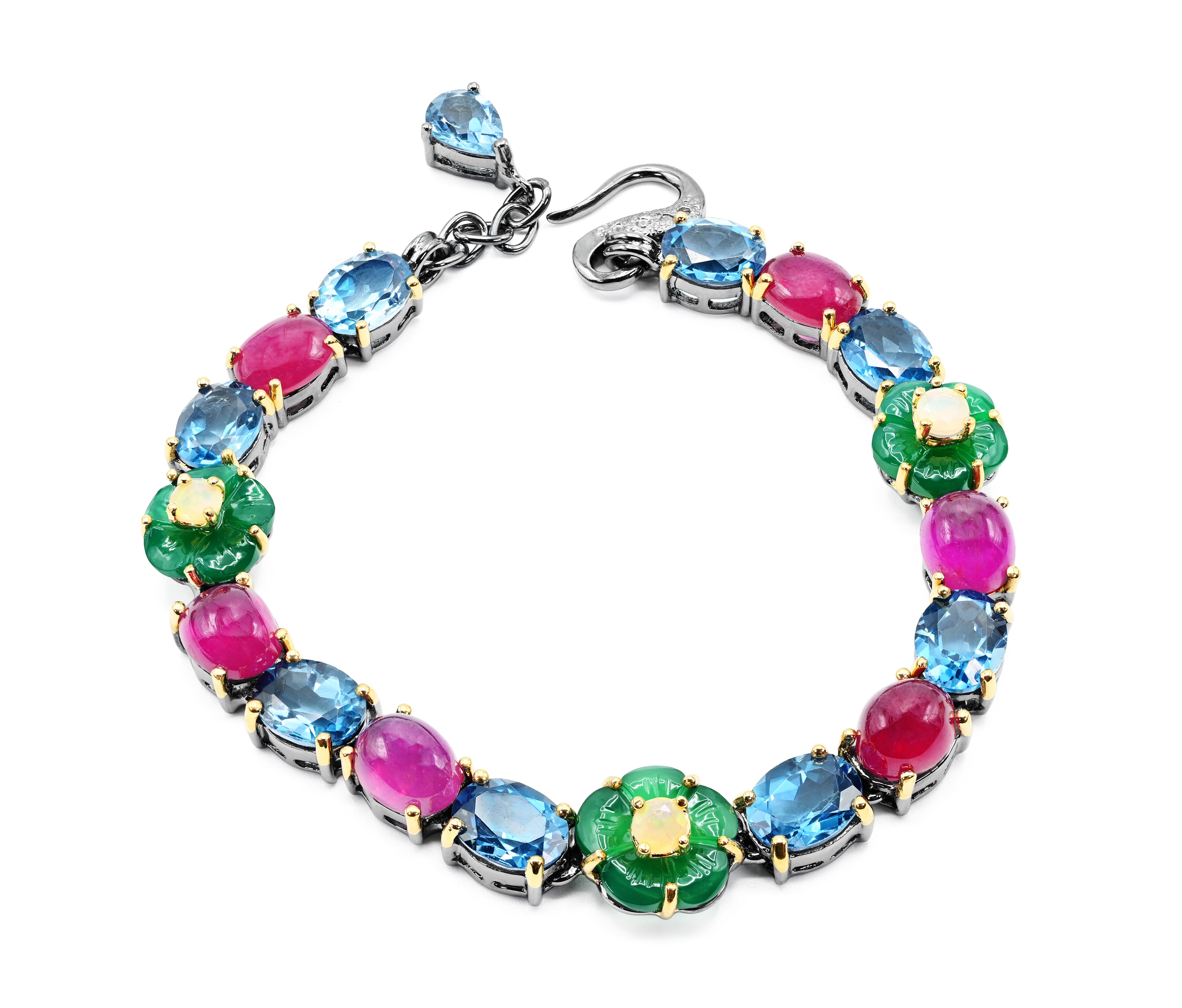 Gemstones: Ruby, Green Chalcedony, London Blue Topaz, Silver Black Rhodium and Vermeil Plating.