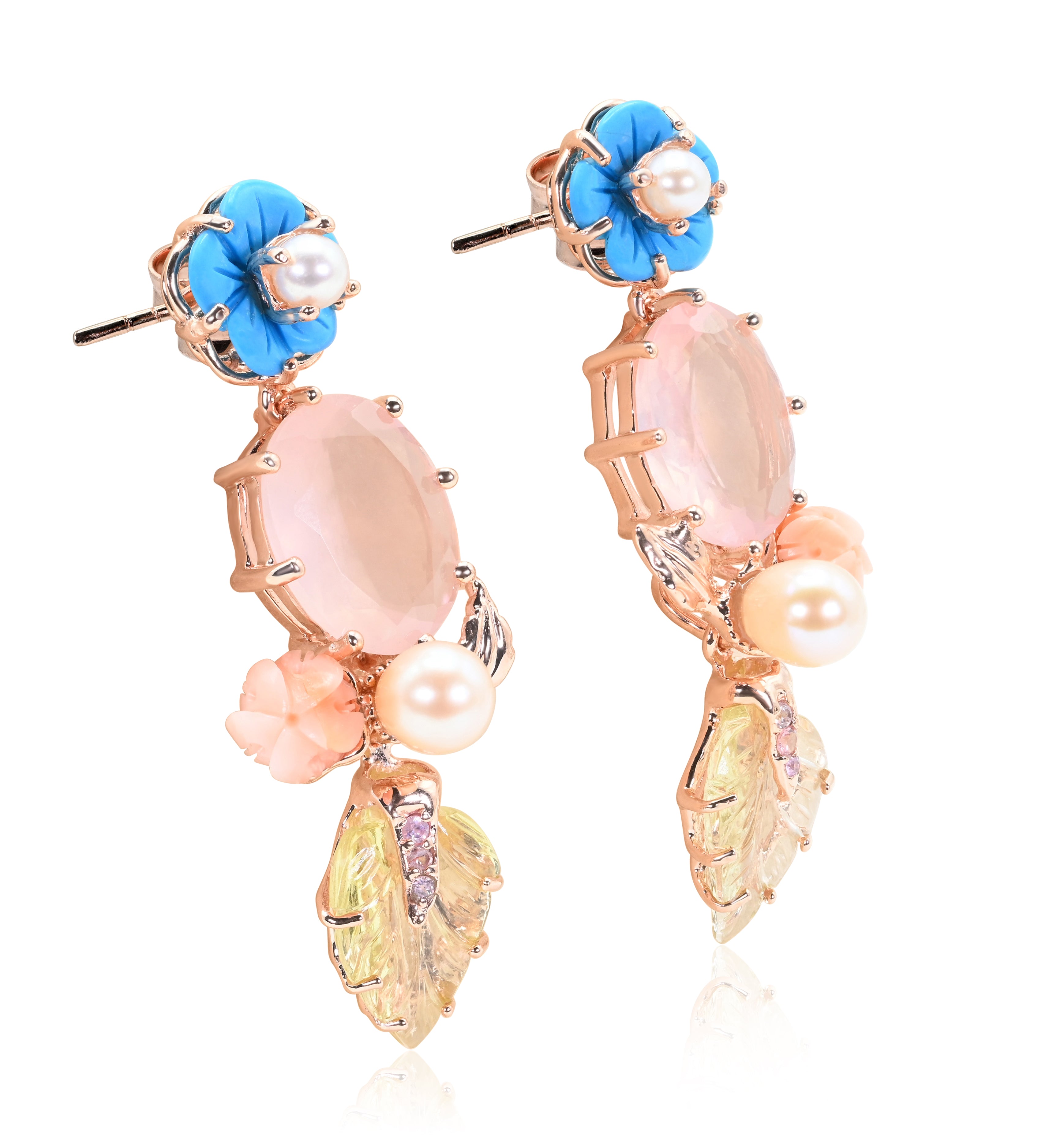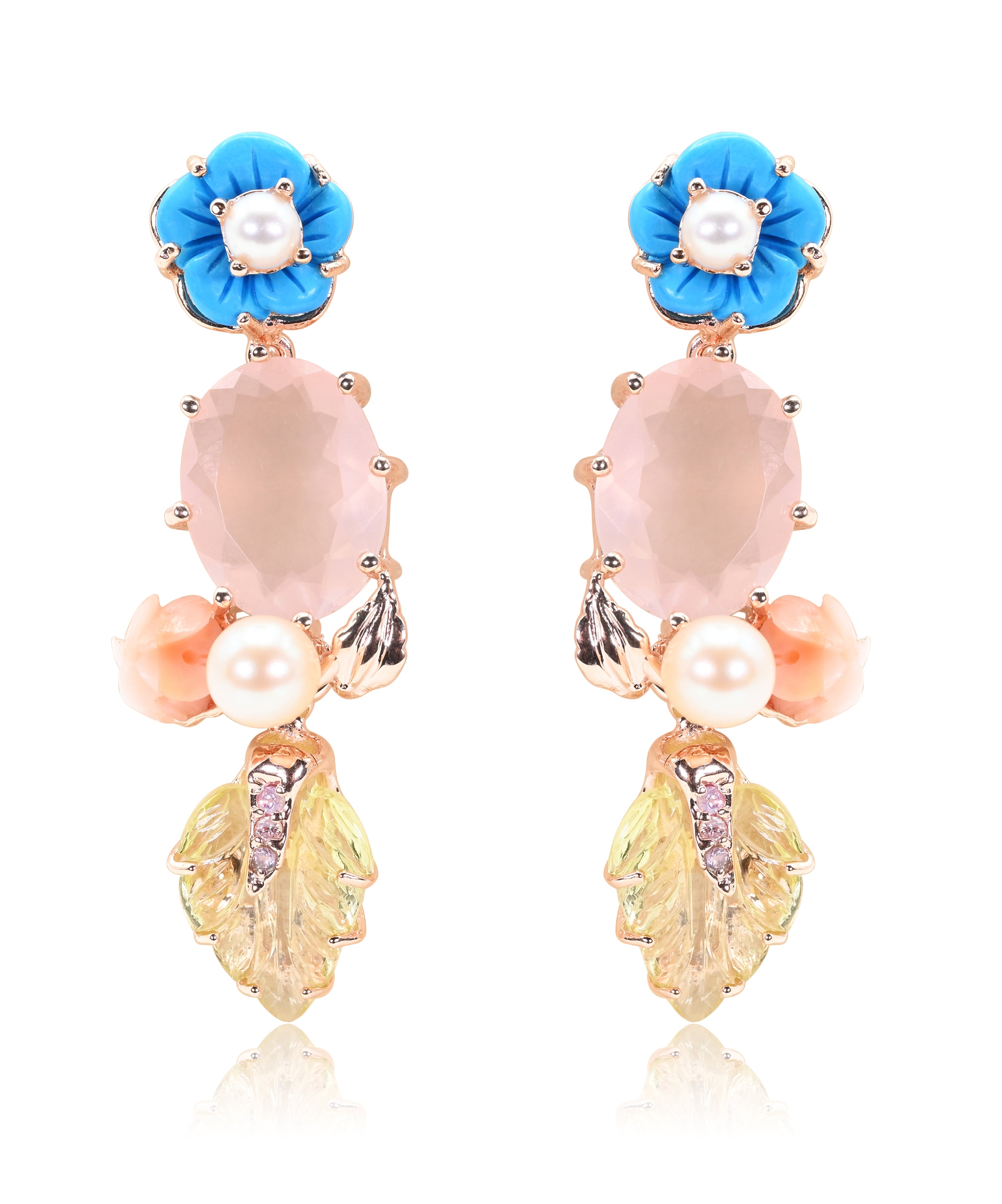 Elevate your elegance with these exquisite long drop earrings, crafted to captivate. Featuring a stunning top flower-shaped turquoise stone, the design flows seamlessly into a large, oval, faceted rose quartz centerpiece. The bottom showcases a carved, leaf-shaped lemon quartz accentuated with delicate pearls and shimmering pink sapphires for an added touch of sophistication.