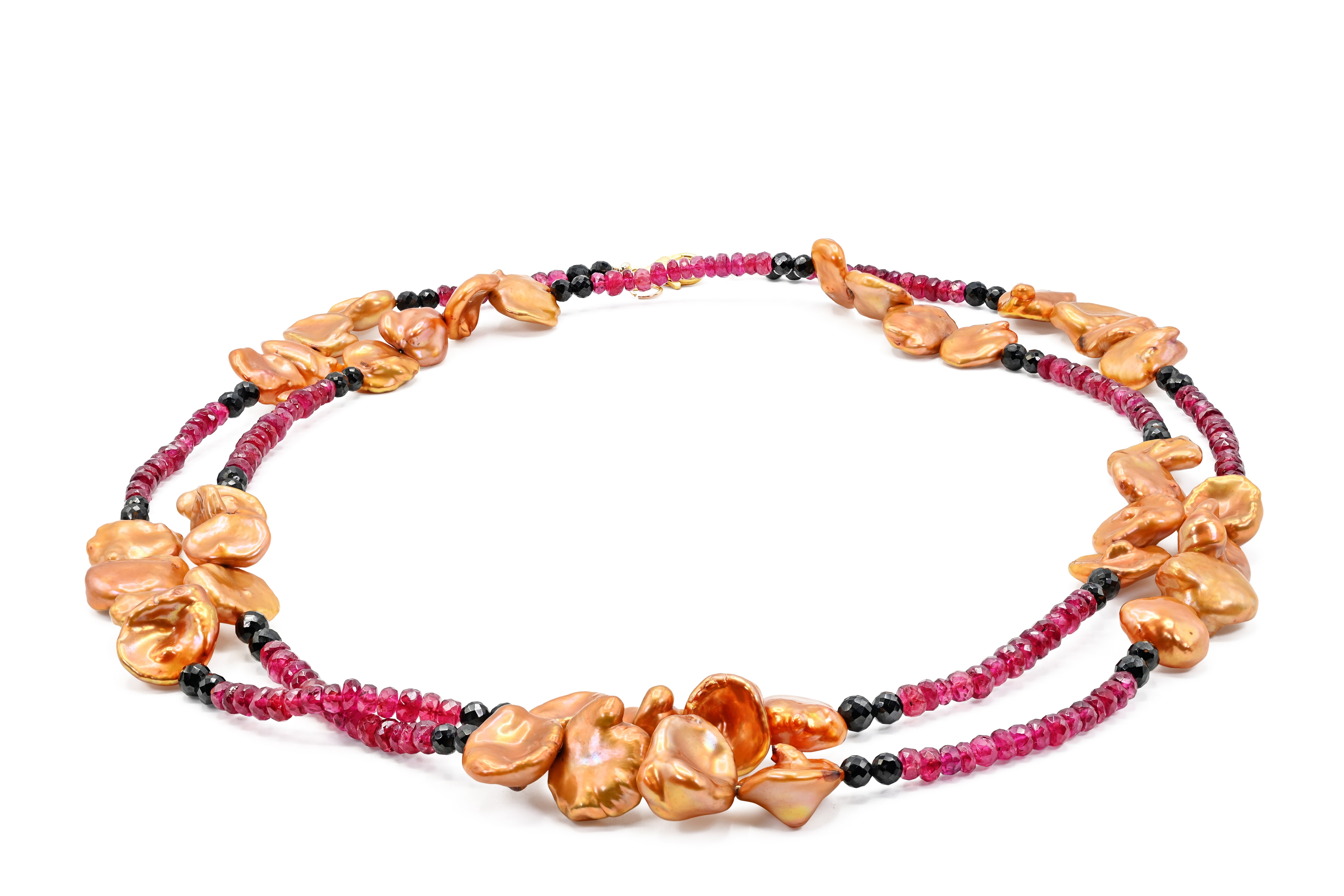 Introducing our exquisite 38" Keshi Large Golden Pearl Necklace, an epitome of elegance and sophistication. This stunning piece features lustrous golden Keshi pearls, each boasting a unique, organic shape that reflects their natural beauty. Complementing the pearls are vibrant black spinel and faceted red garnet beads, meticulously arranged to create a captivating contrast and an air of opulence. The necklace is a versatile 38 inches in length, allowing it to be worn as a single long strand or doubled for a layered look. Perfect for adding a touch of luxury to any outfit, this necklace is an exceptional choice for both special occasions and everyday elegance. Embrace timeless beauty and make a statement with this breathtaking accessory.