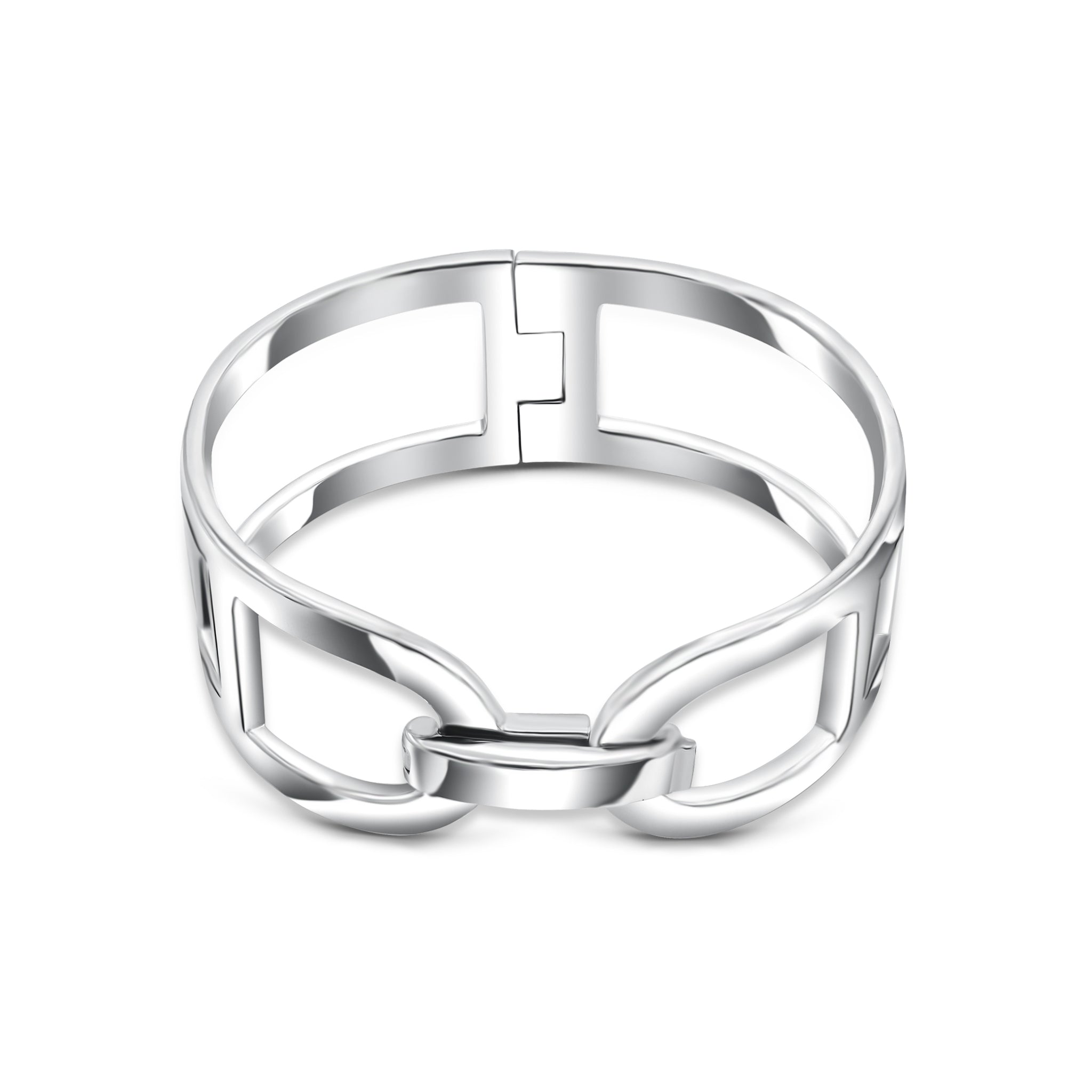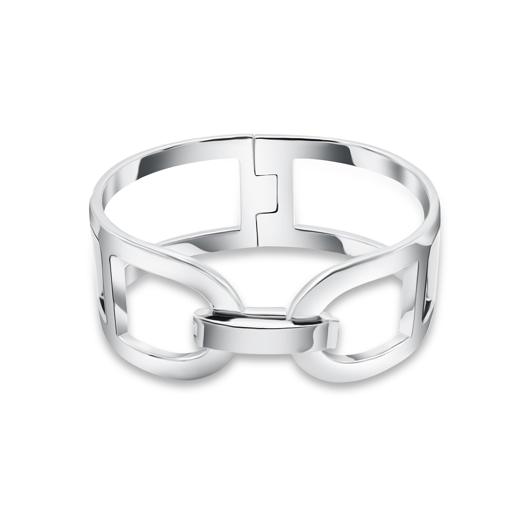 Make bold moves with this brightly polished sterling silver bangle, featuring a luxuriously wide open link design with smooth edges and a hinge on the bottom for maximum comfort. Finish your look with this shiny bracelet, perfect for adding a glamorous detail to any wardrobe, any time, and for any occasion.