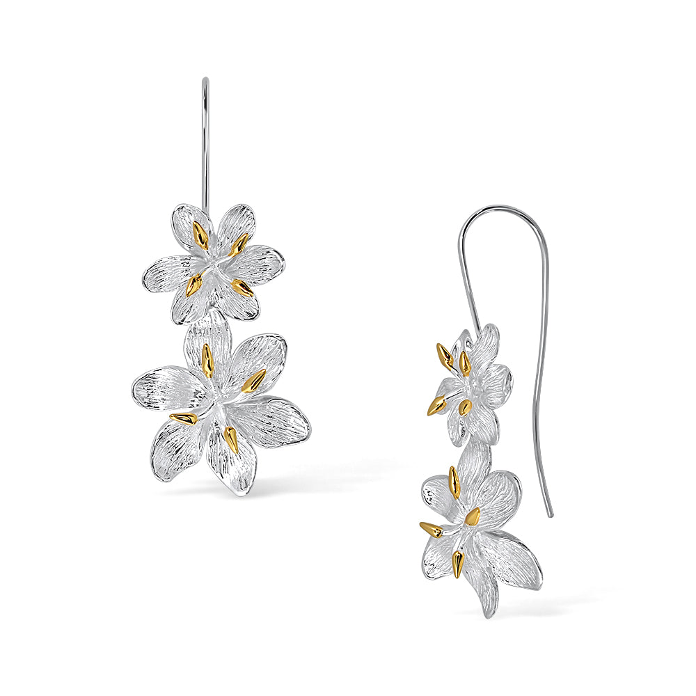Sterling Silver Double Drop Flower Silver And 18K Gold Plated With E-Coating Earrings