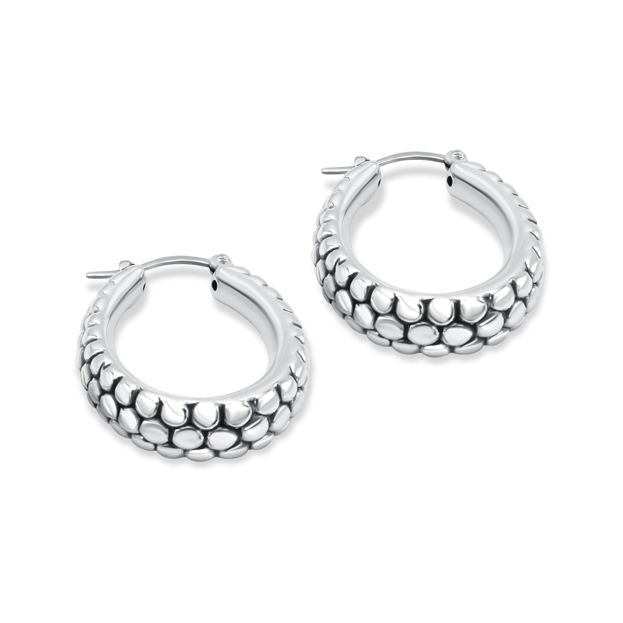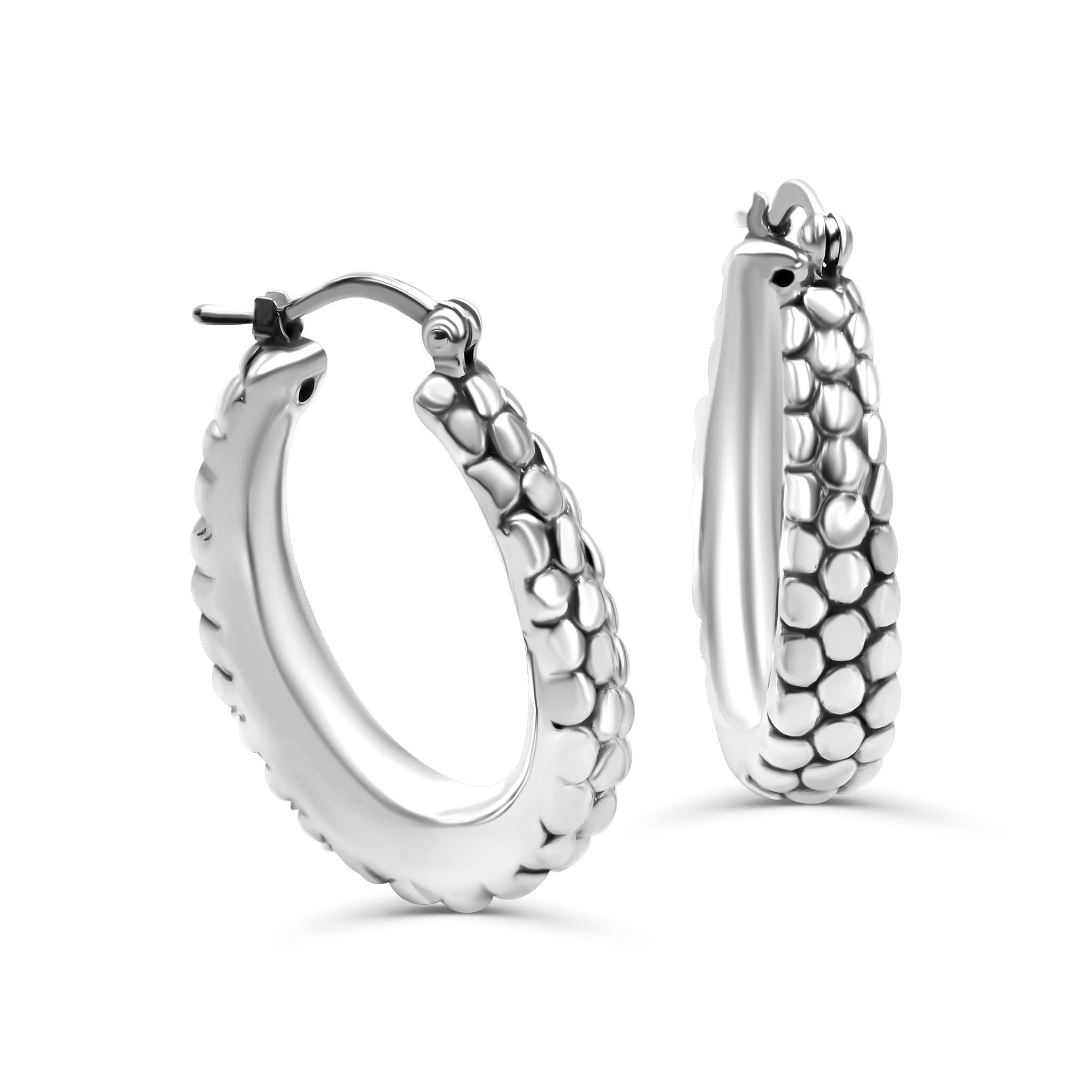 These majestic sterling silver oval hoops are inspired by the magic of a serpent and reimagined into wearable art with stunning detail and beautiful texture. A smooth finish inside each hoop adds comfort to this glamorous pattern on the exterior. Click top posts keep these earrings secure, creating swing and movement when worn as they dangle from the ears.