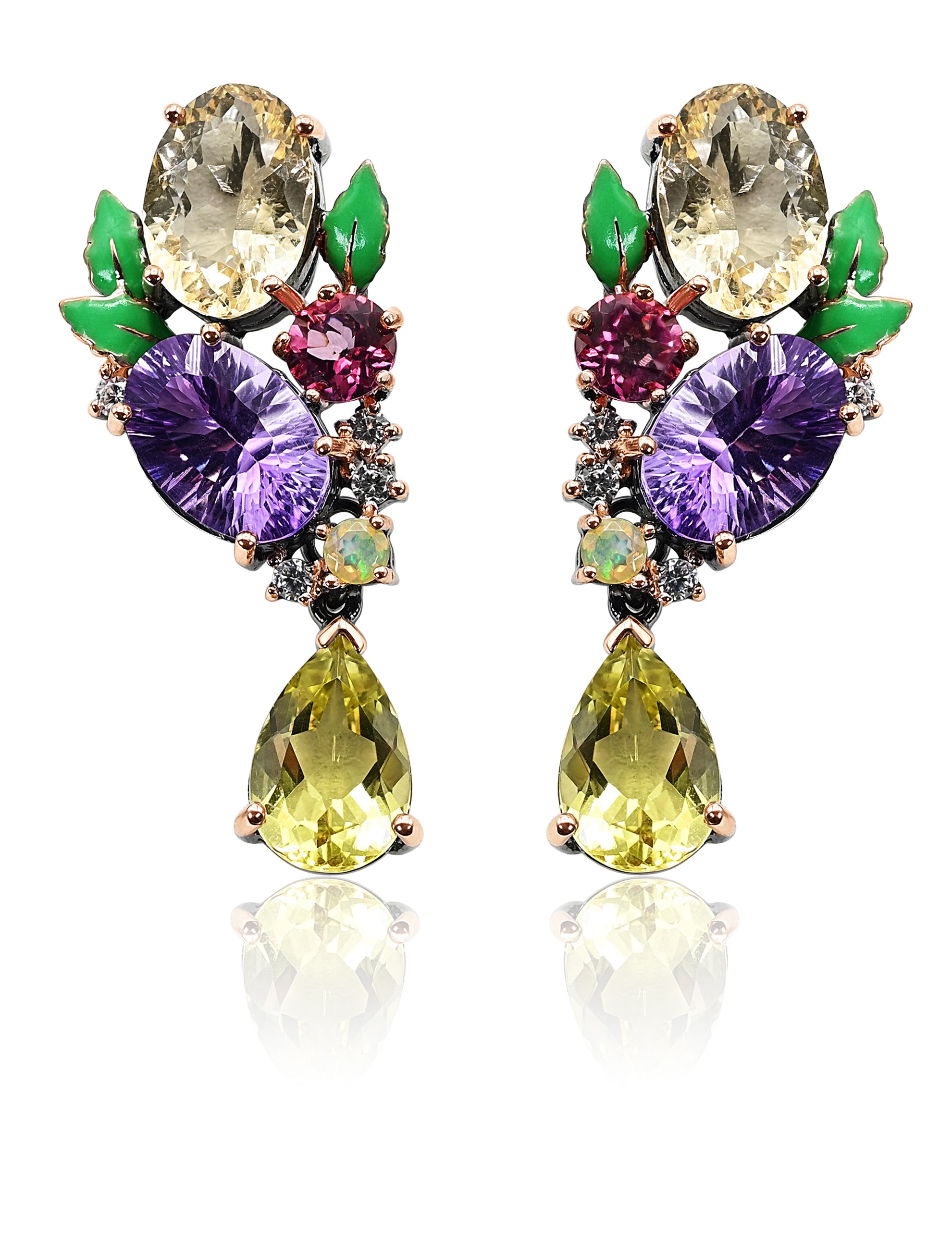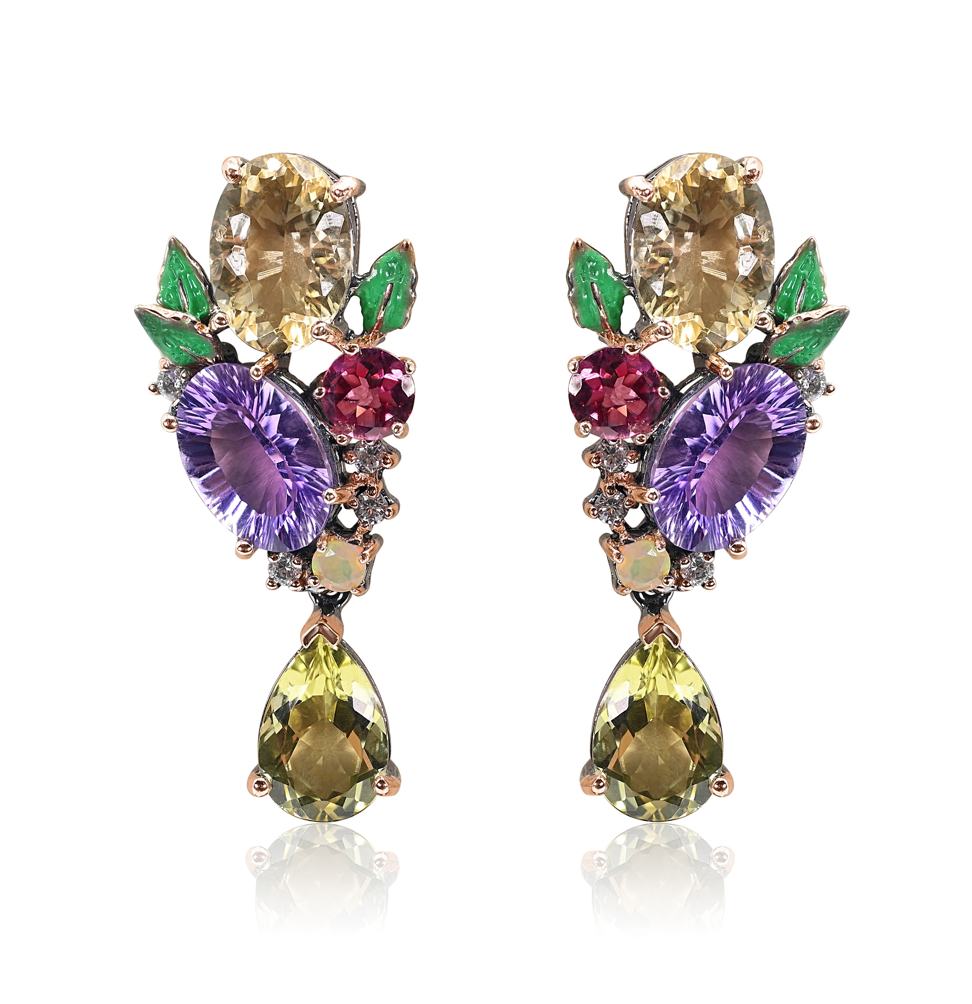 Citrine and lemon quartz bring the vibrancy of the sun to these exquisite dangle earrings, featuring an artistic display of gemstones arranged in a floral bouquet. Starburst amethyst and other gemstones arranged in a gorgeous corsage cluster highlight the workmanship of these formal drop earrings.