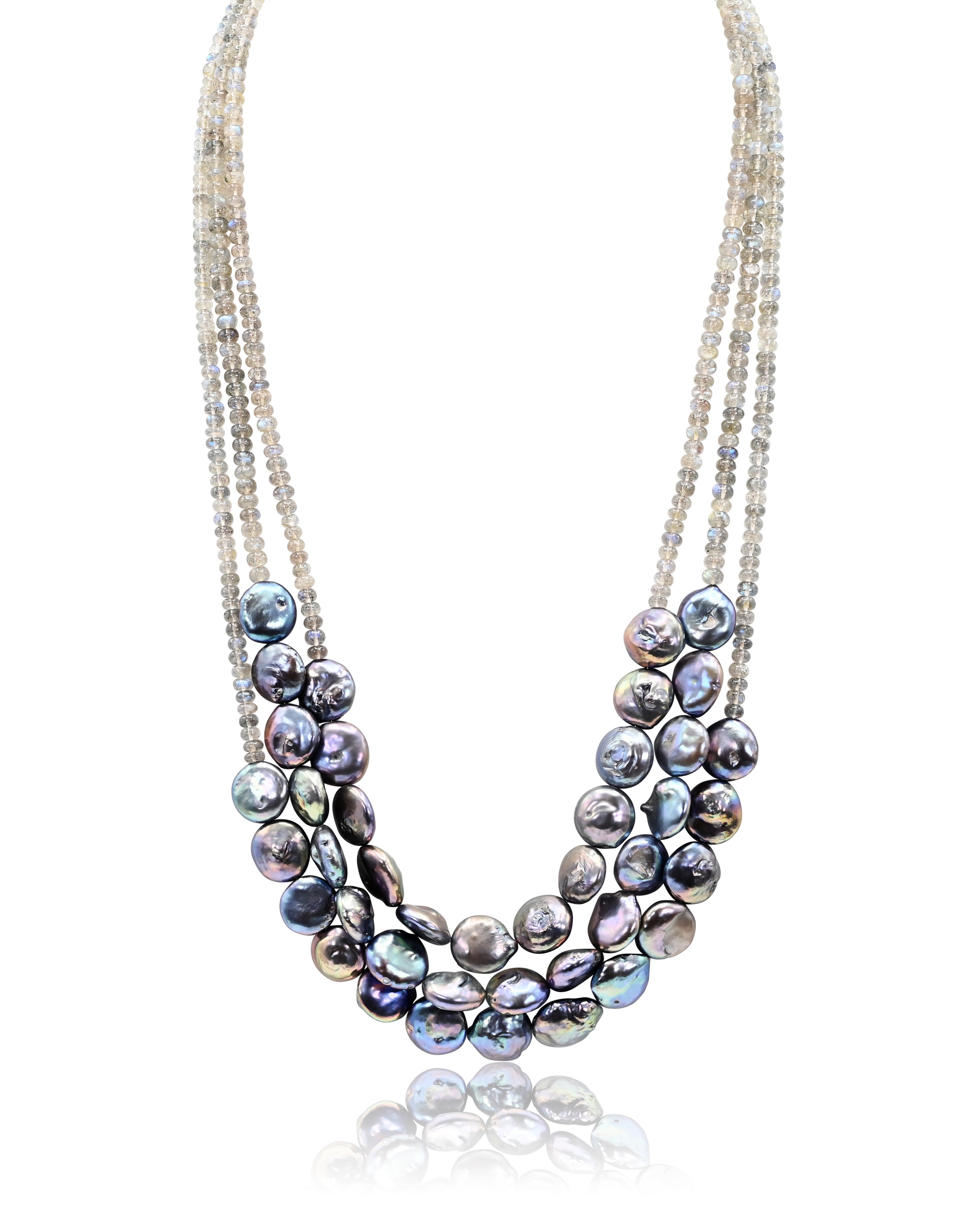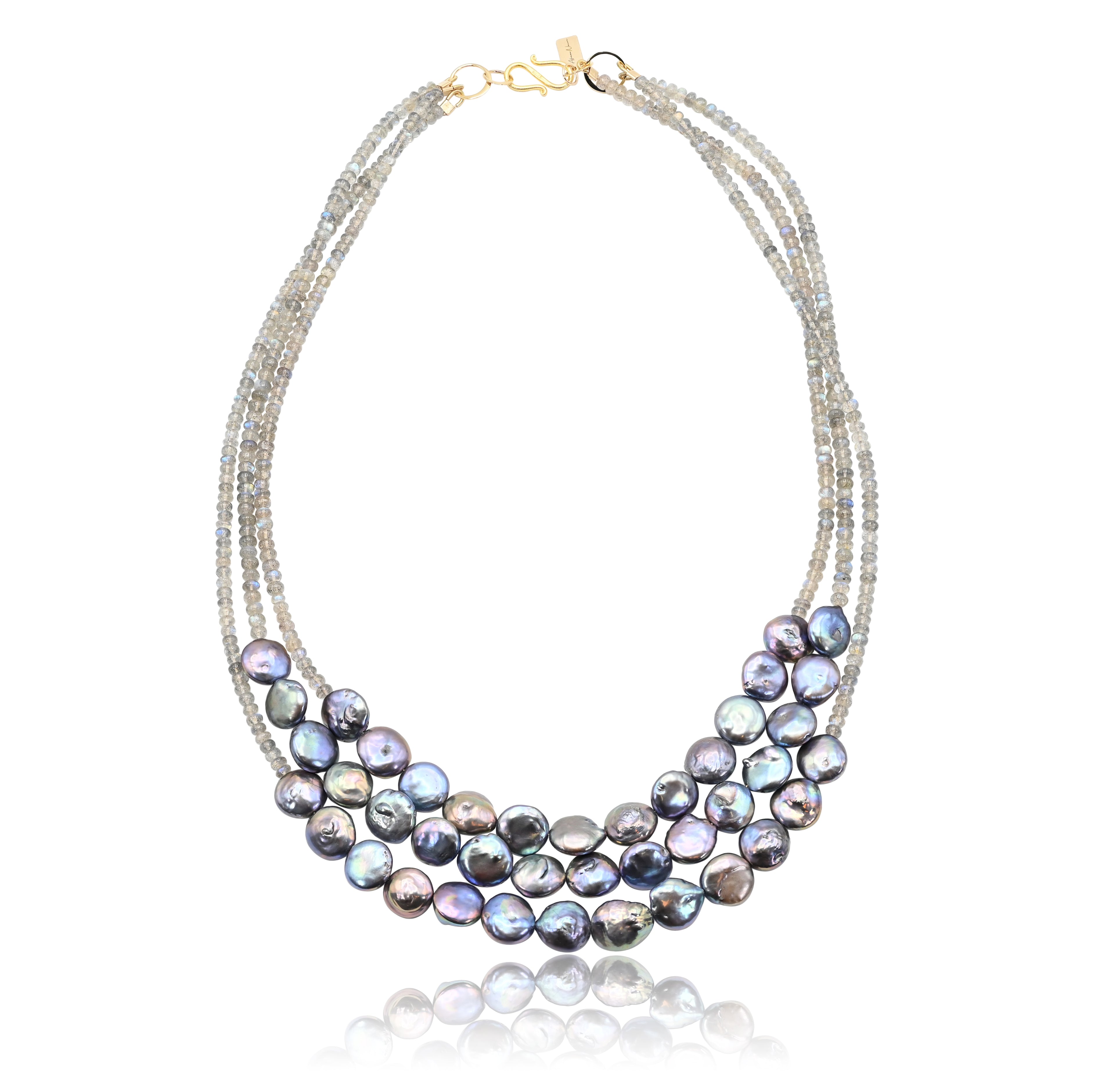 This stunning 3-strand Labradorite and Gray Coin Pearls Statement Necklace is a true masterpiece that embodies elegance and sophistication. Each strand is meticulously crafted with enchanting labradorite gemstones, known for their mesmerizing play of colors and iridescent glow. The gray coin pearls add a touch of classic charm, with their smooth, flat surfaces reflecting light beautifully. This necklace is designed to make a bold statement, perfect for special occasions or adding a touch of luxury to your everyday attire. With its adjustable clasp, it offers versatility in length, ensuring a perfect fit for any neckline. Elevate your jewelry collection with this exquisite piece that celebrates the harmony of natural beauty and refined craftsmanship.