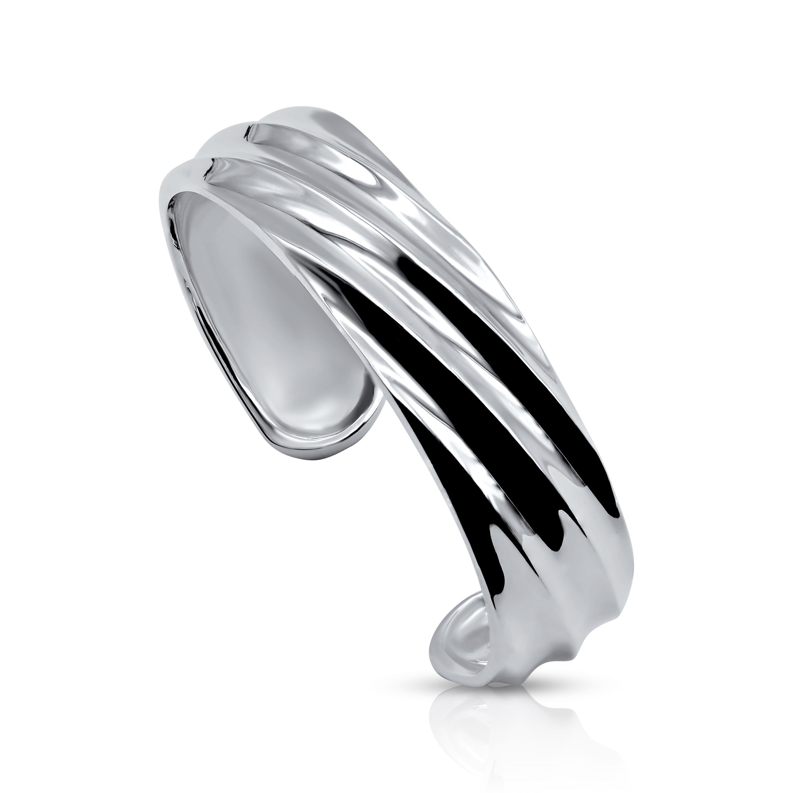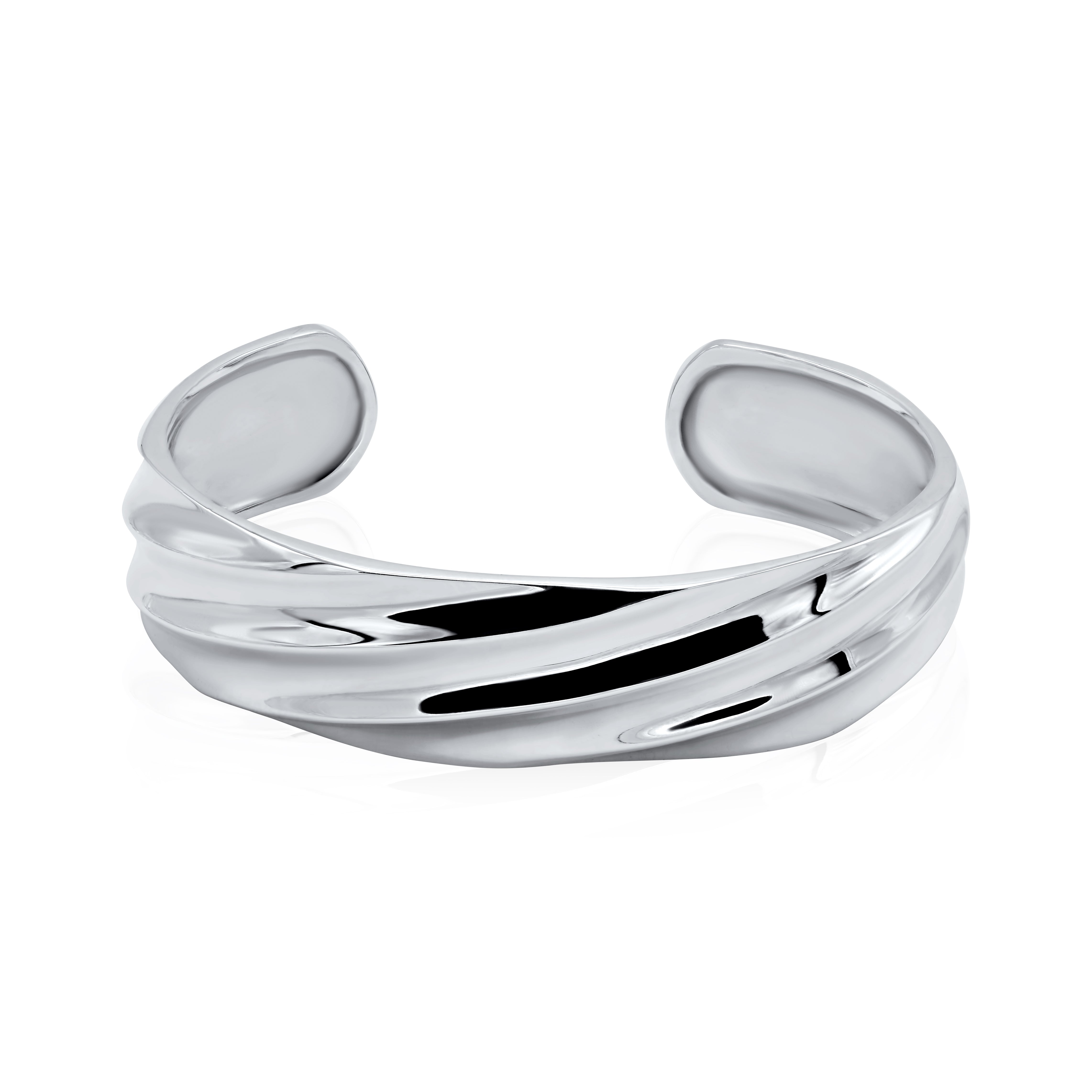 This retro-mod sterling silver open cuff features an oceanic wave cascade with eye-catching dimension, beautifully reflecting the light with its highly polished finish. A smooth interior and opening on the bottom allow this dynamic bracelet to sit comfortably in place. Stack this versatile bangle with other bracelets for a different look each time.