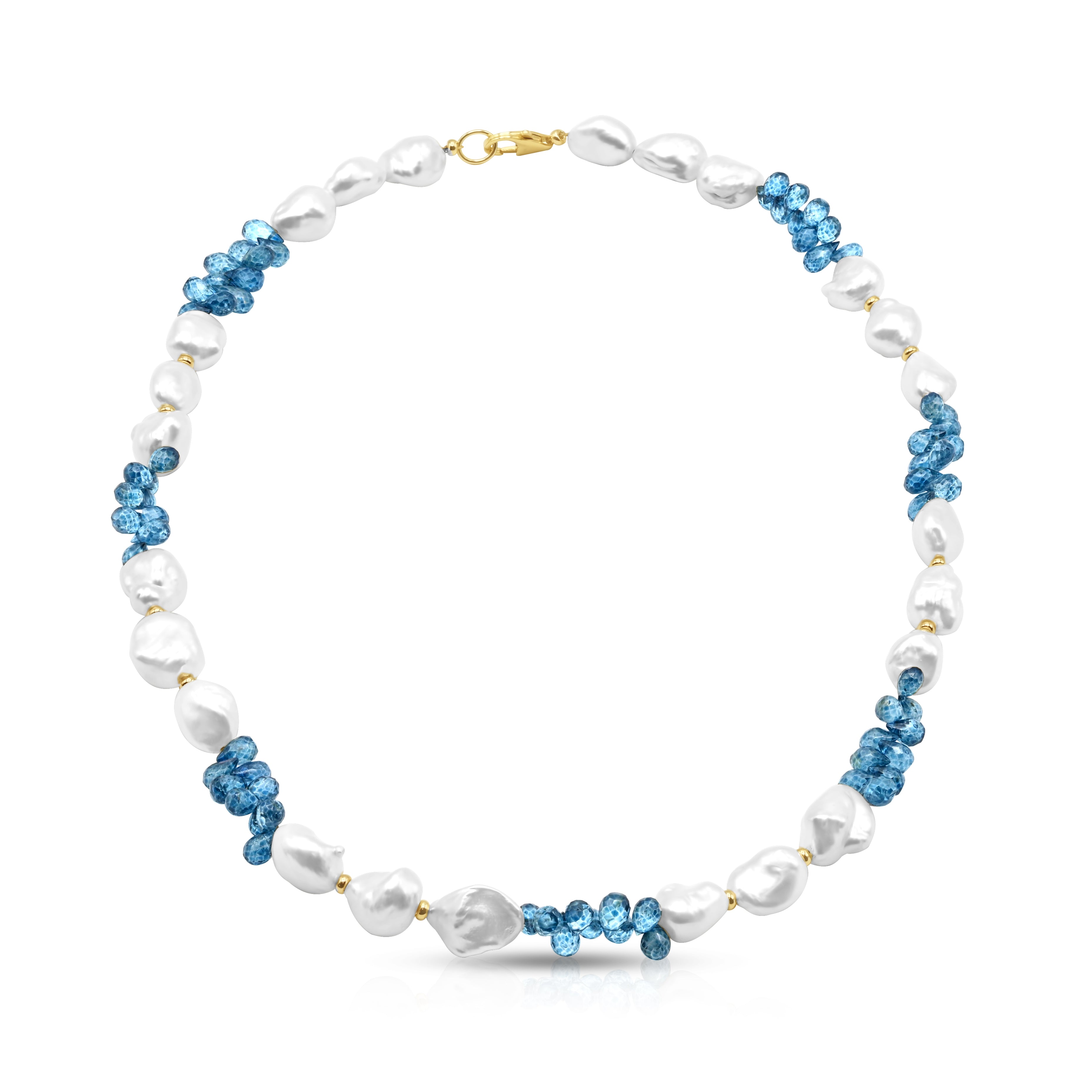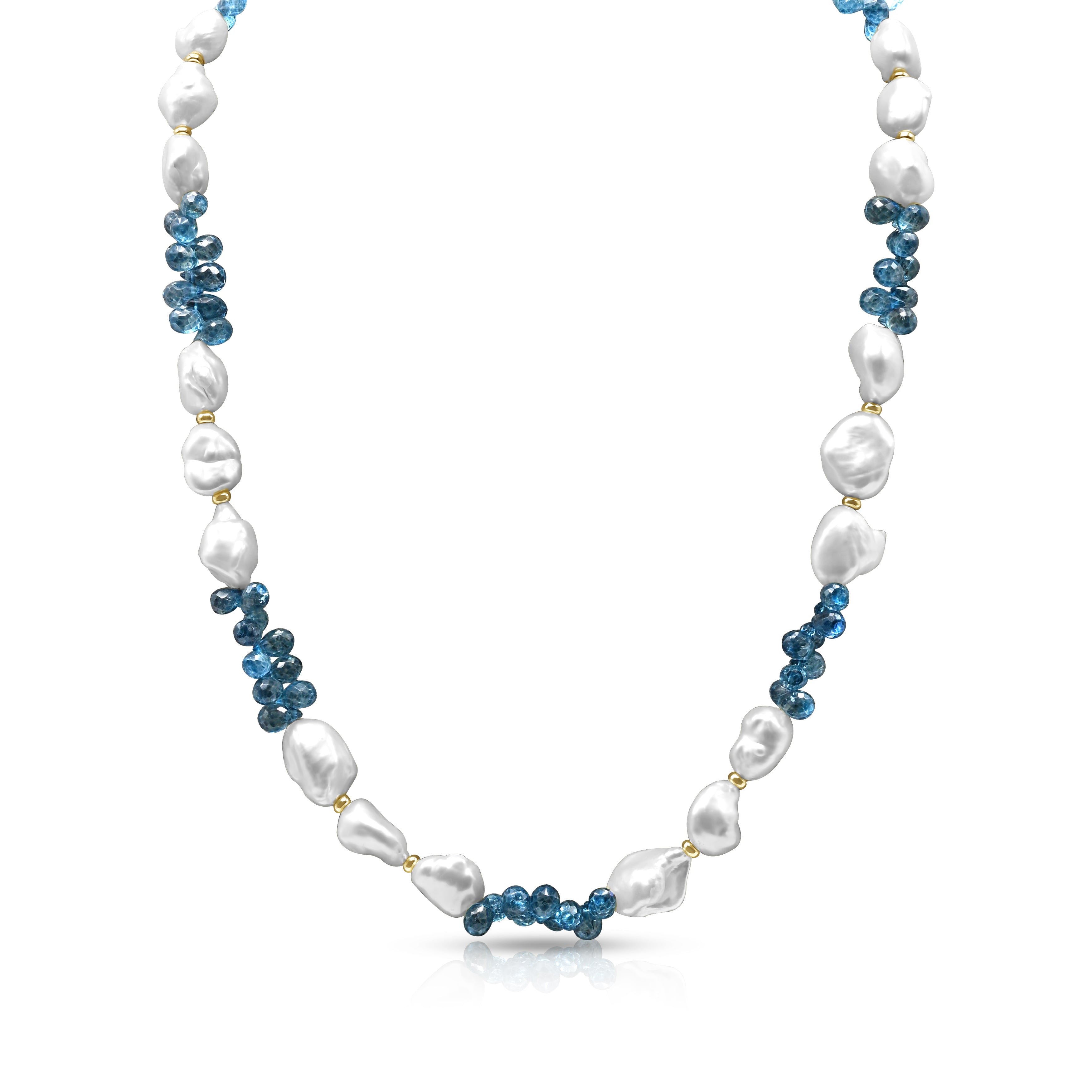 White Pearl & Blue London Topaz Color Block Necklace w/ 14k Yellow Gold Beads & Clasp