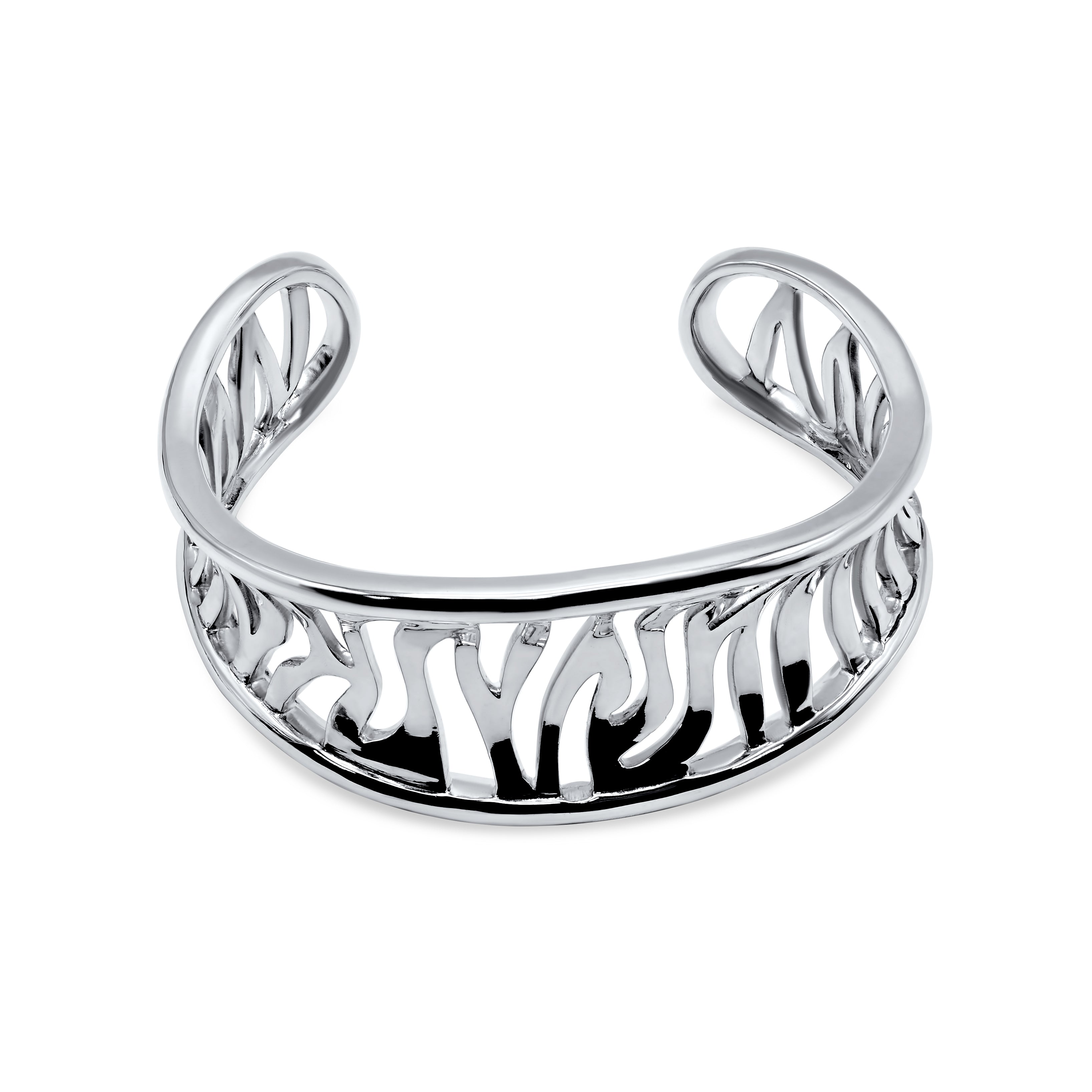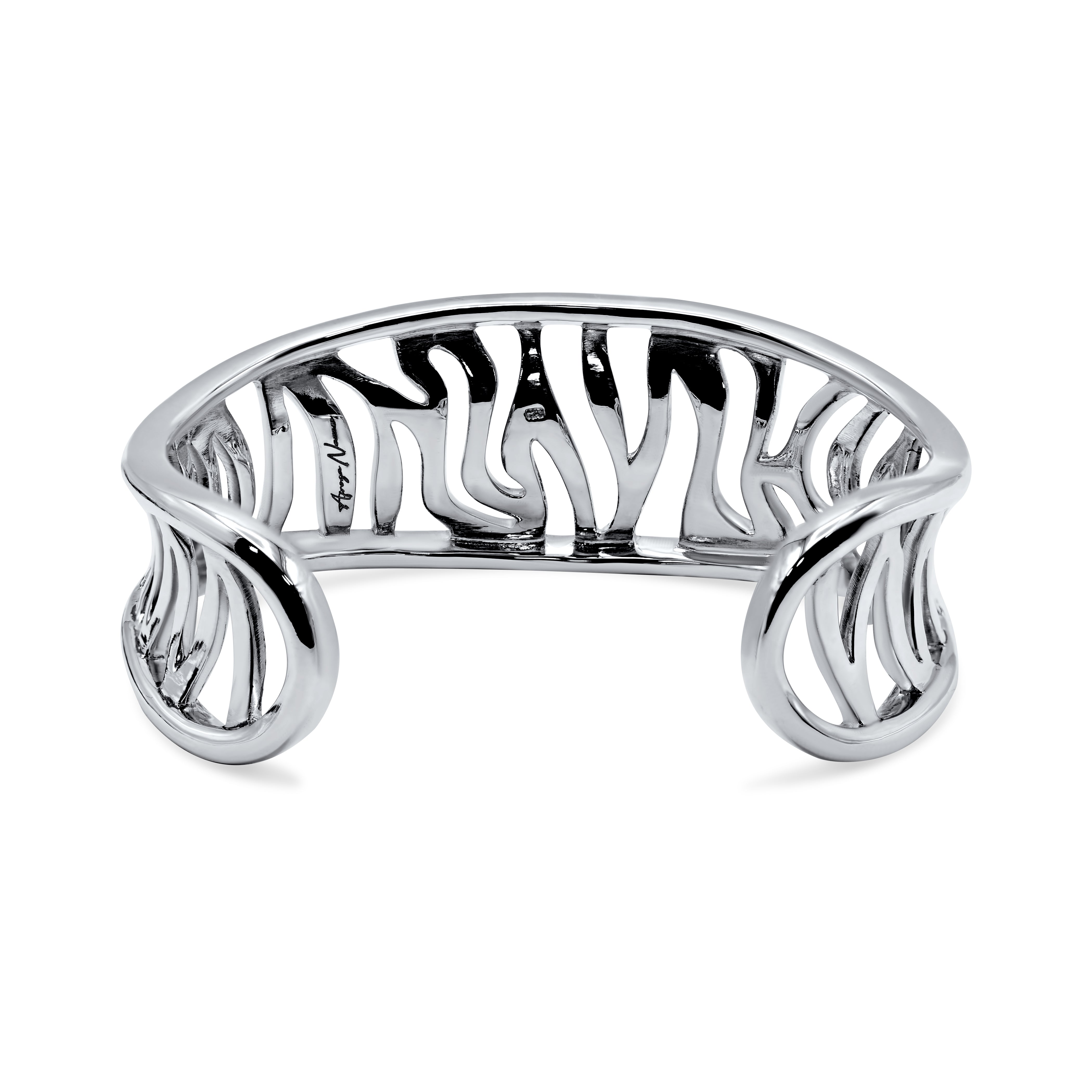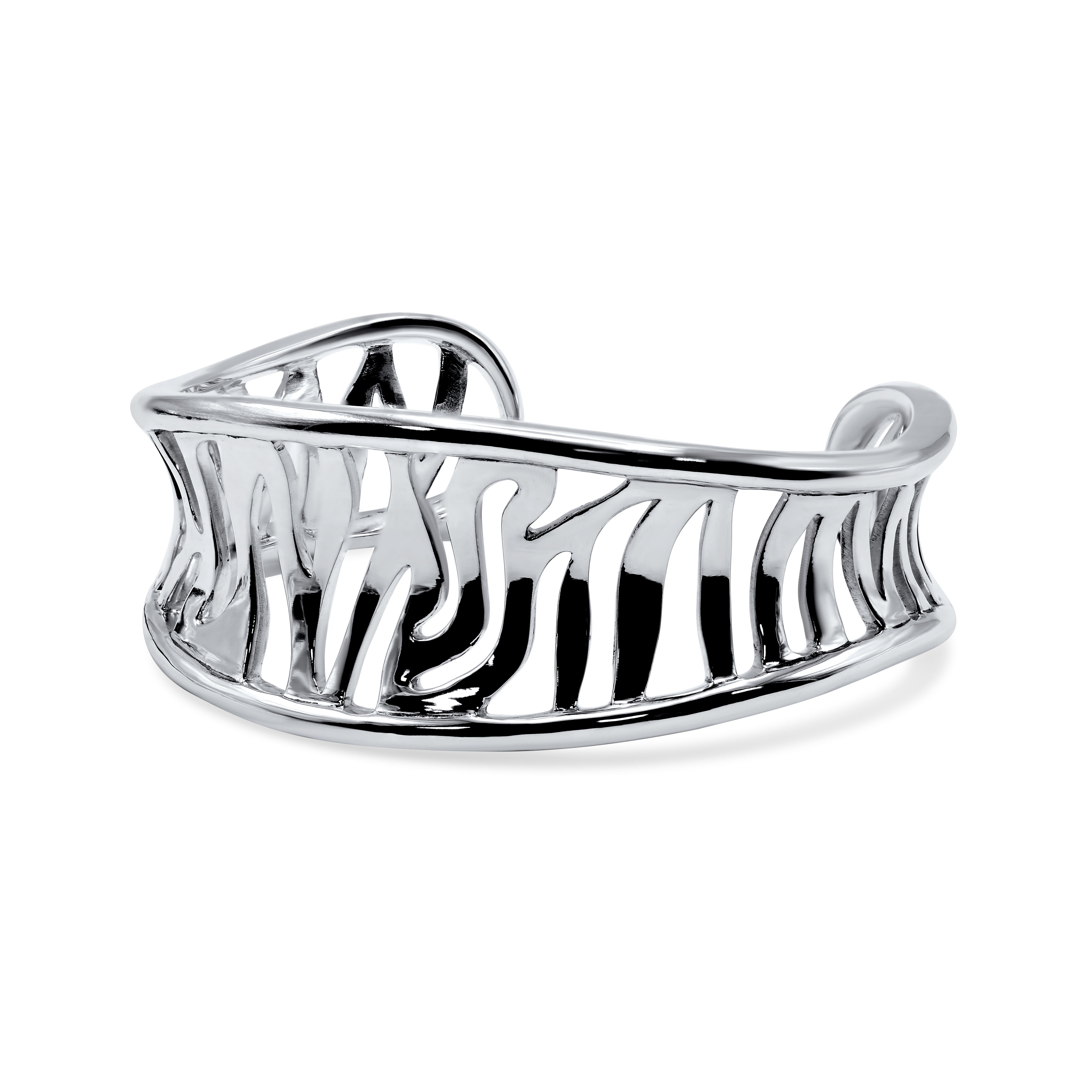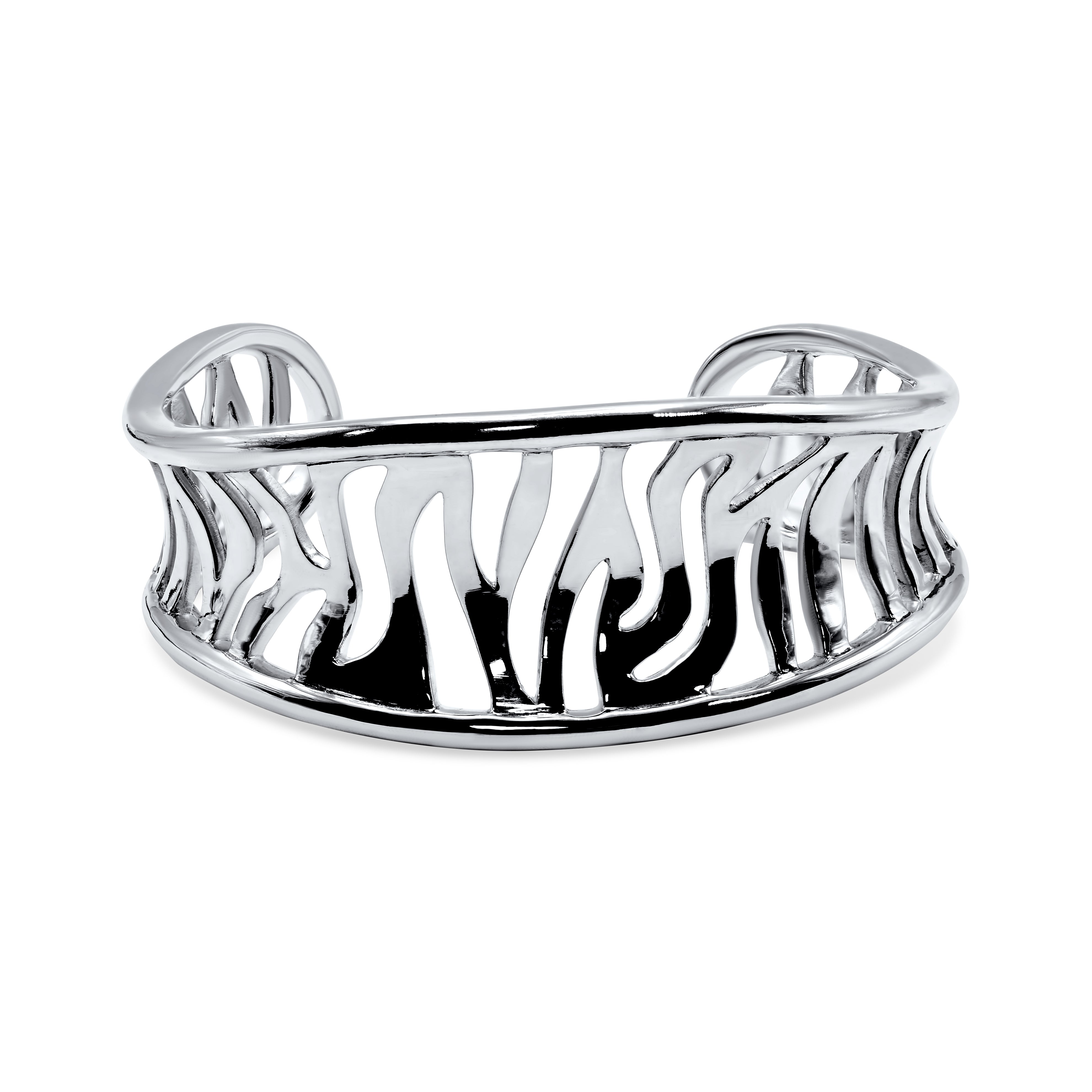 Take the adventures of the safari with you with this striking sterling silver bracelet, exquisitely crafted with an artisan touch and fine detail. A wild zebra striped design with openwork gives this luxe bracelet a vented effect, adding modernity to the classic animal print. The opening on the back allows your wrist to slip through.